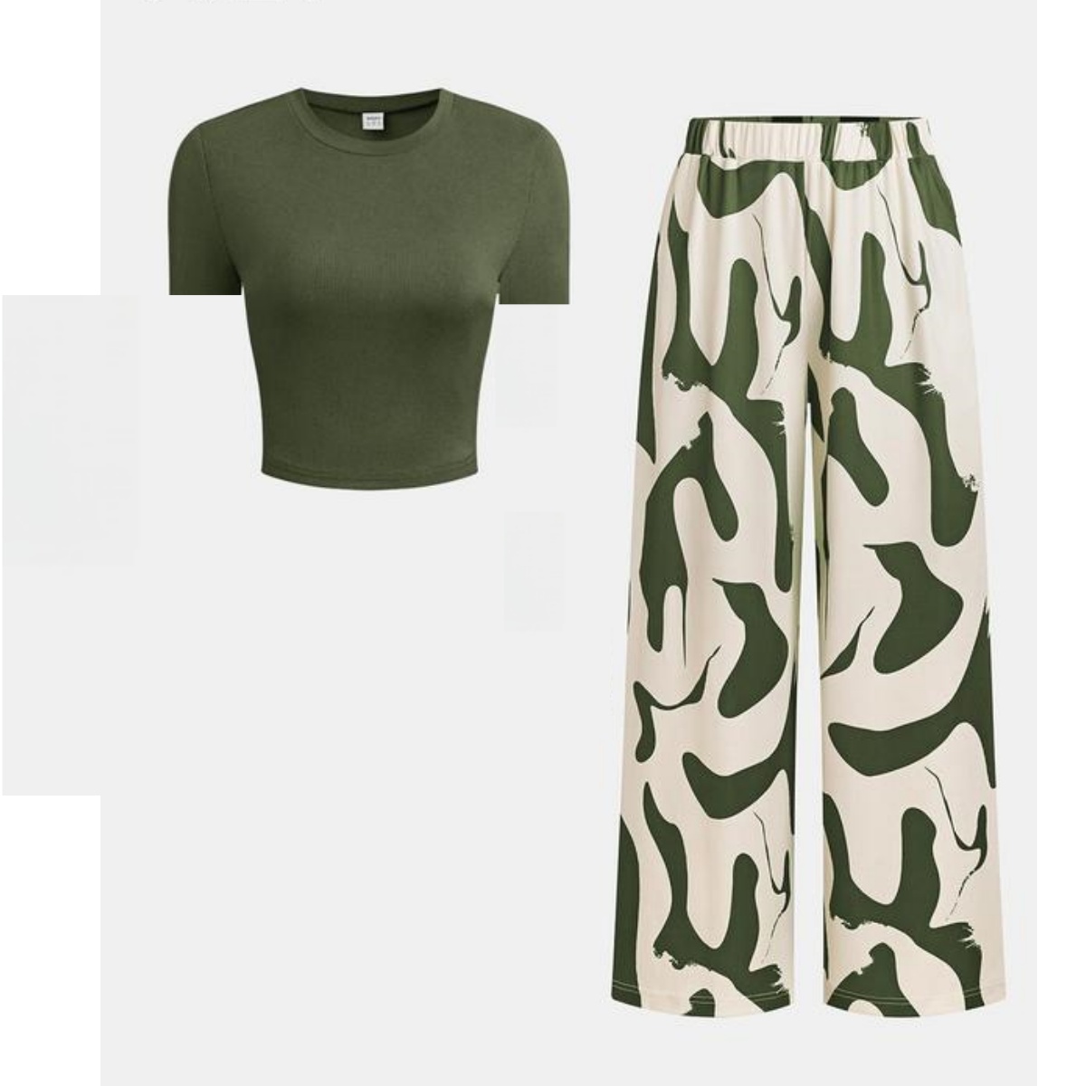 • Solid Tee & Graphic Elastic Waist Pants Set, Casual Round Neck Long Sleeve Top & High Waist Trousers, 2024 Women's Daily Wear for Fall & Winter, Fall & Winter Outfits