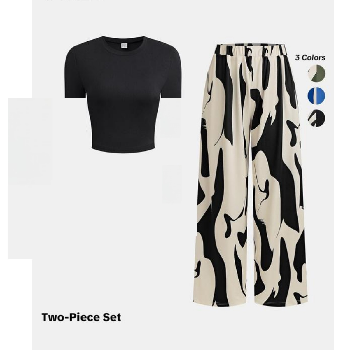 • Solid Tee & Graphic Elastic Waist Pants Set, Casual Round Neck Long Sleeve Top & High Waist Trousers, 2026 Women's Daily Wear for Fall & Winter, Fall & Winter Outfits