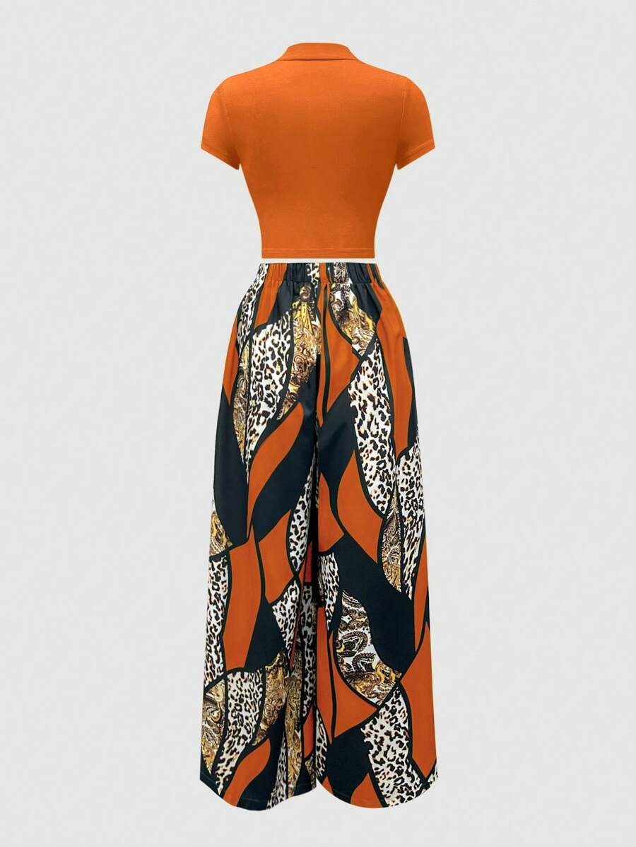 Women's Solid Mock Neck Crop Tee & Leopard Print Plicated Pants Two-piece Set, Casual Fashion Cozy Short Sleeve Top & High Waist Wide Leg Trousers for Daily Outdoor Wear, Ladies Lounge Clothes for All Seasons, Womenswear