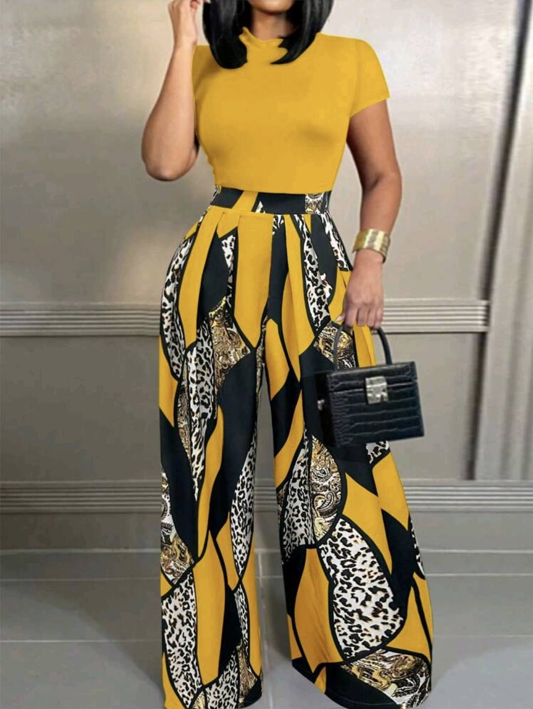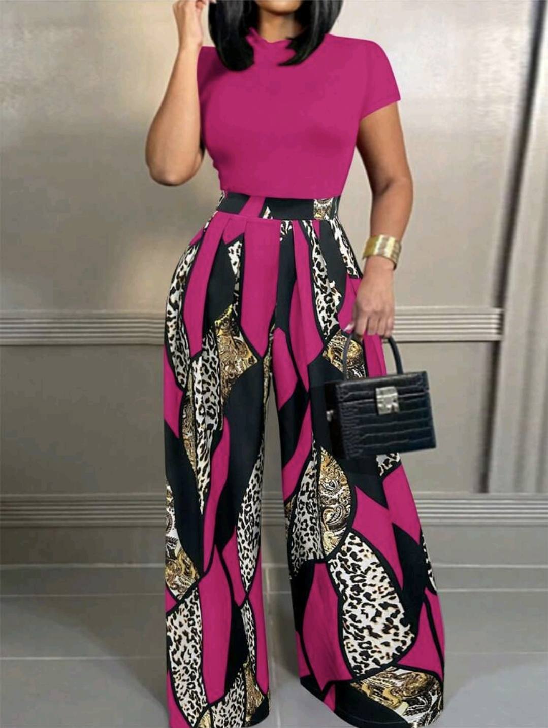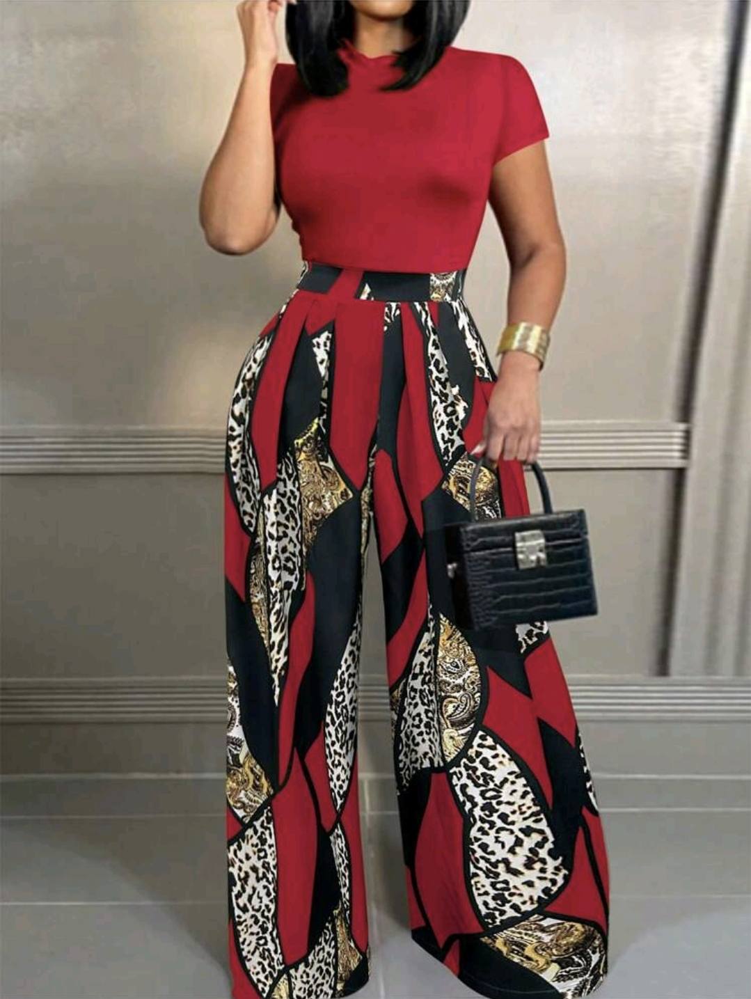 • Women's Solid Mock Neck Crop Tee & Leopard Print Plicated Pants Two-piece Set, Casual Fashion Cozy Short Sleeve Top & High Waist Wide Leg Trousers for Daily Outdoor Wear, Ladies Lounge Clothes for All Seasons, Womenswear