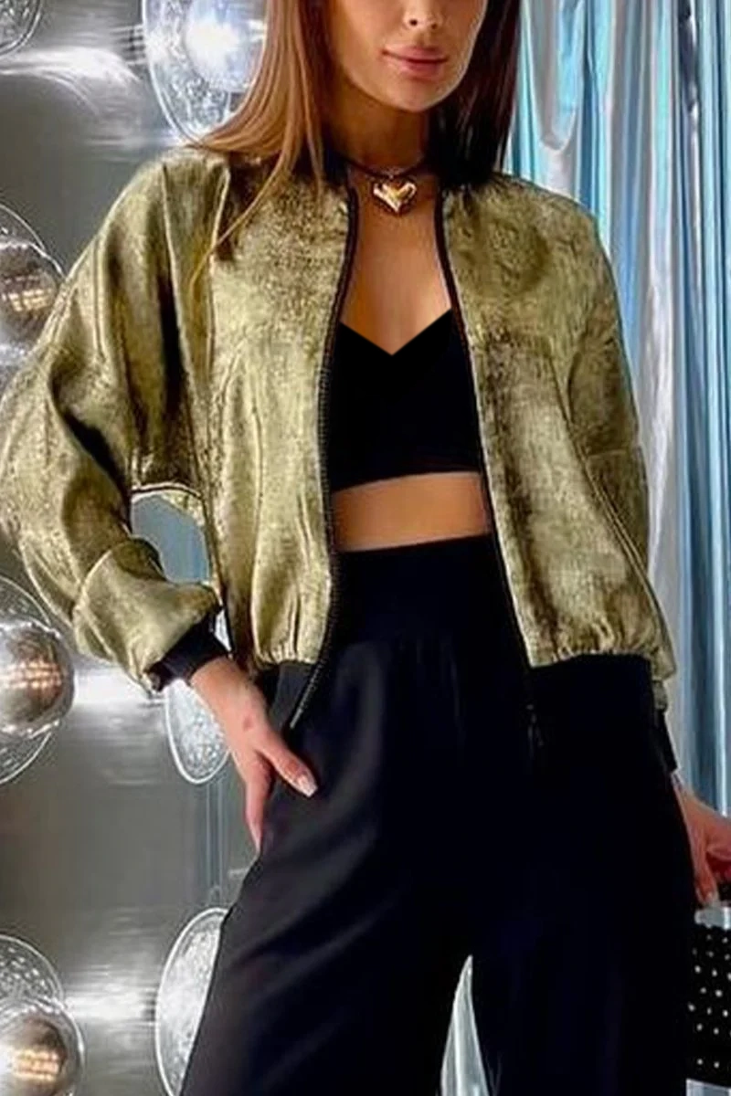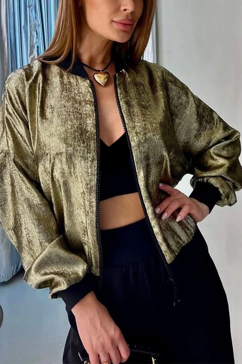 Women's Casual Round Neck Zippered Gold-stamped Jacket