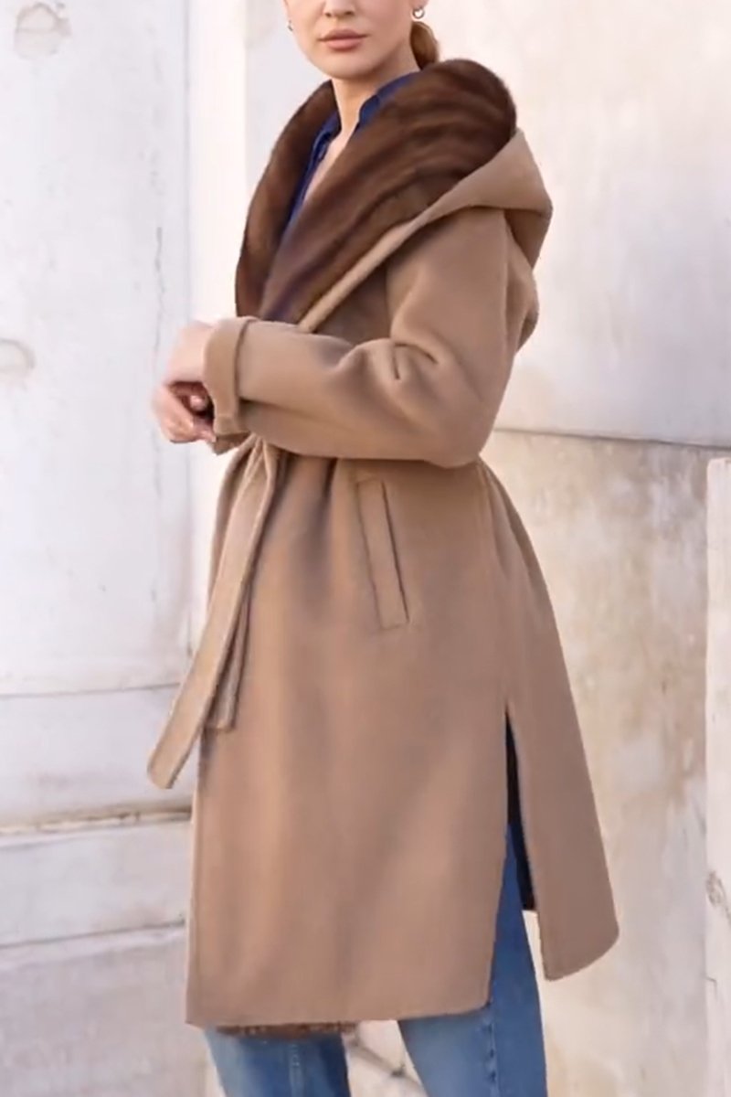 Women's Gorgeous Fur Collar Hooded Belted Gauze Slit Woolen Long Coat