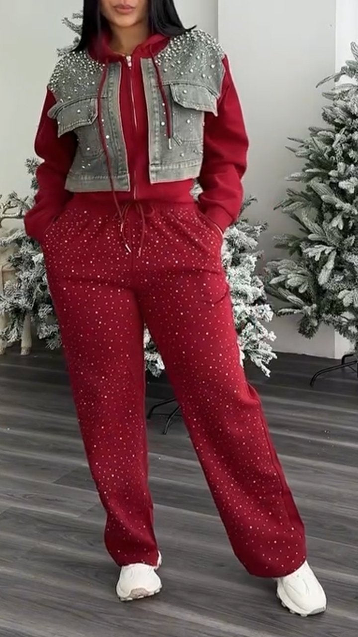 Women's Hooded Denim Patchwork Rhinestone Casual Suit