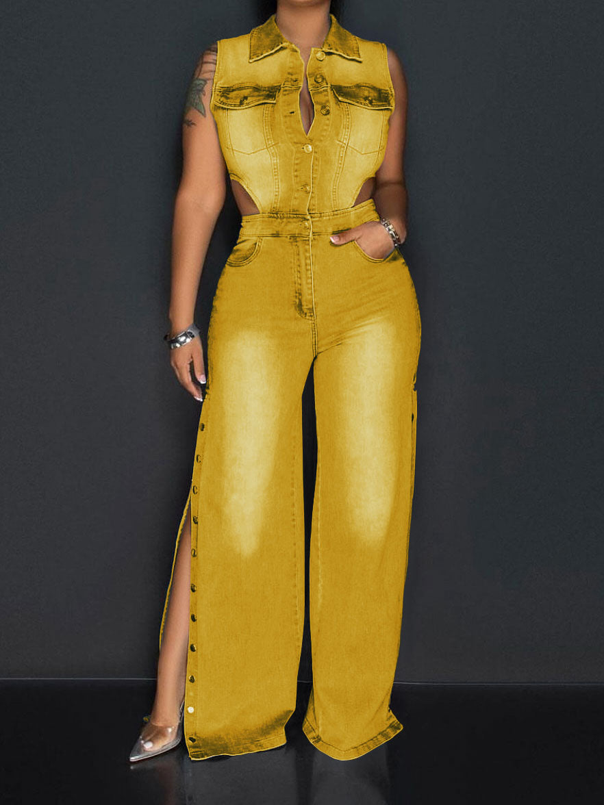 Women's Lapel Hollow Slit Denim Jumpsuit