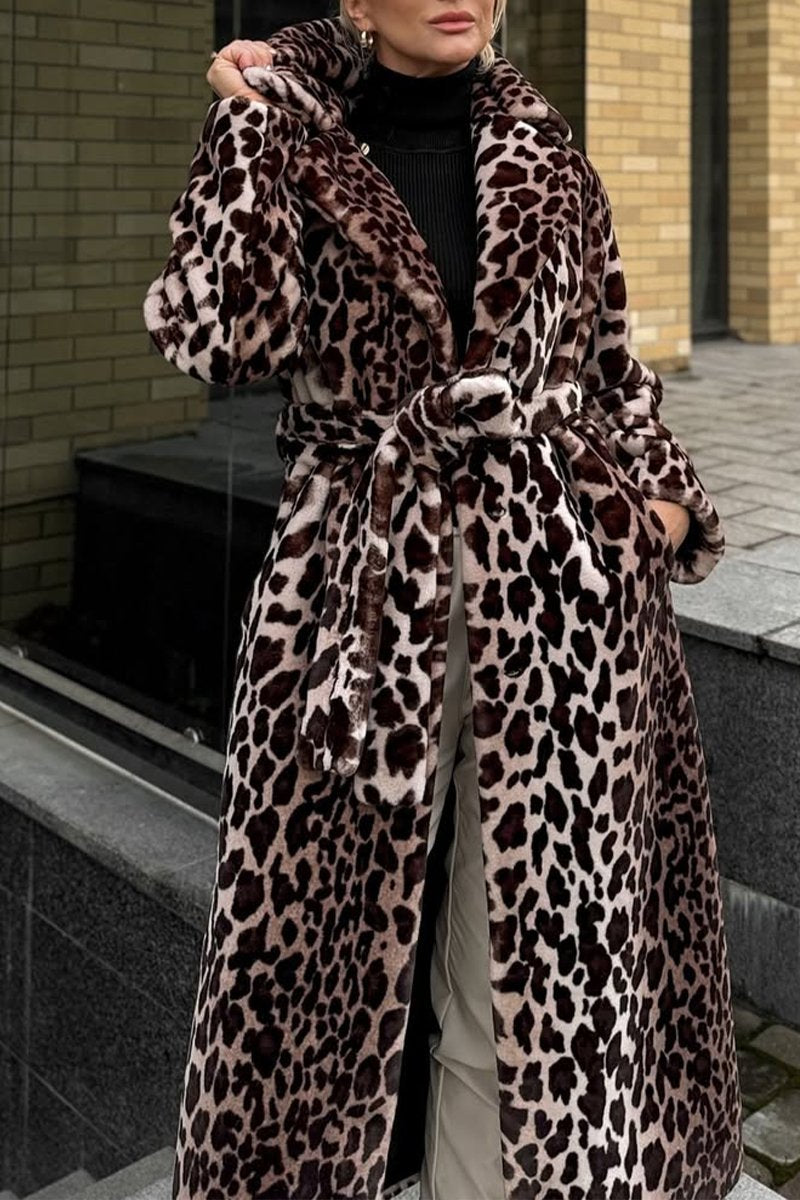Women's Lapel Leopard Print Fur Long Coat
