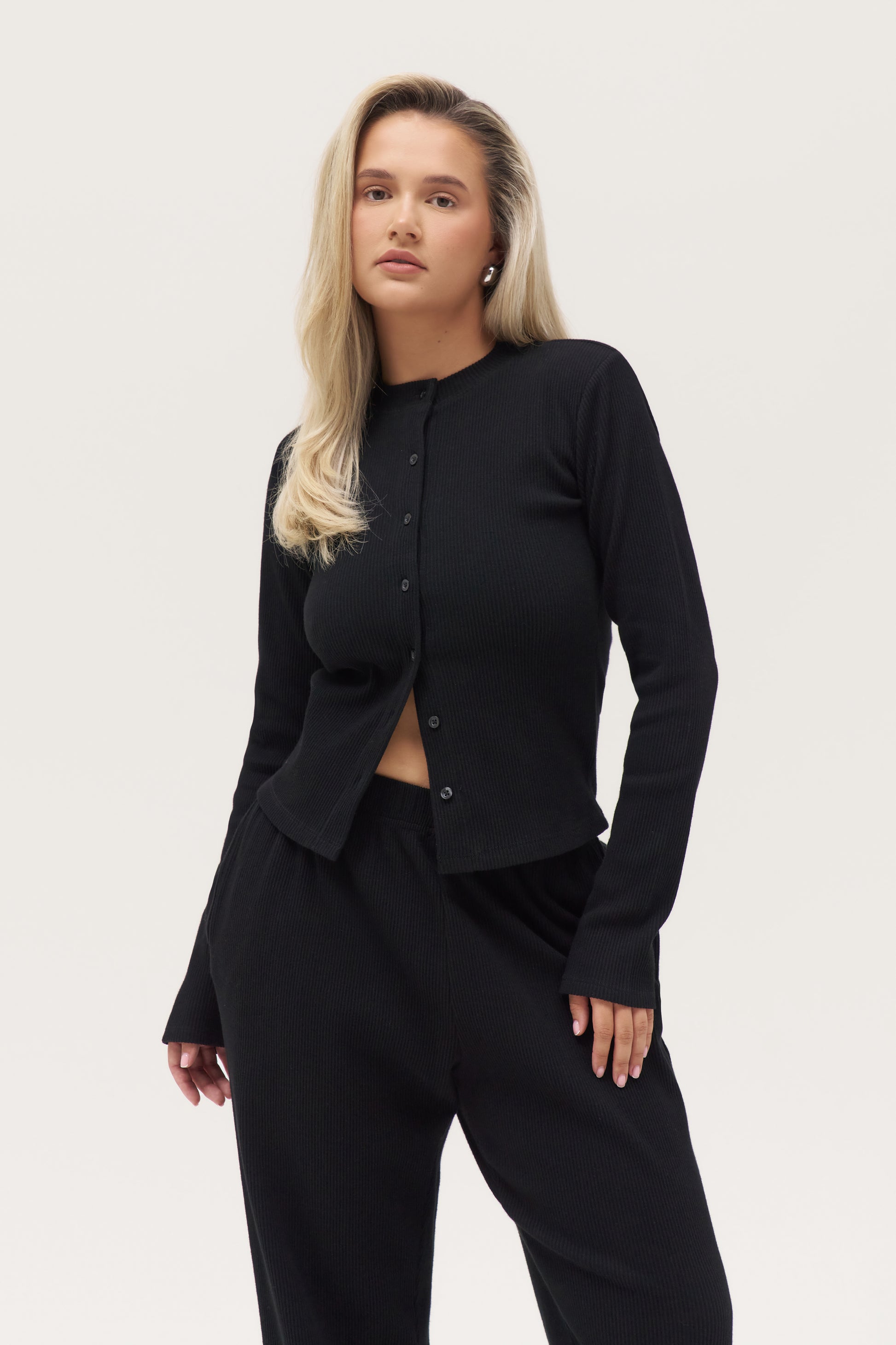 • Two-piece Set Women's Solid Button Front Ribbed Crop Top & Elastic Waist Pants, Casual Long Sleeve Round Neck Top & Trousers 2 Piece Set for Spring & Fall, Women's Clothes for Daily Wear