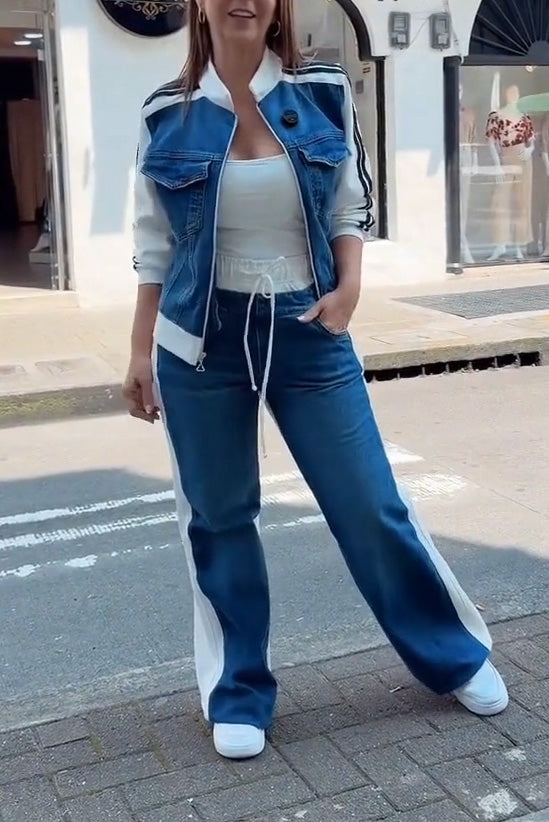 Women's Stylish Denim Stitched Zippered Long Sleeve Two-piece Set