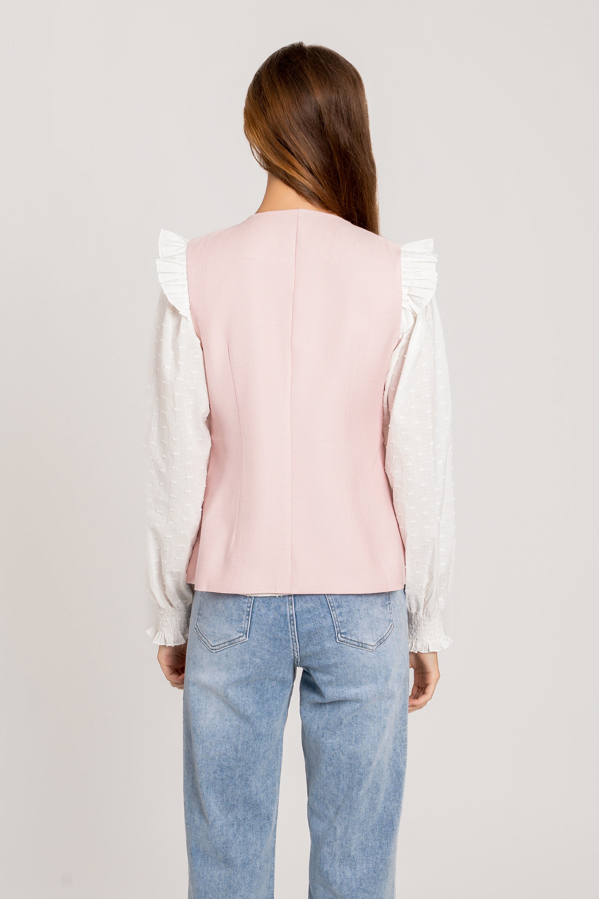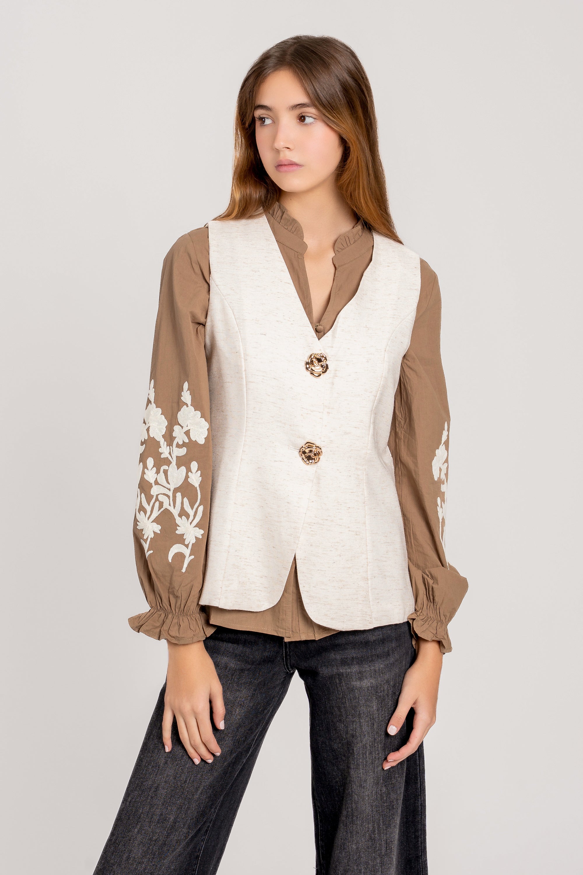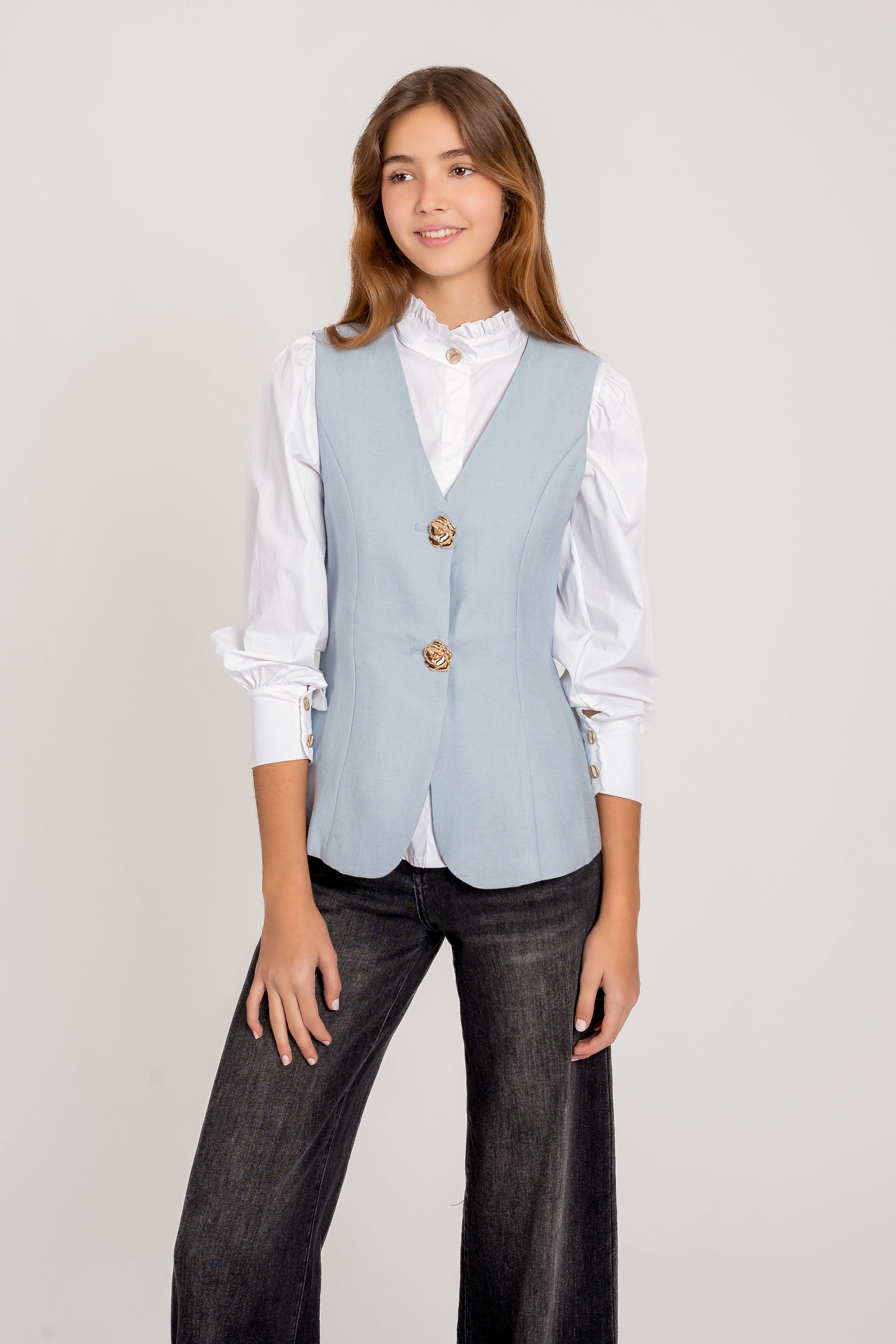 Chaleco con escote pico y manga sisa. Bajo redondo. Cierre frontal con botón metálico en relieve. Altura modelo 180 cm. Talla S/M.