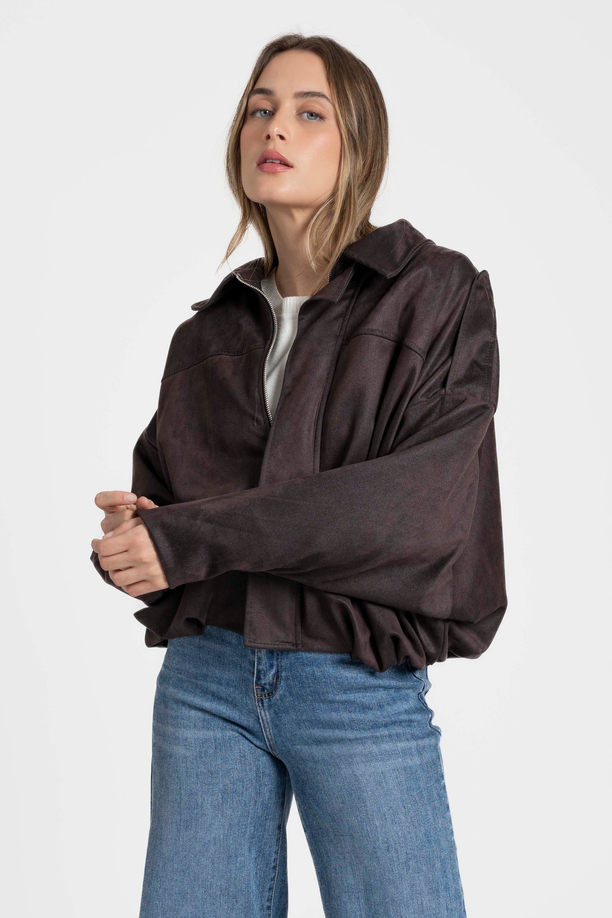Tejido efecto ante. Cuello solapa. Manga larga. Cierre cremallera.