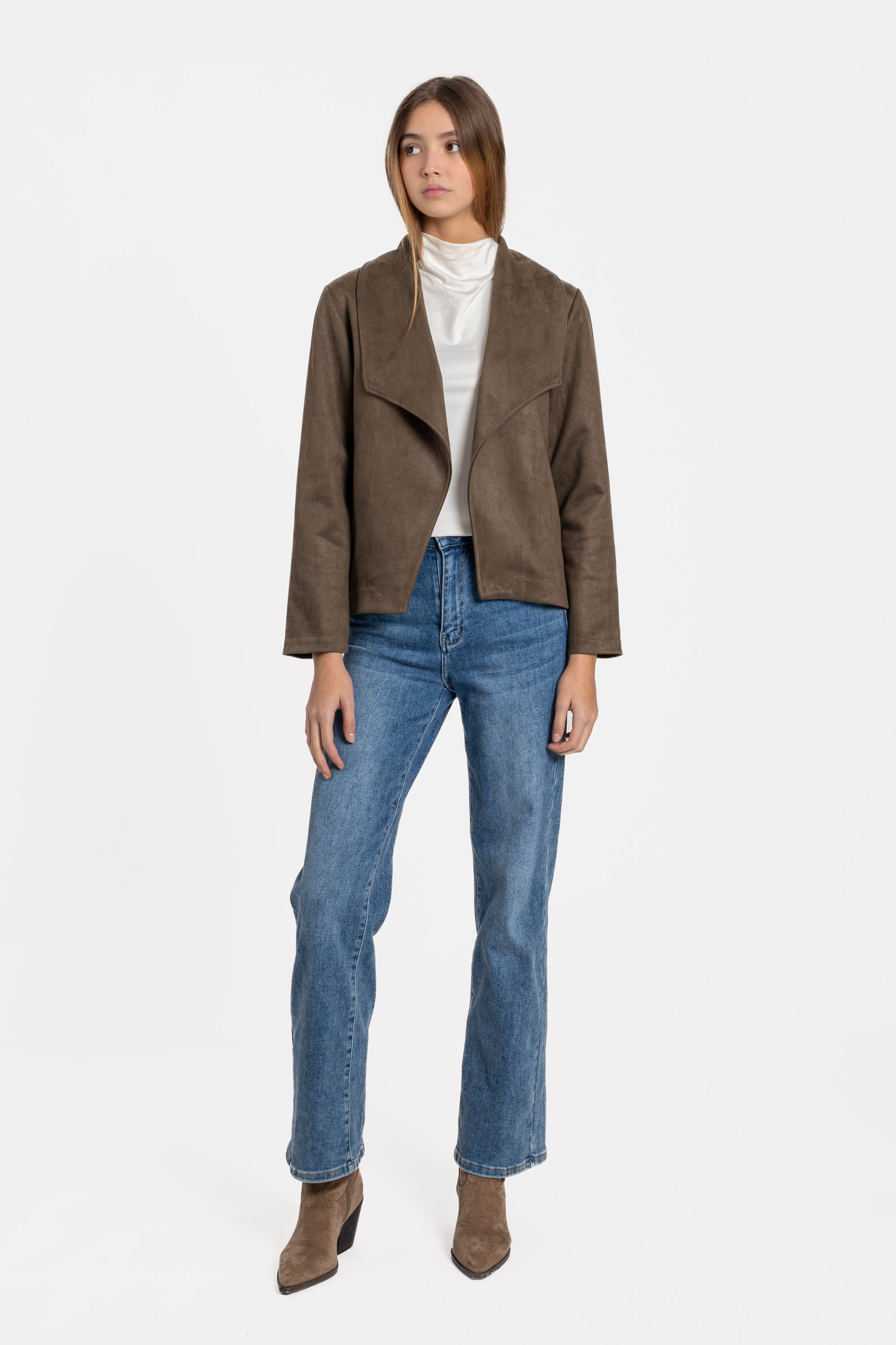 Tejido efecto ante. Cuello solapa. Manga larga. Diseño abierto. Altura modelo 170 cm. Talla S.
