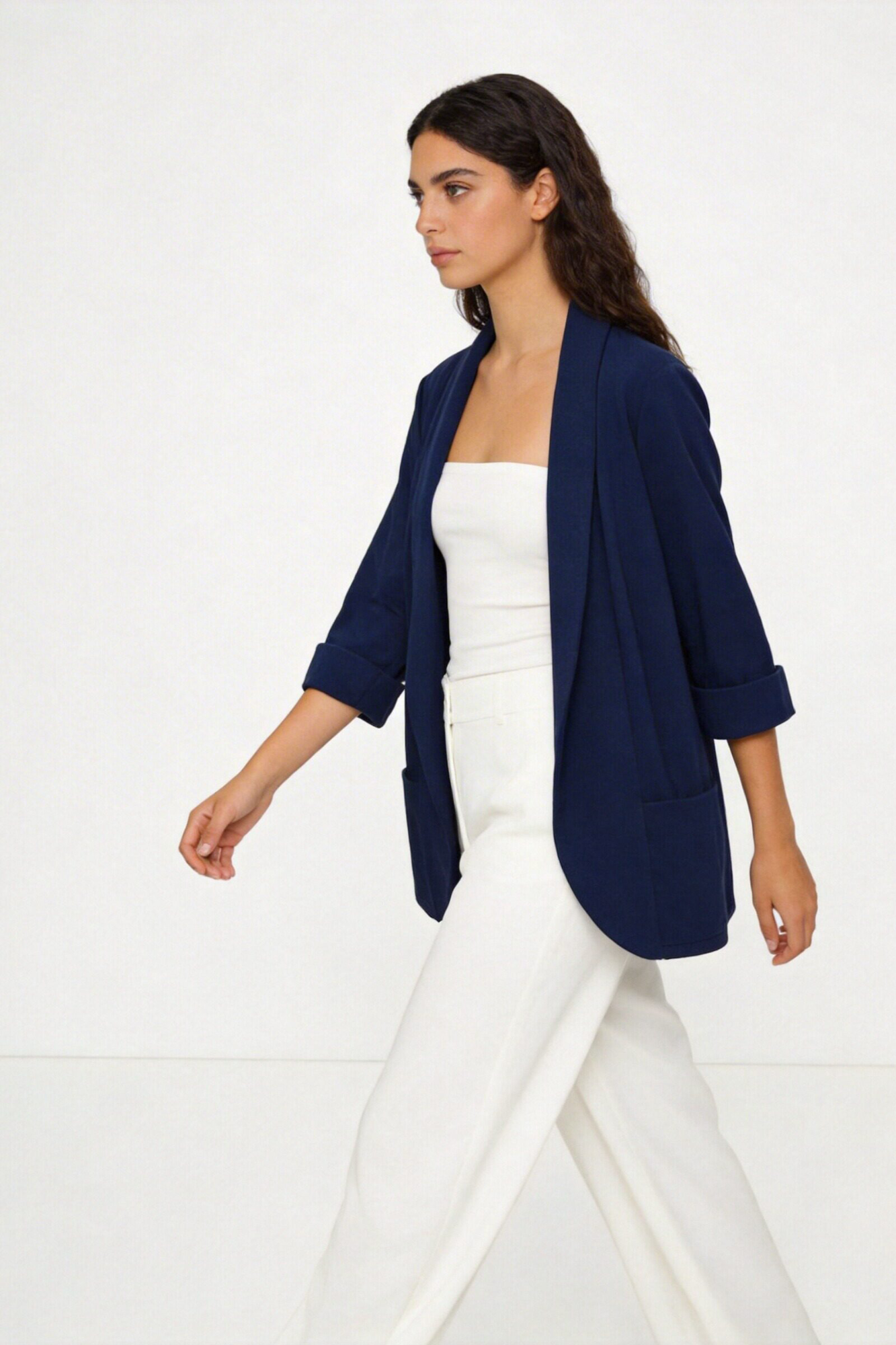 Tejido fluido. Diseño recto. Cuello solapa. Solapas con muesca. Manga 3/4. Puño remangado. Bolsillos laterales.