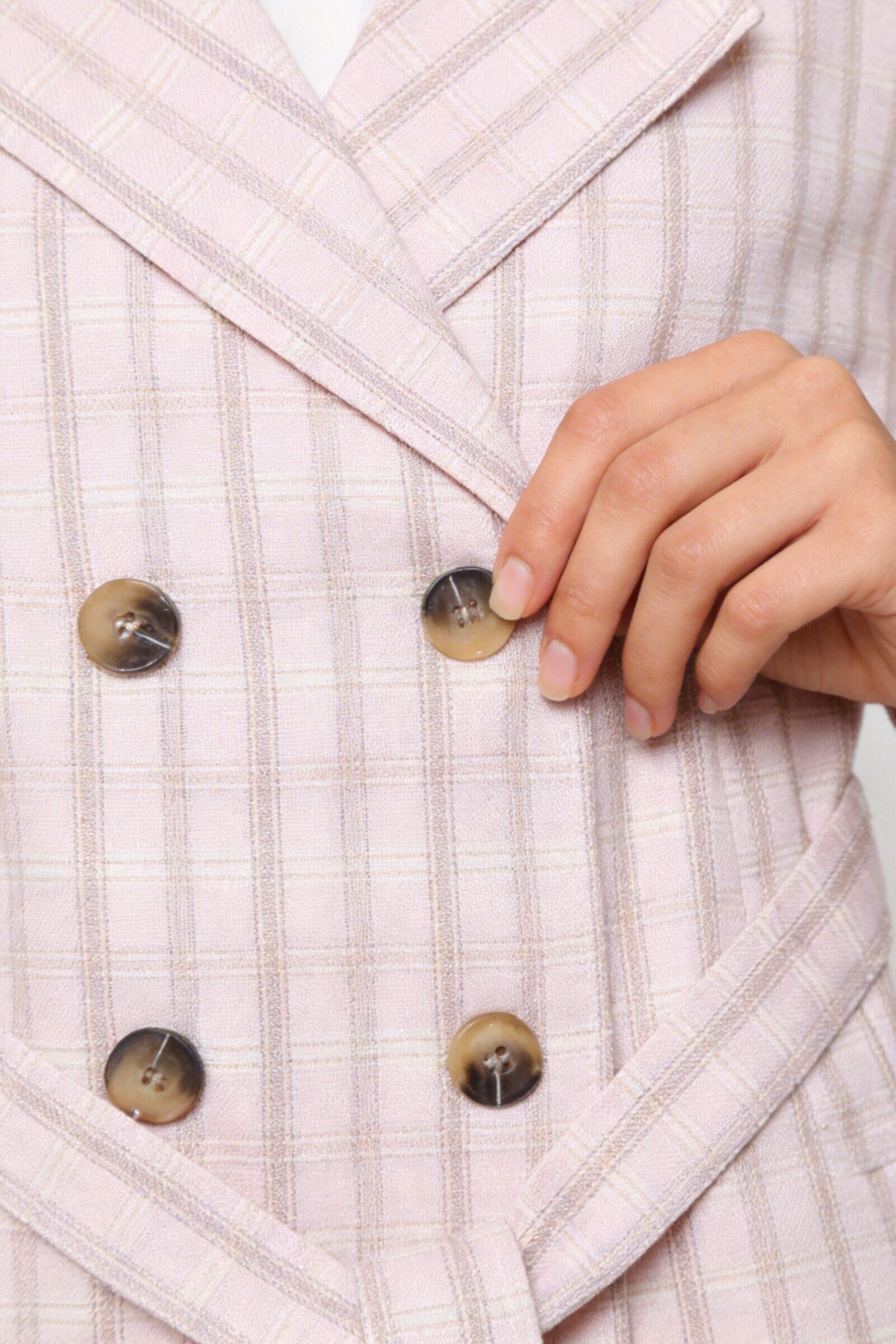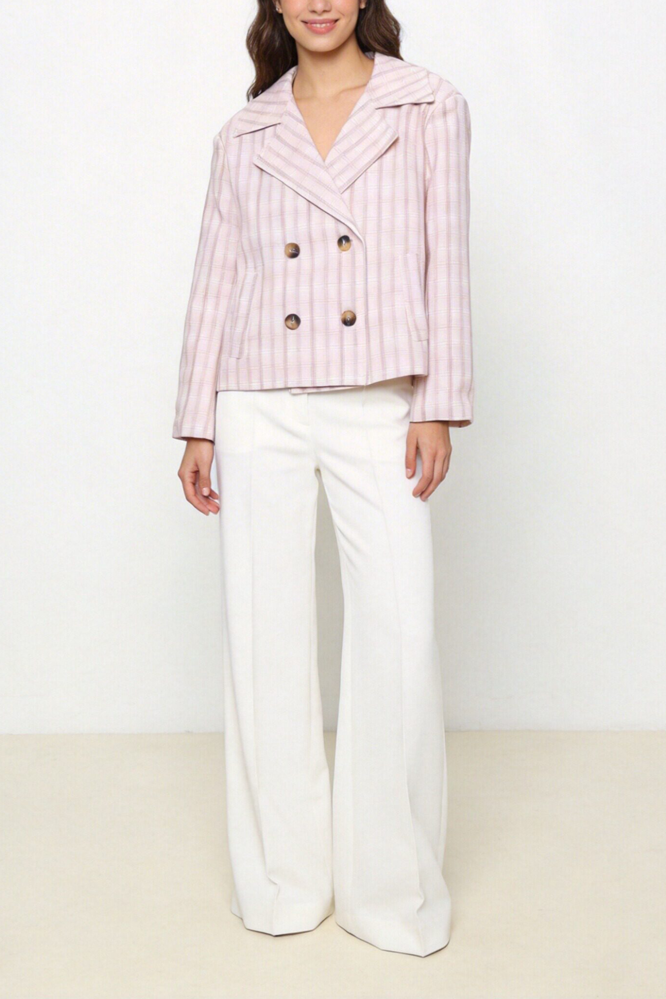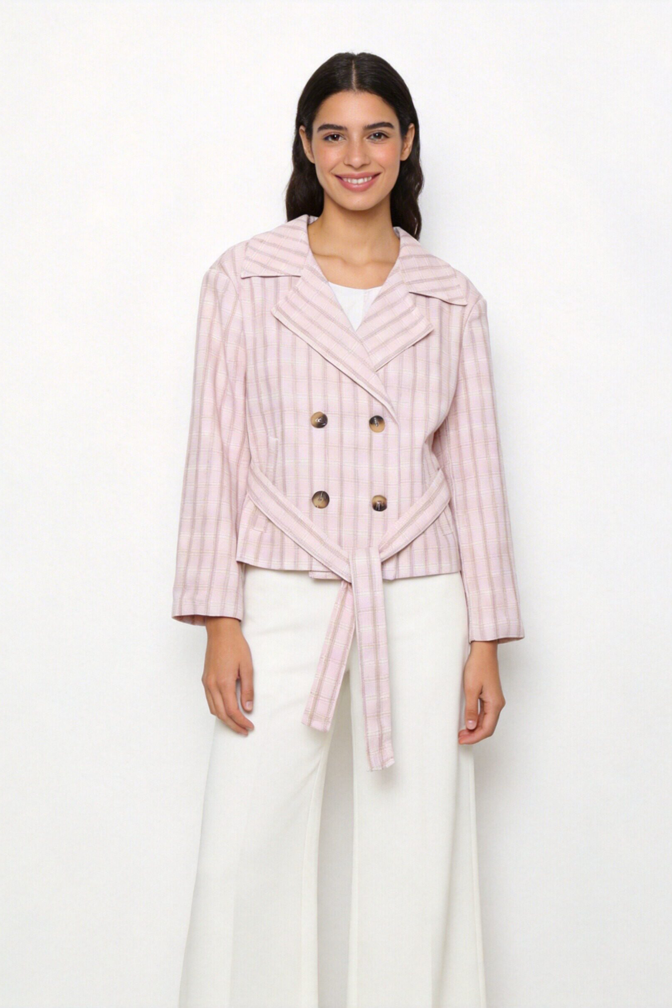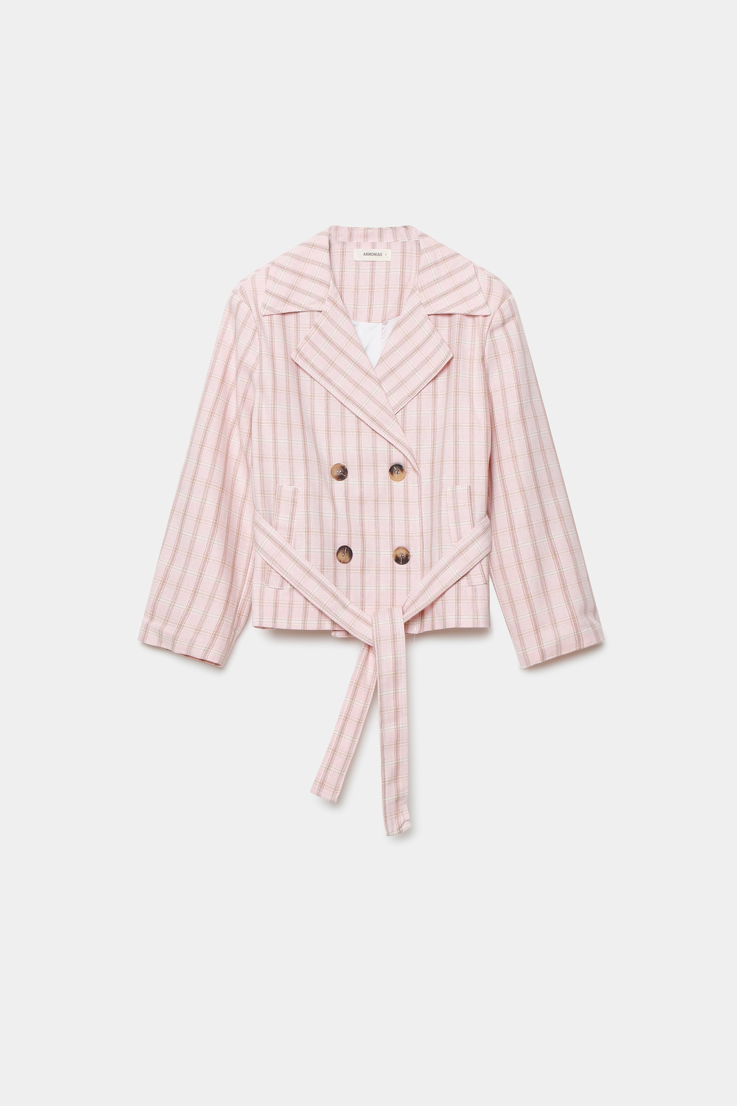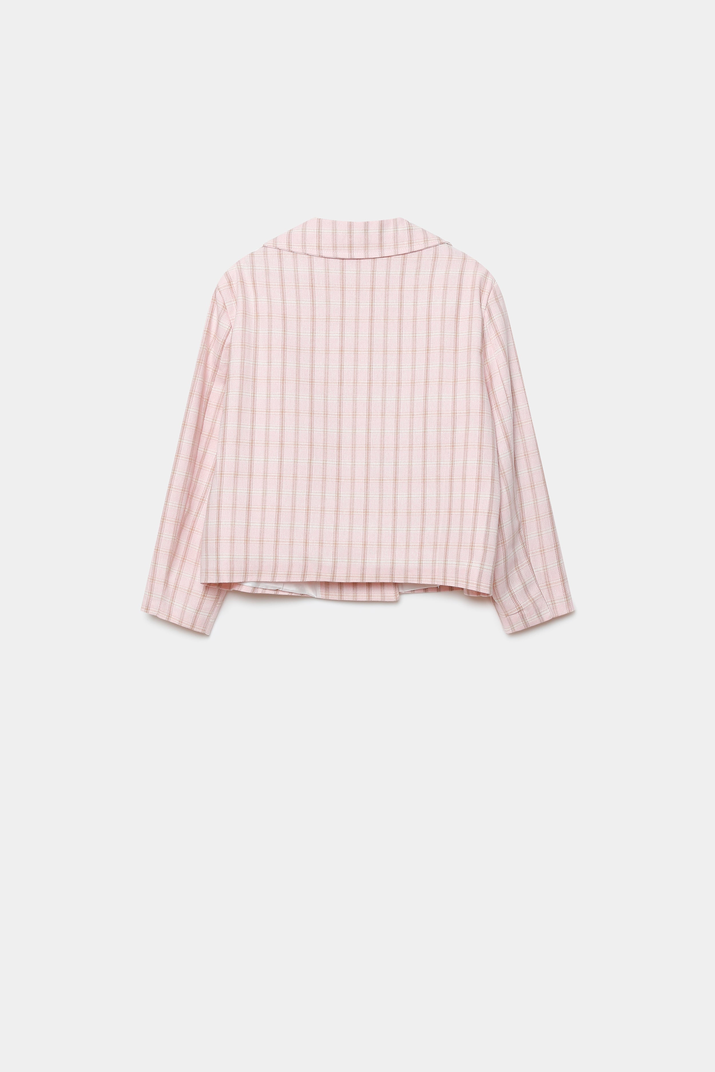 Tejido mezcla de algodón. Cropped. Estampado de cuadros. Diseño cruzado. Cierre con botones. Cinturón del mismo tejido. Manga larga.