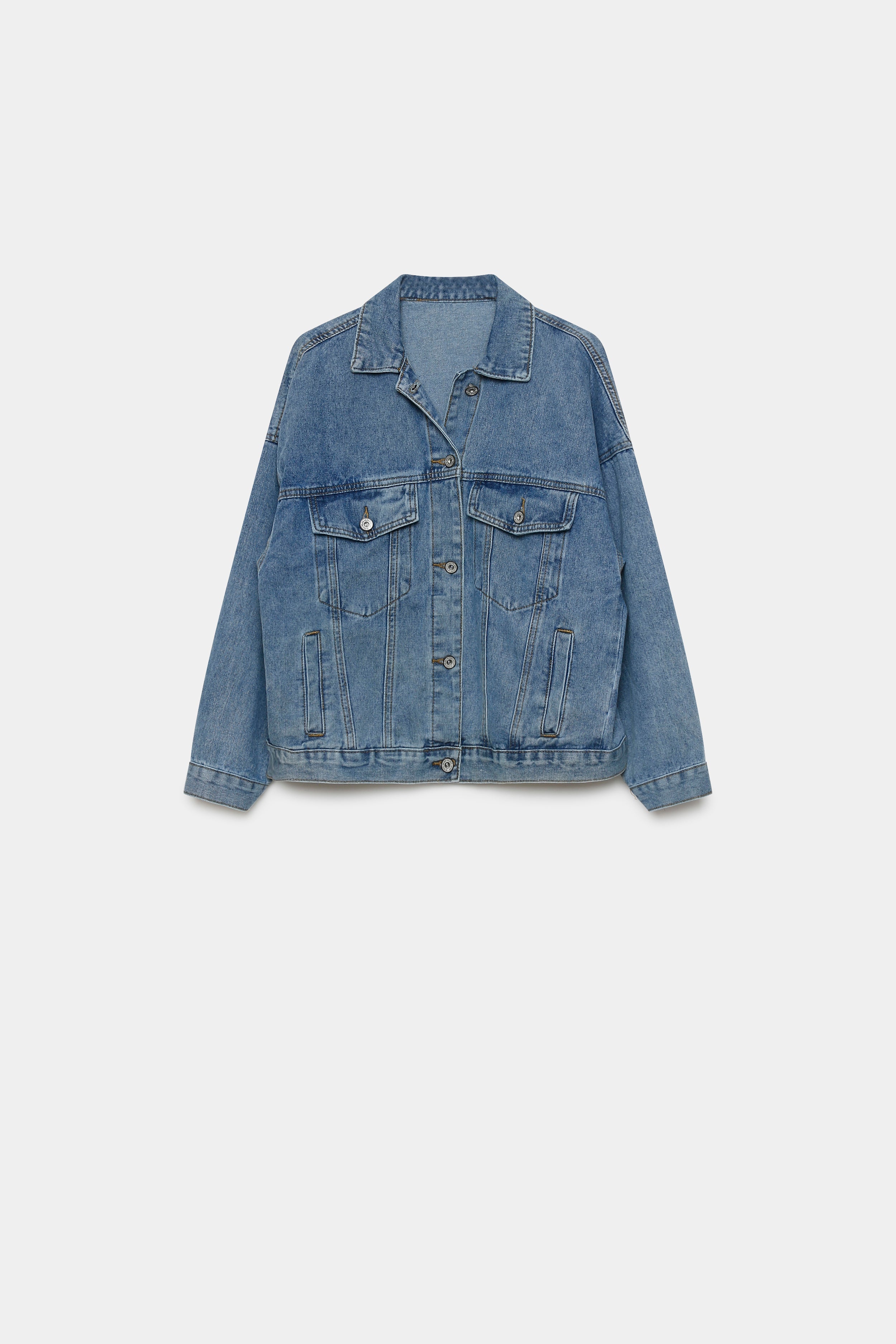 Tejido vaquero. Cuello solapa. Manga larga. Cierre con botones metálicos. Bolsillos con solapa y bolsillos laterales. Largo 65cm.