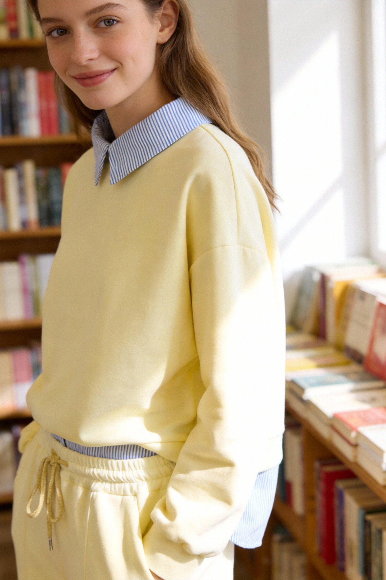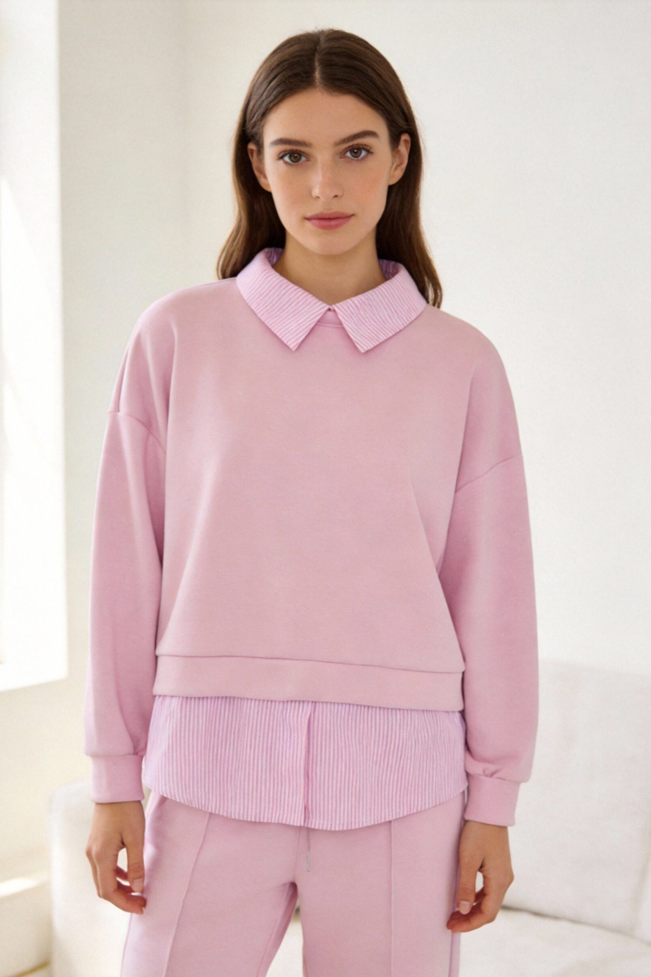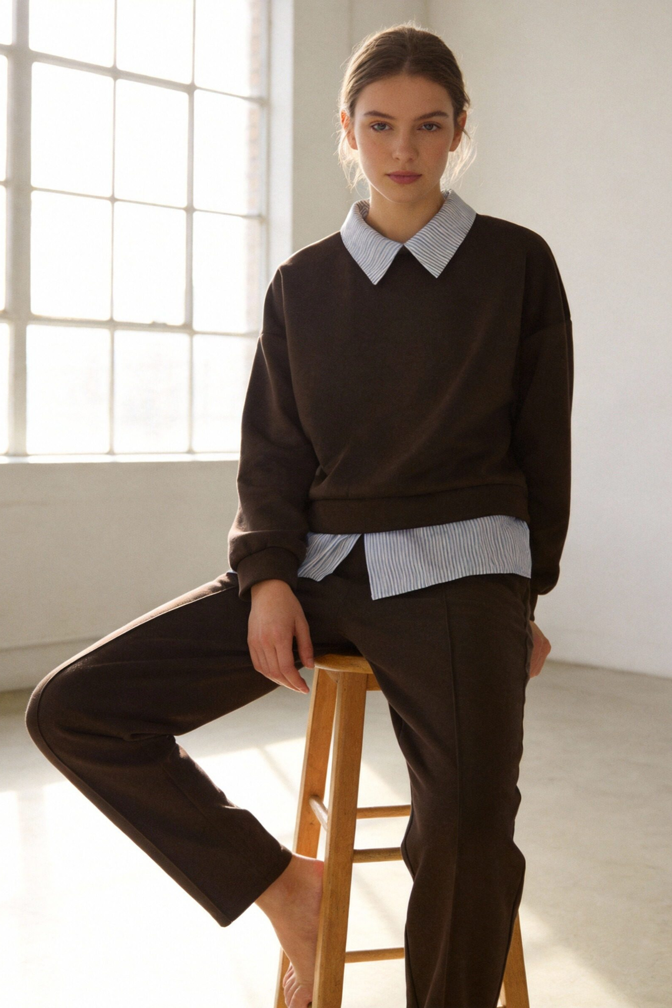 Tejido efecto felpa. Cuello redondo con solapa combinada. Manga larga. Pantalón de tiro alto. Bolsillos laterales. Cintura elástica y ajustable.