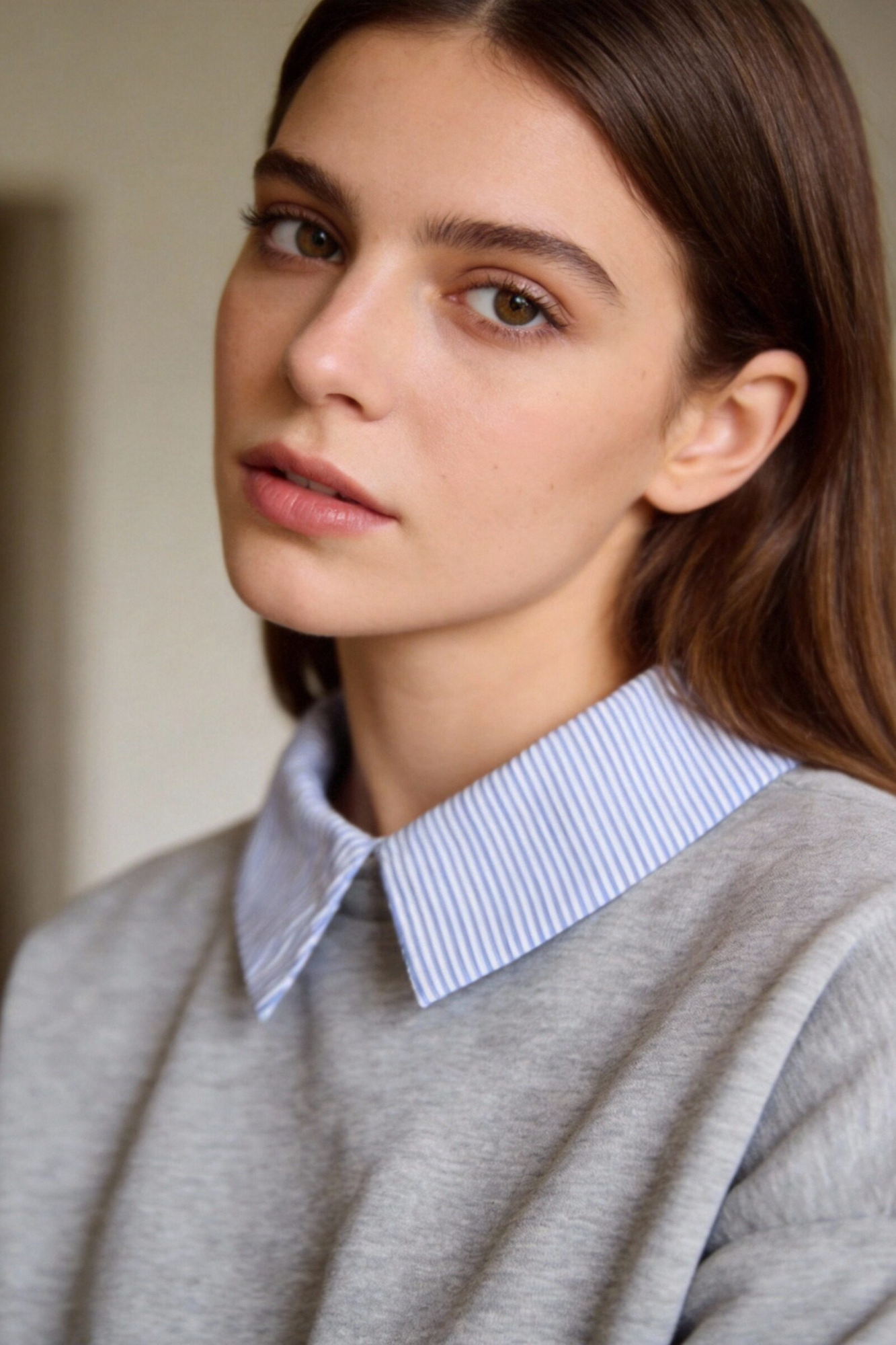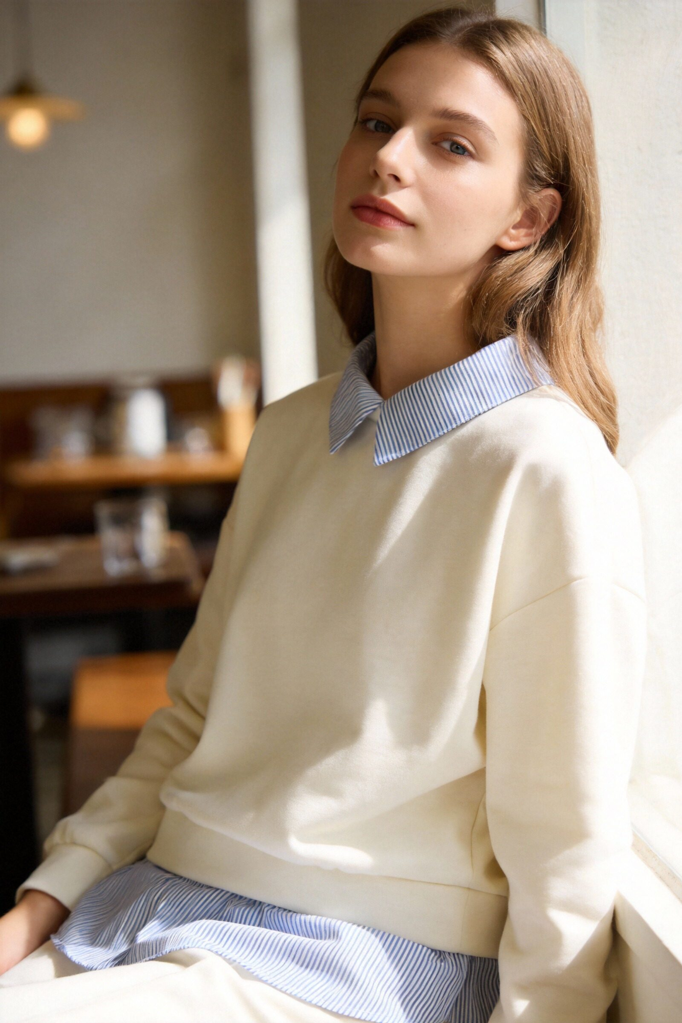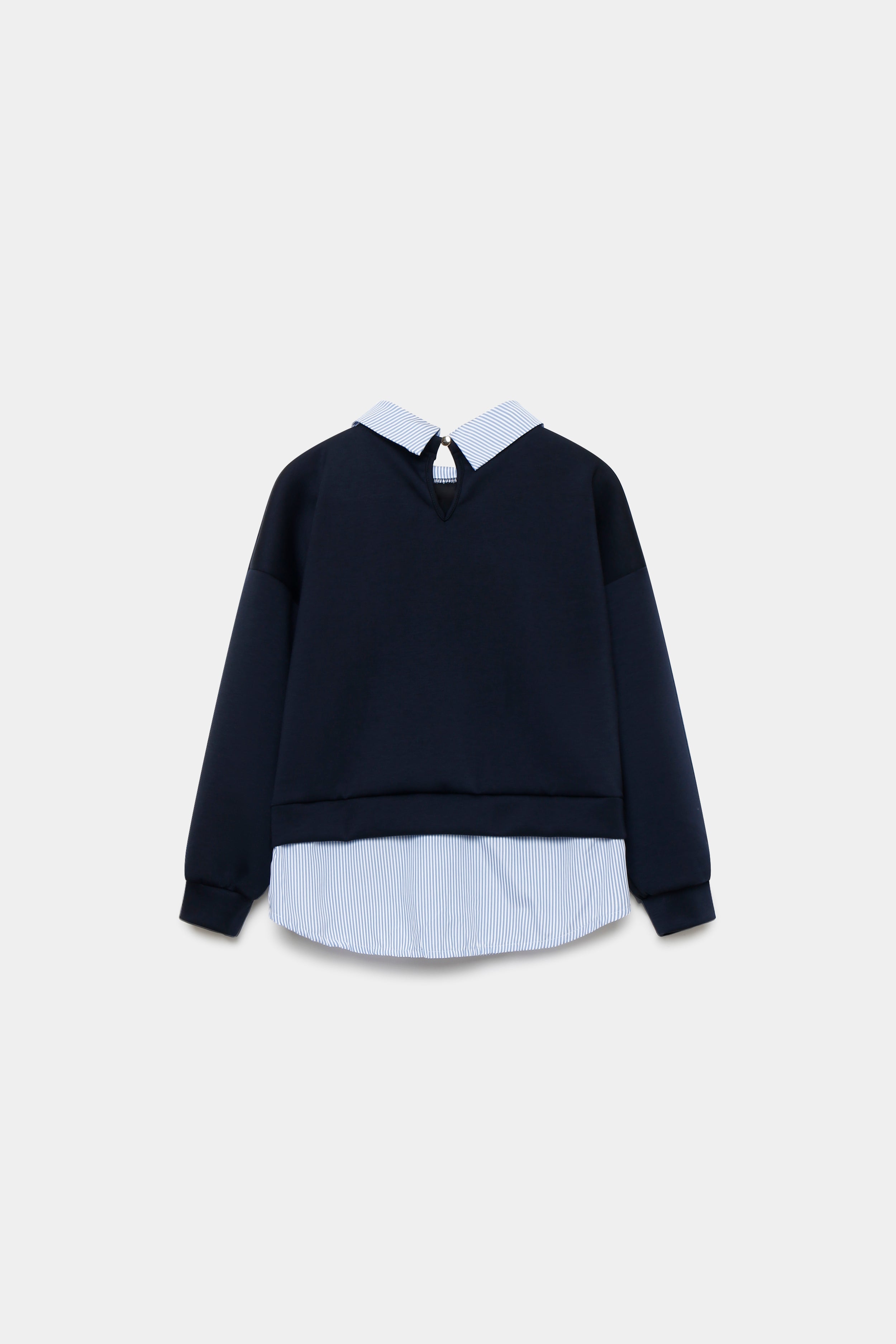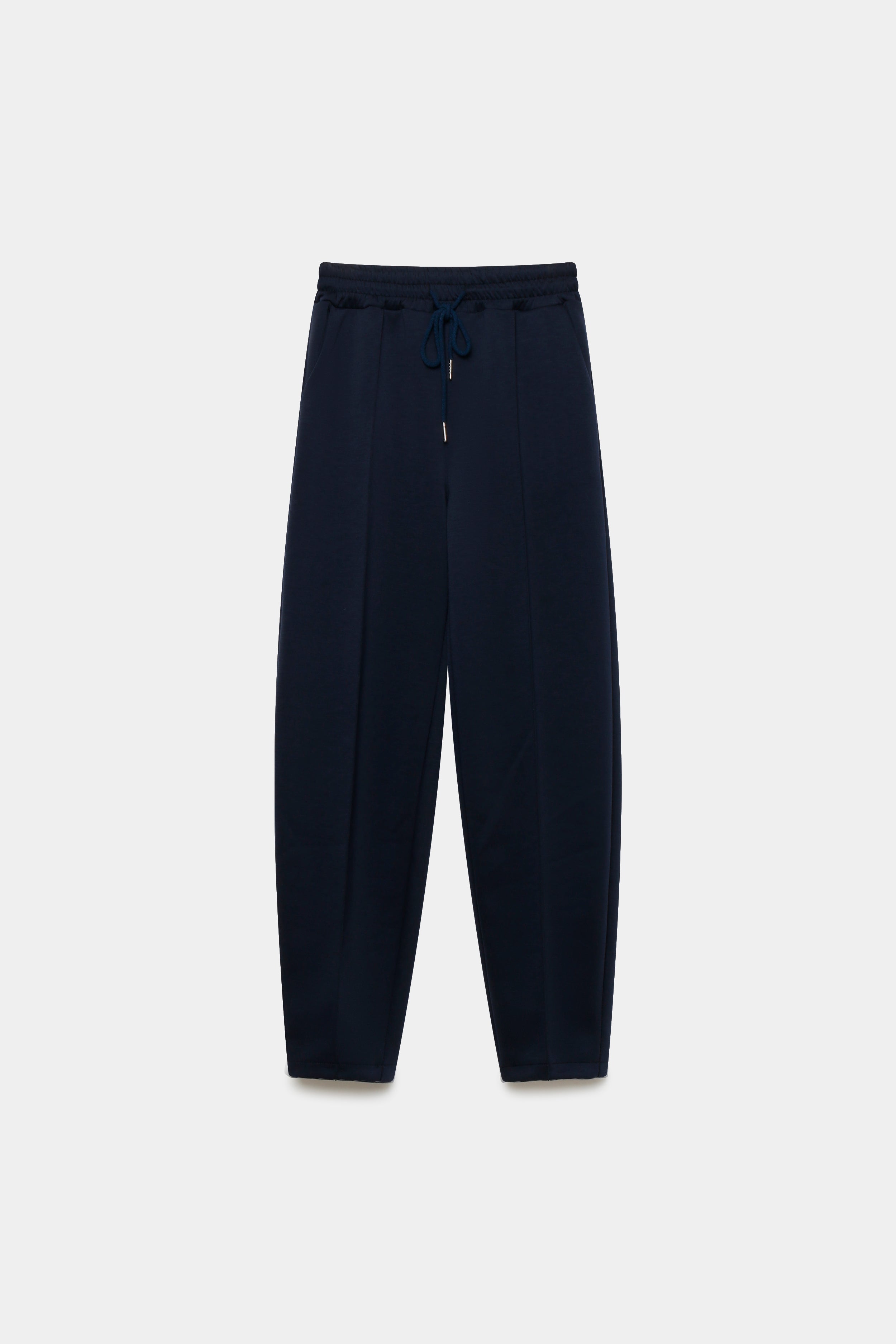 Tejido efecto felpa. Cuello redondo con solapa combinada. Manga larga. Pantalón de tiro alto. Bolsillos laterales. Cintura elástica y ajustable.