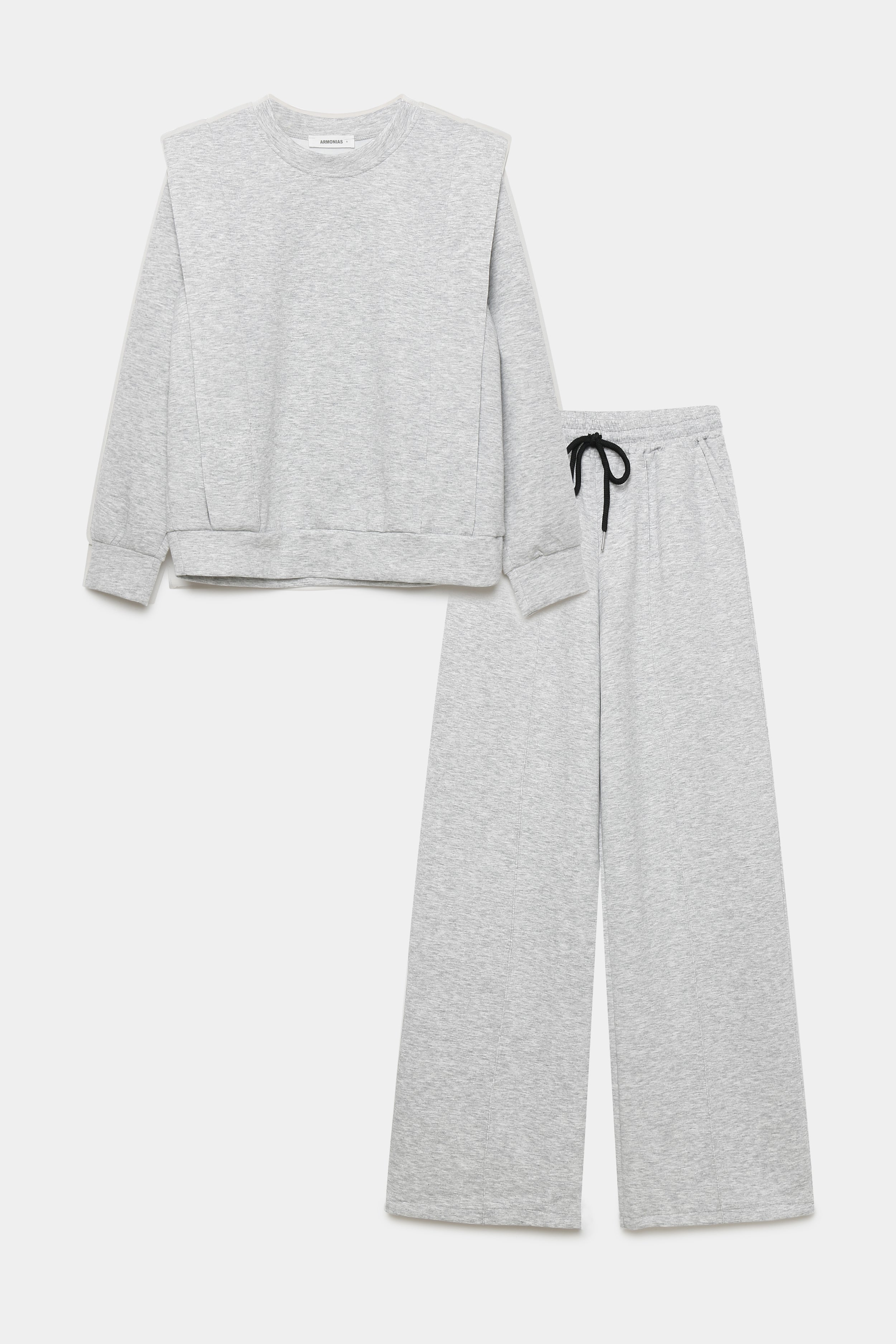 Tejido efecto felpa. Cuello redondo. Efecto hombreras. Manga larga. Pantalón de tiro alto. Bolsillos laterales. Cintura elástica y ajustable.