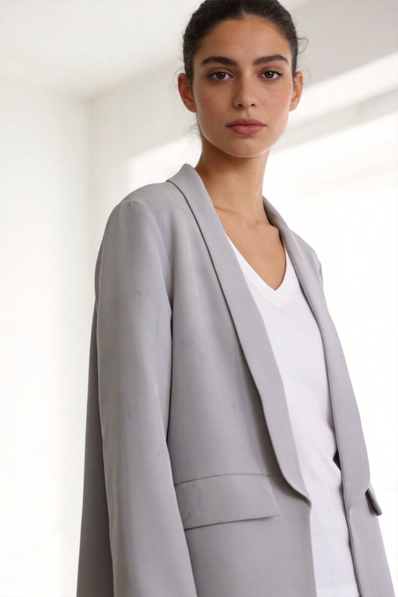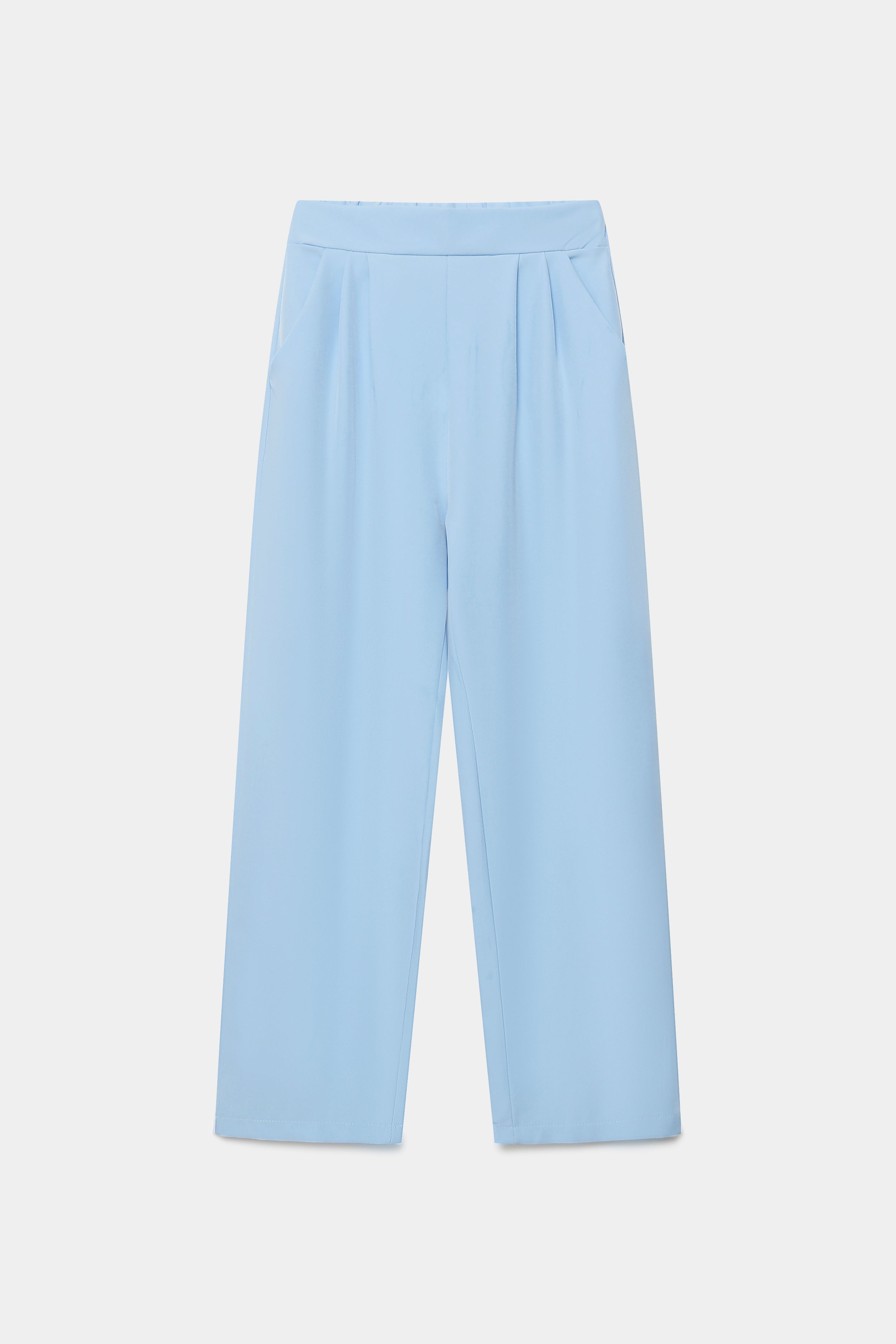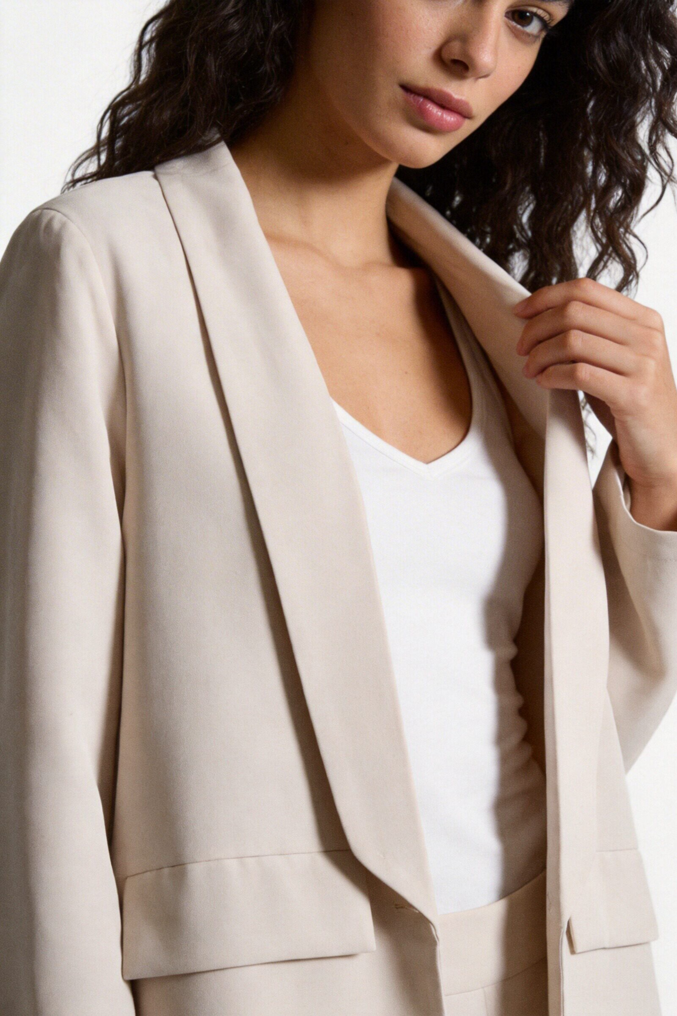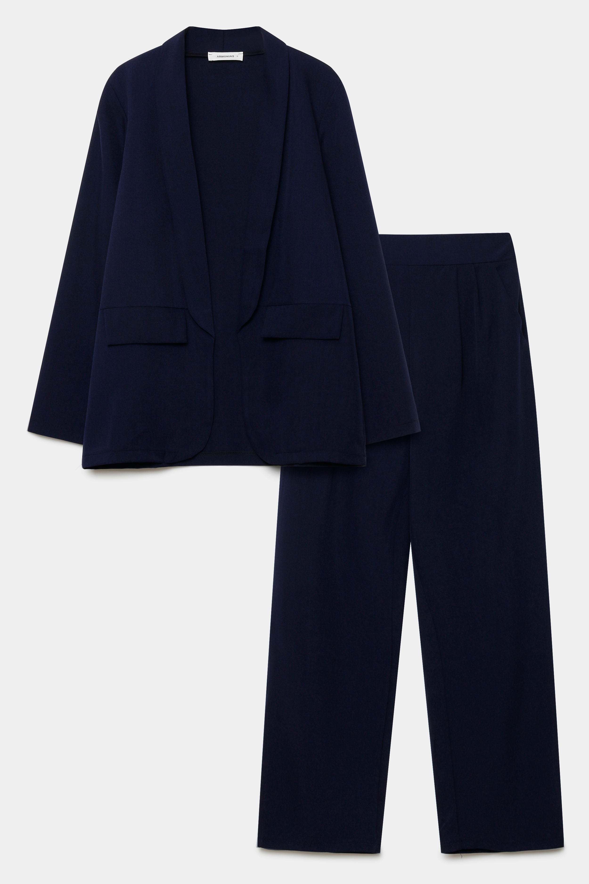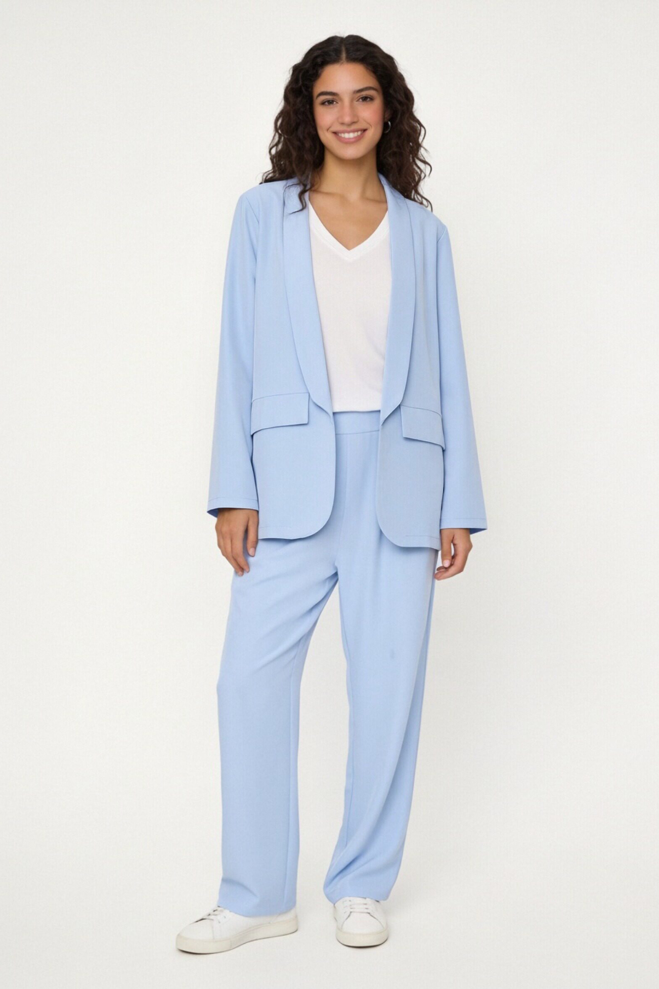 Conjunto de blazar y pantalón. Tejido fluido. Chaqueta abierta con manga larga. Bolsillos falsos. Pantalón de tiro alto. Cintura alta elástico en la trasera. Bolsillos frontales. Pinzas delanteras.