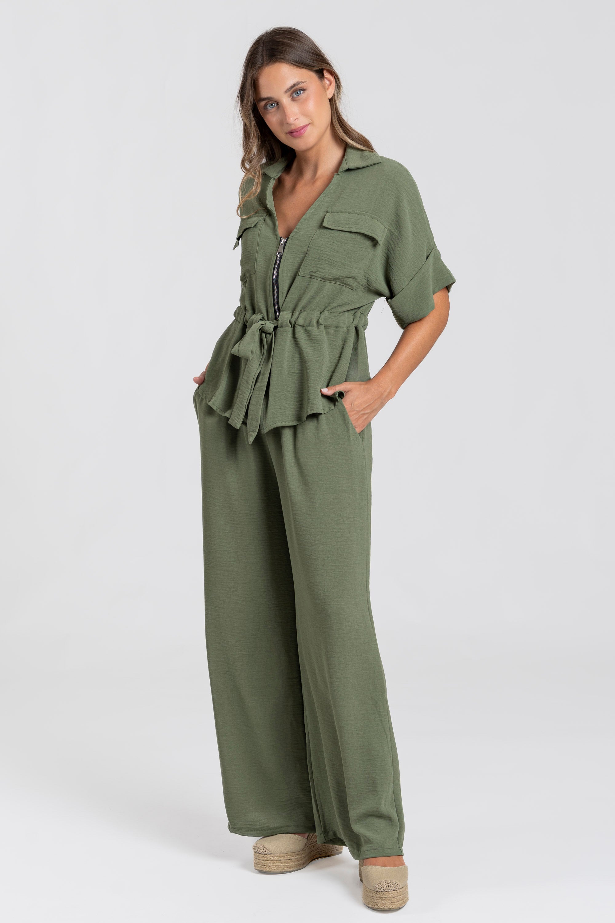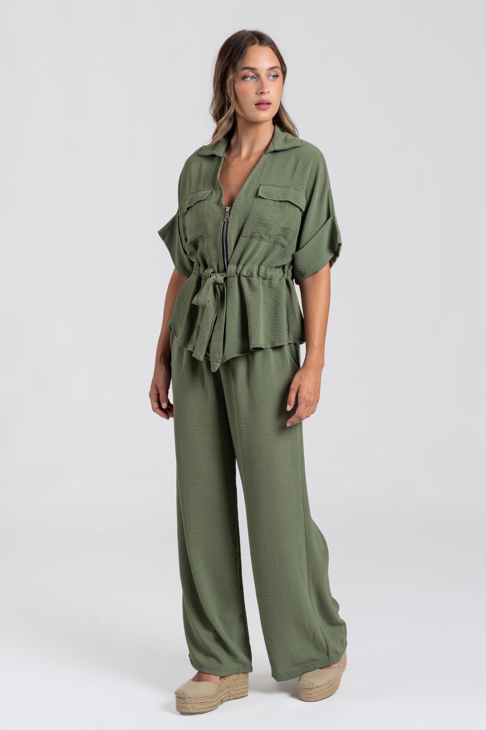 Conjunto chaqueta y pantalón. Tejido fluido. Chaqueta manga corta. Cierre cremallera. Bolsillos solapa. Cintura ajustable. Pantalón tiro alto. Bolsillos laterales. Pernera ancha.