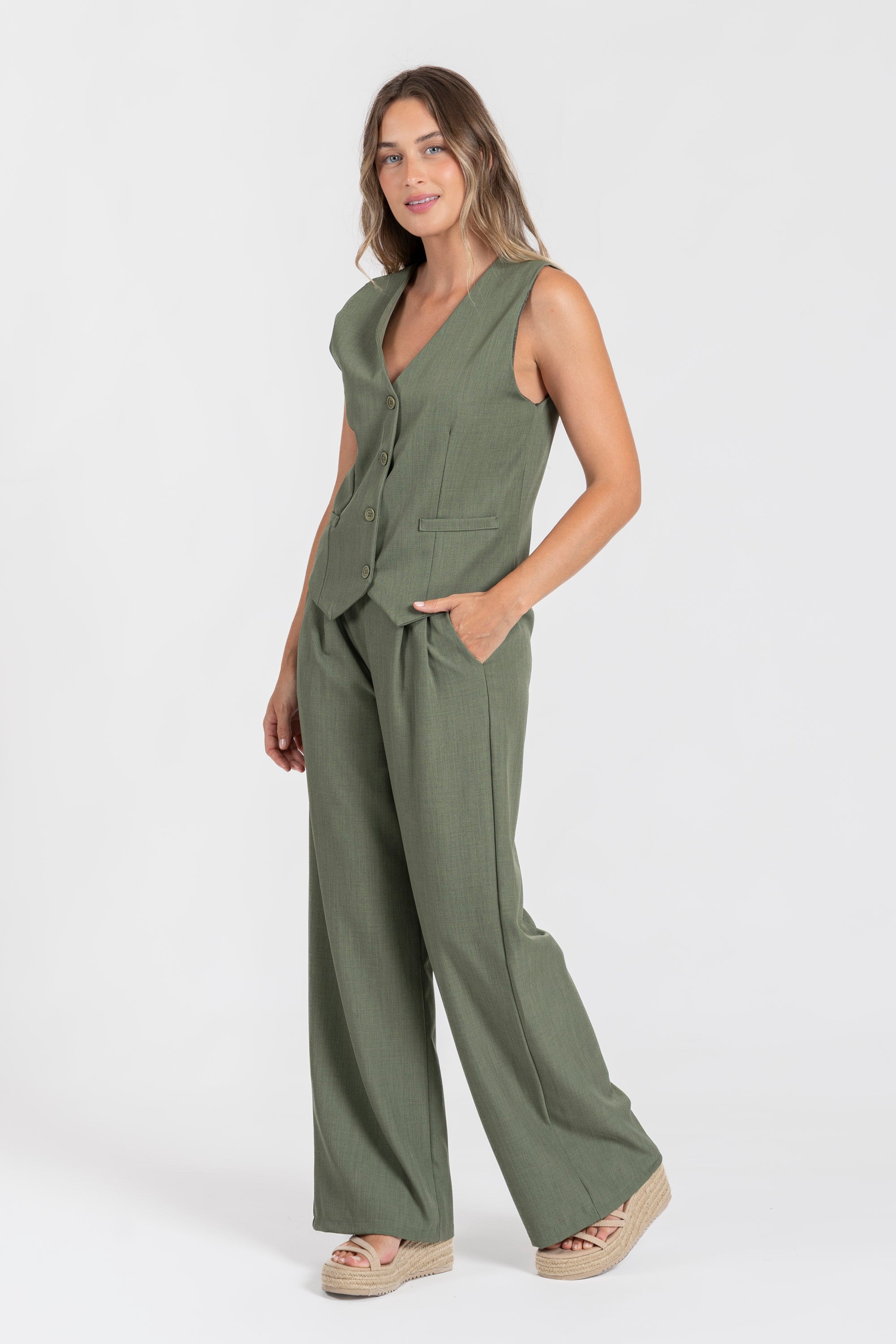 Conjunto de chaleco y pantalón. Chaleco cuello pico. Manga sisa. Cierre botones. Pantalón fluido. Cintura alta. Bolsillos laterales. Disponible en varios colores.