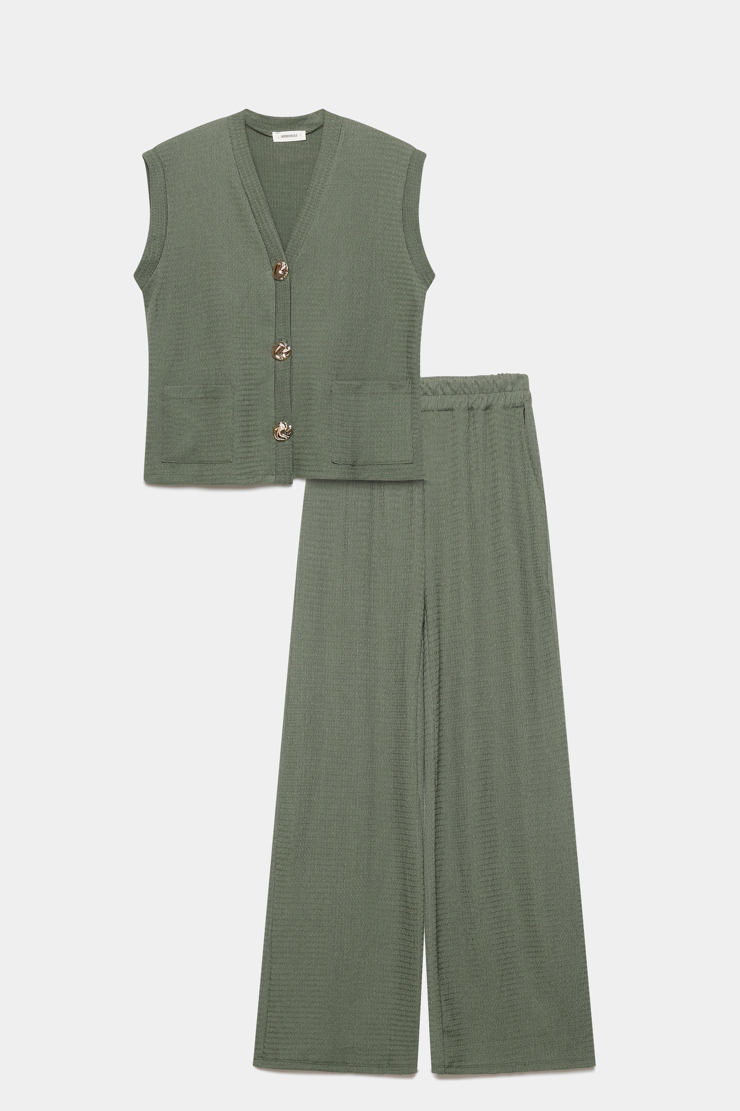 Tejido textura fluido. Escote pico. Manga sisa. Cierre frontal botones. Bolsillos frontales. Pantalón de tiro alto. Cintura elástica. Bolsillos laterales. Pernera recta.