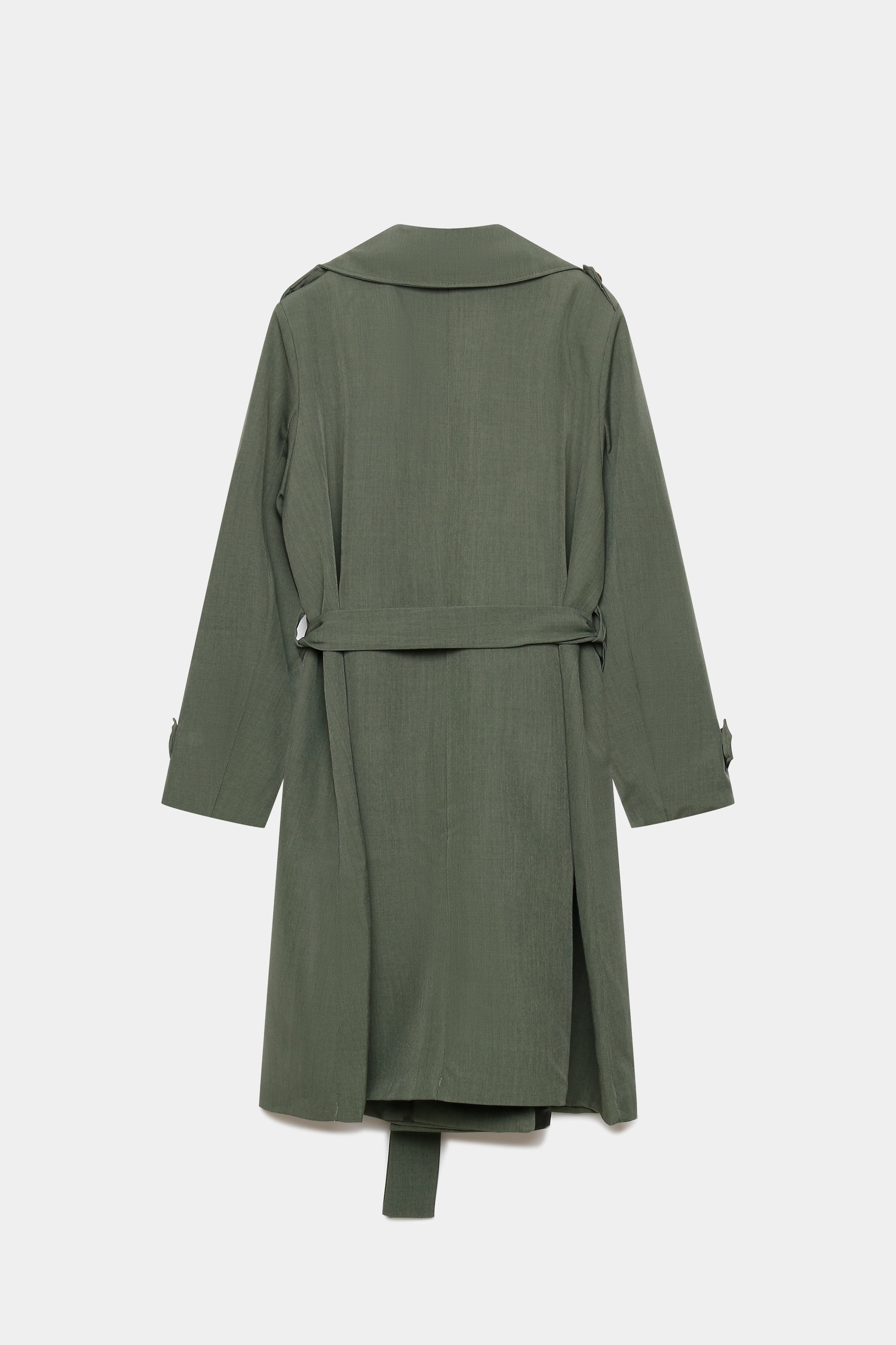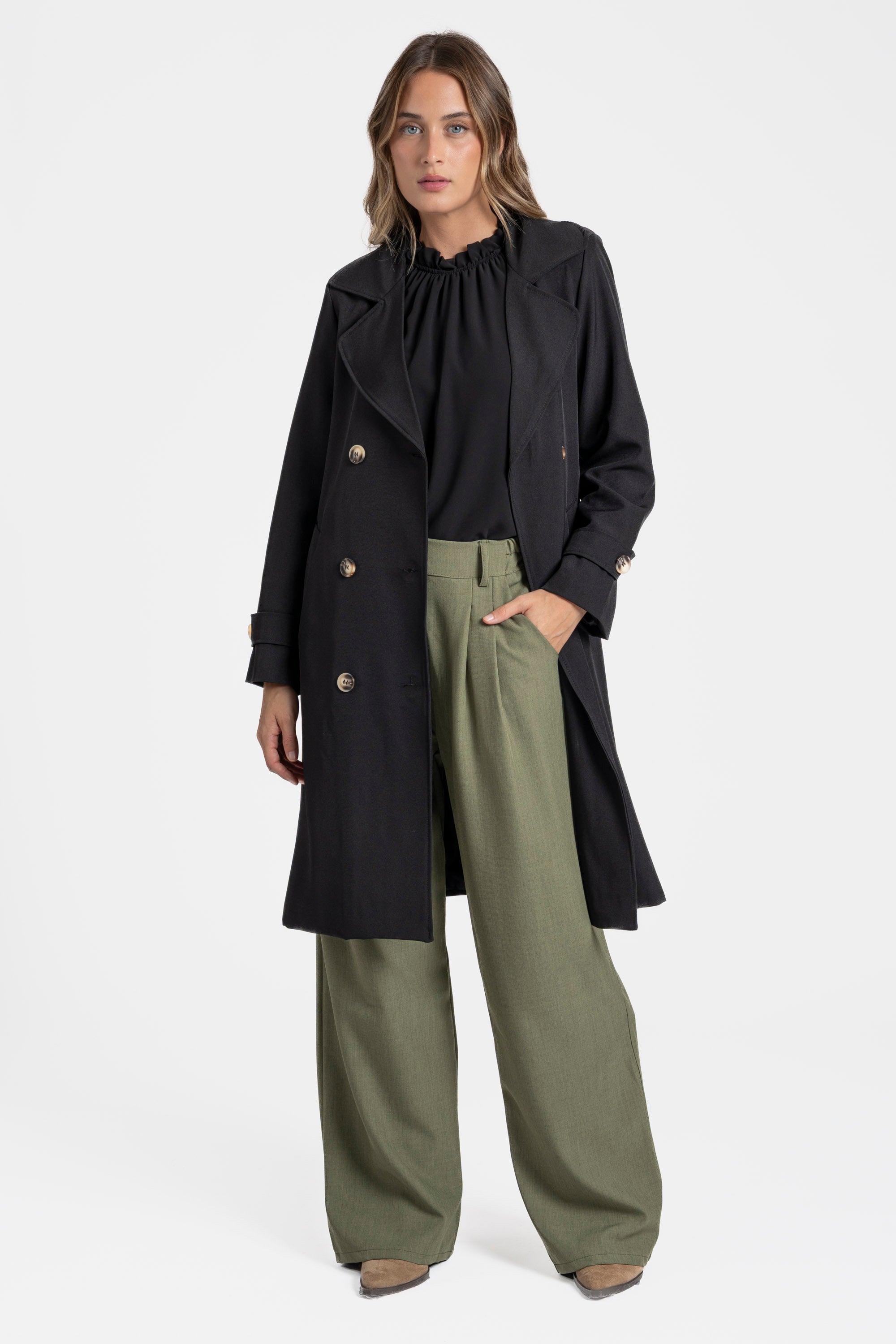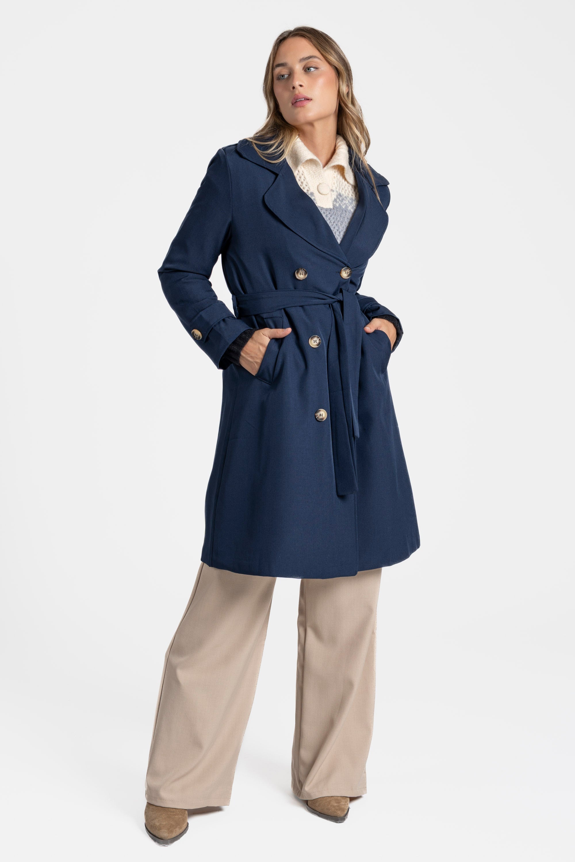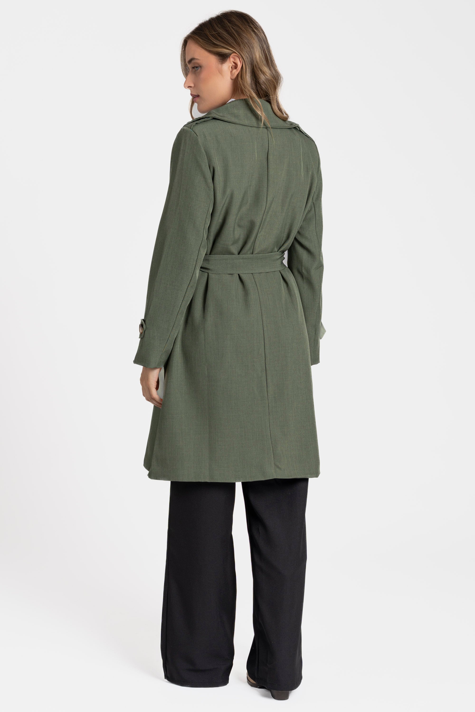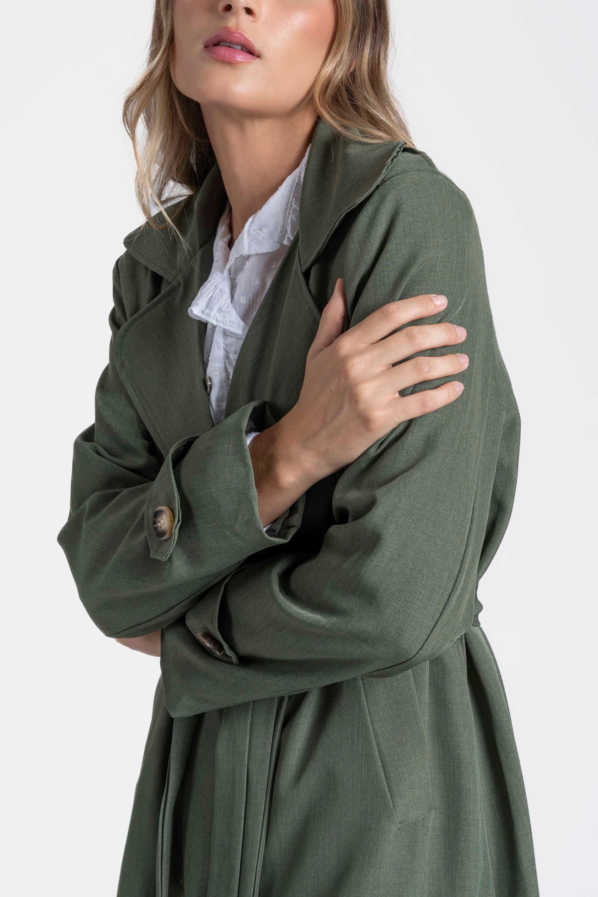 Trench de cuello solapa y manga larga. Bolsillos delanteros. Cierre frontal cruzado con botones y cinturón del mismo tejido.