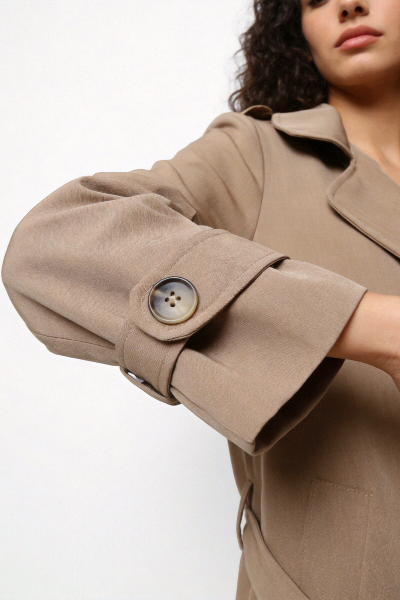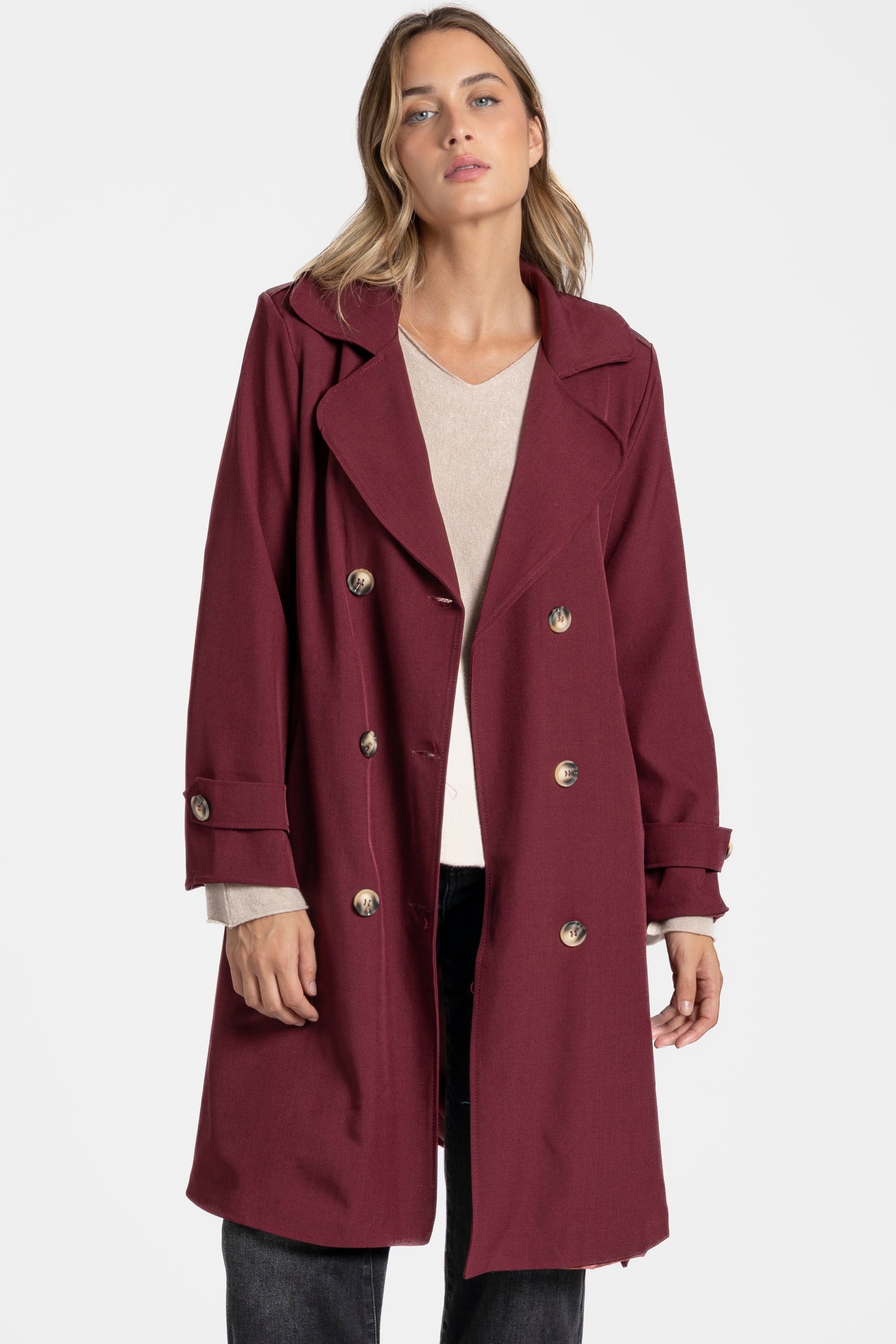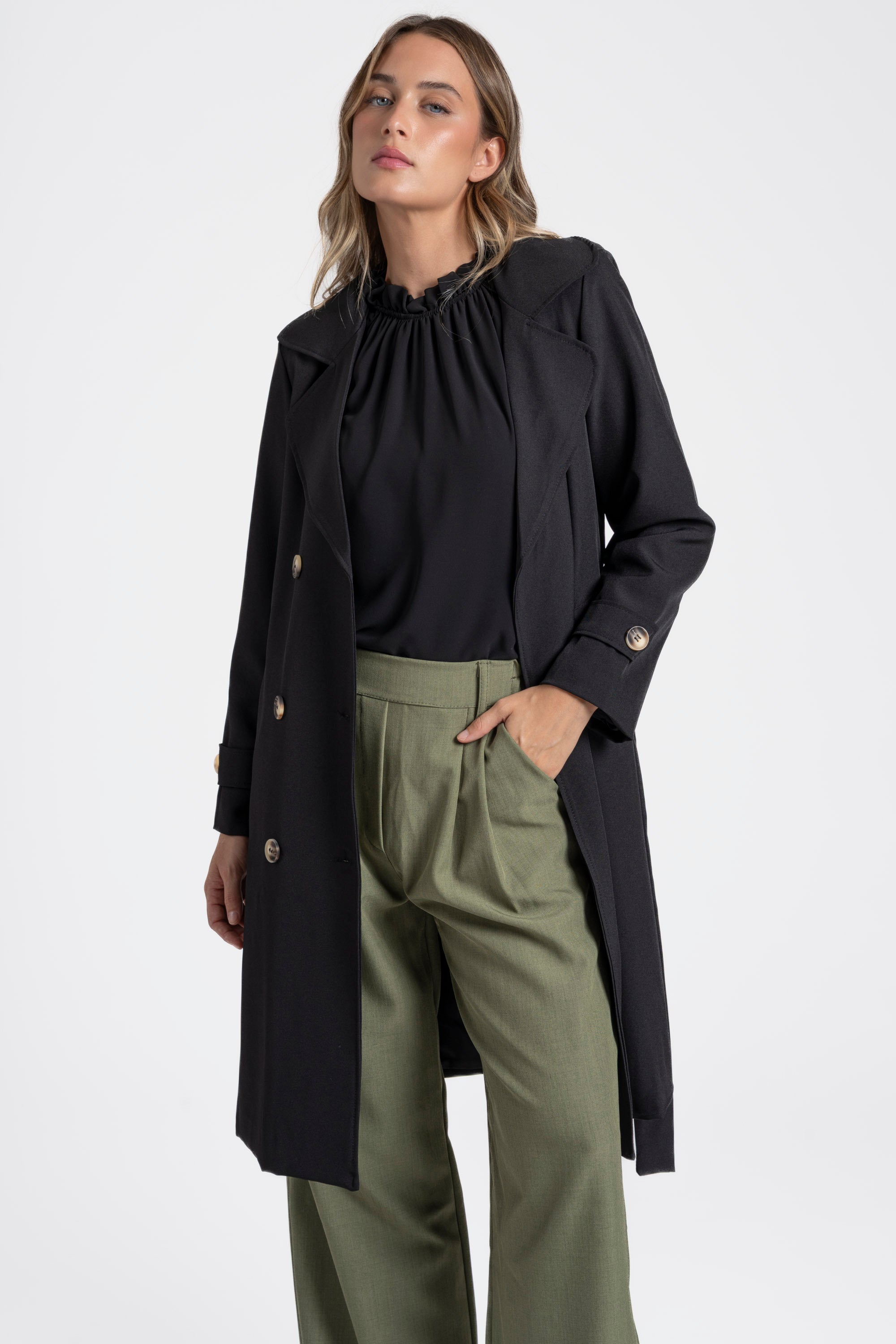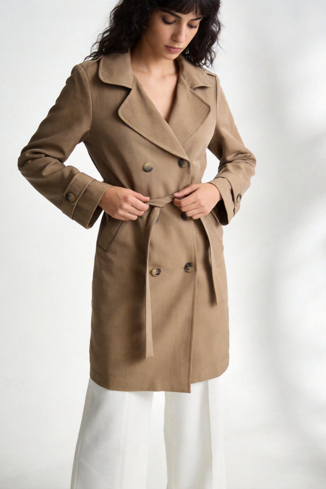Trench de cuello solapa y manga larga. Bolsillos delanteros. Cierre frontal cruzado con botones y cinturón del mismo tejido.