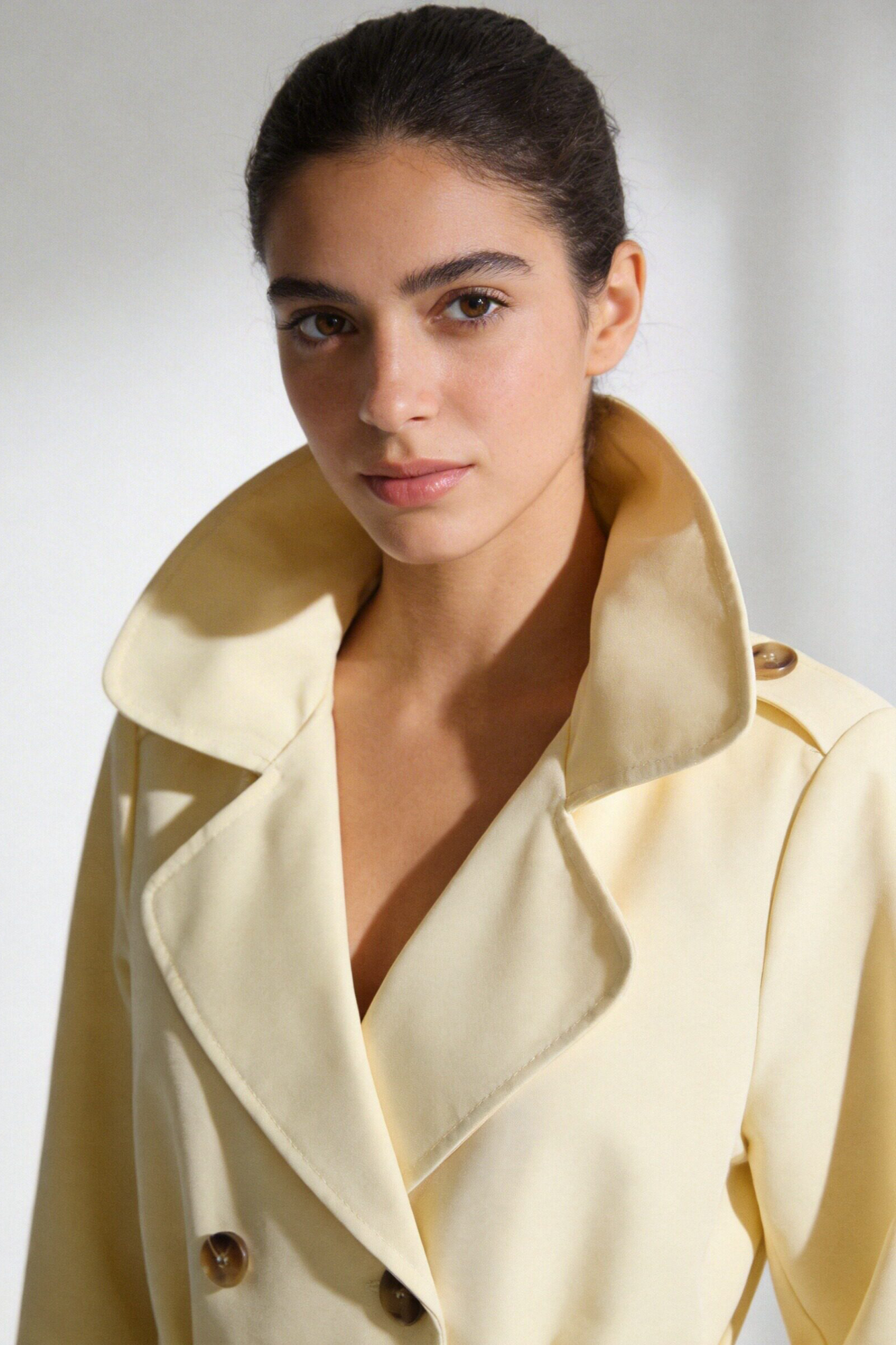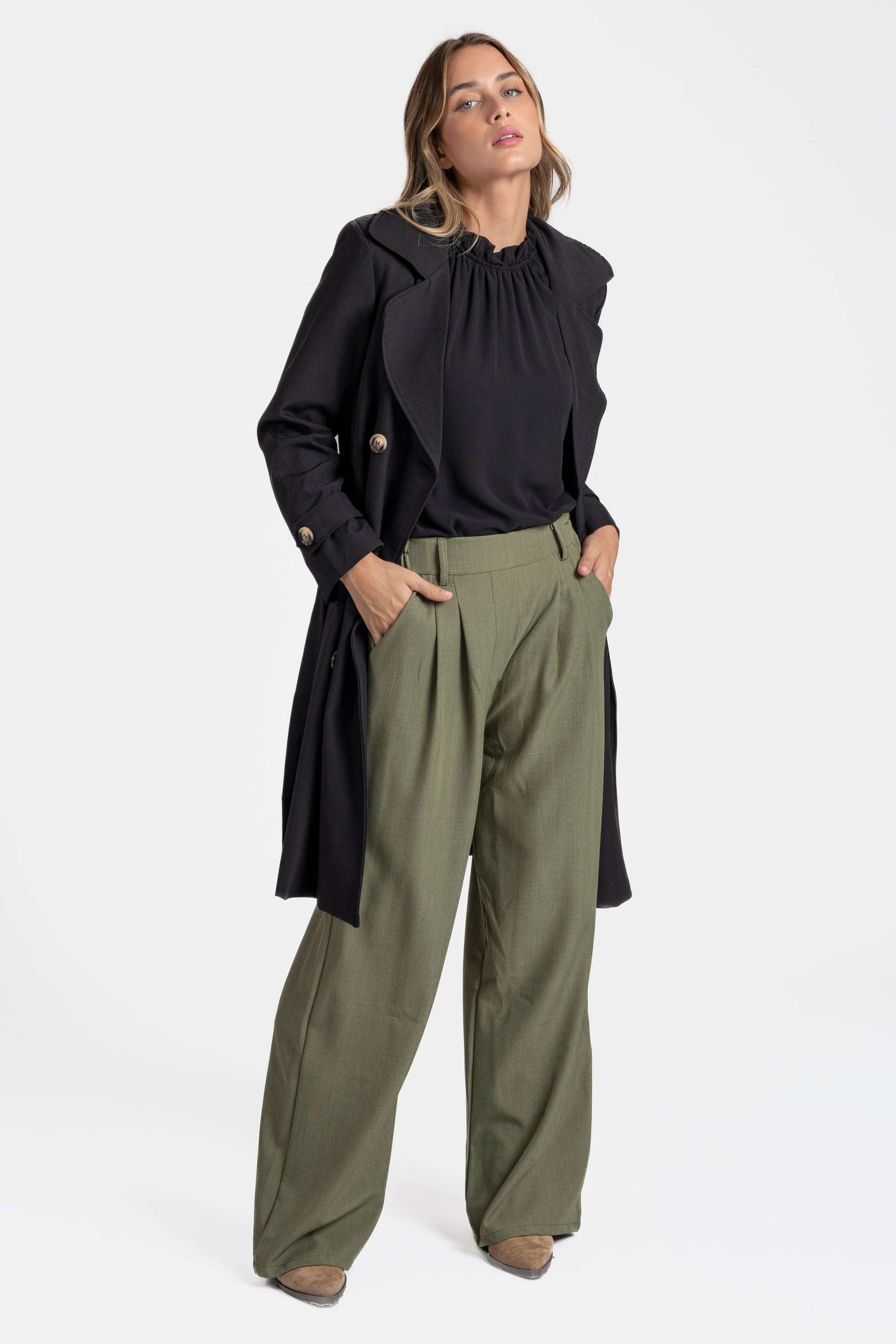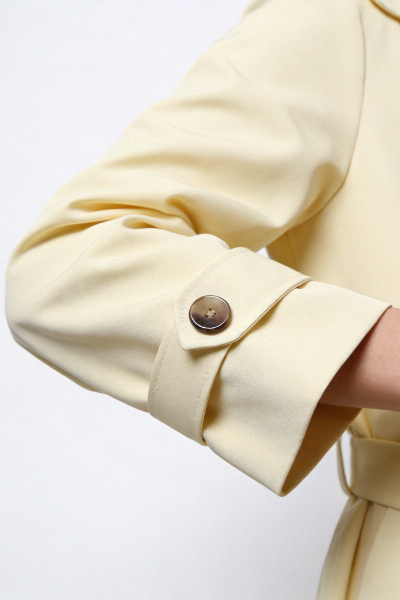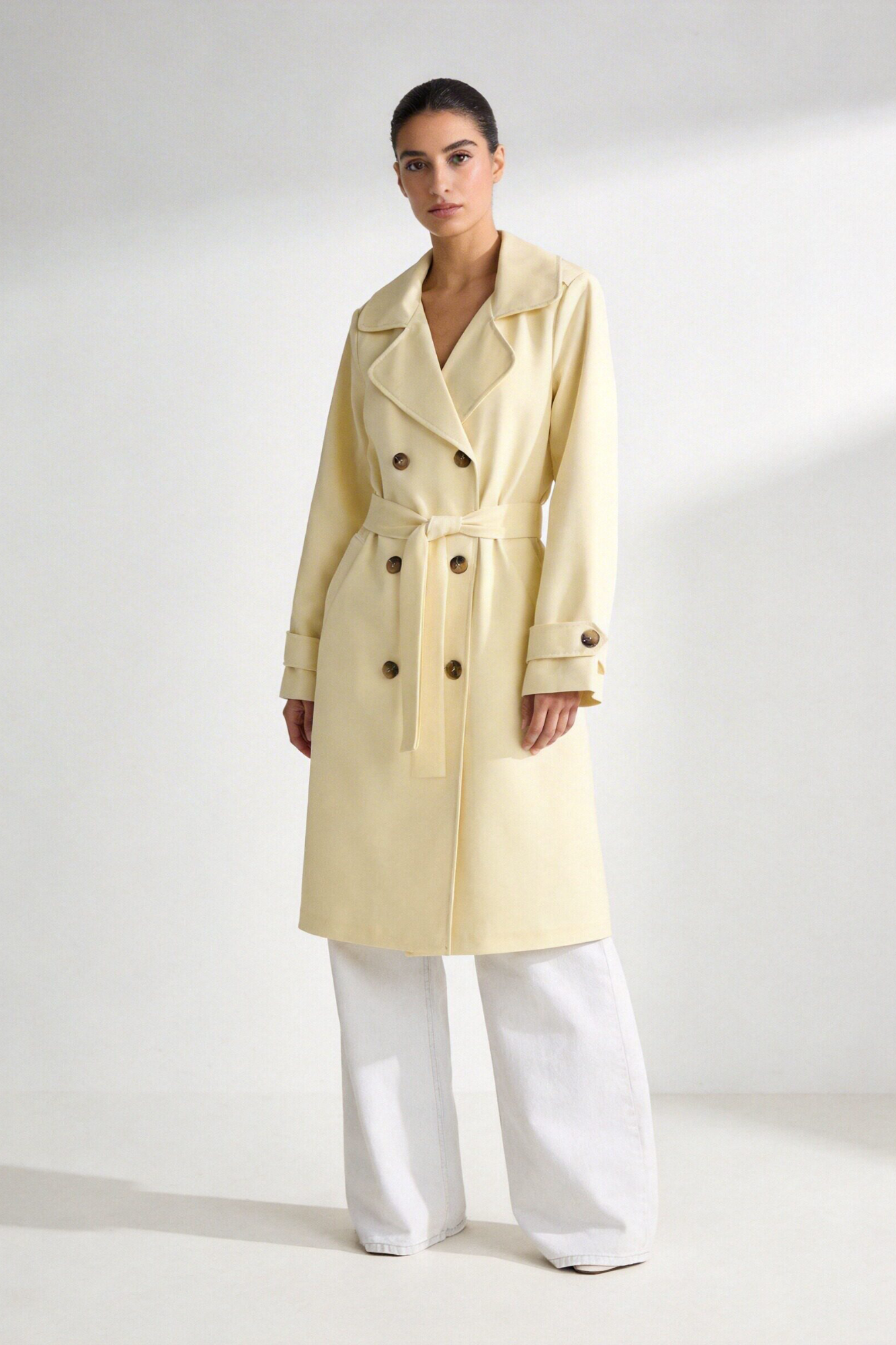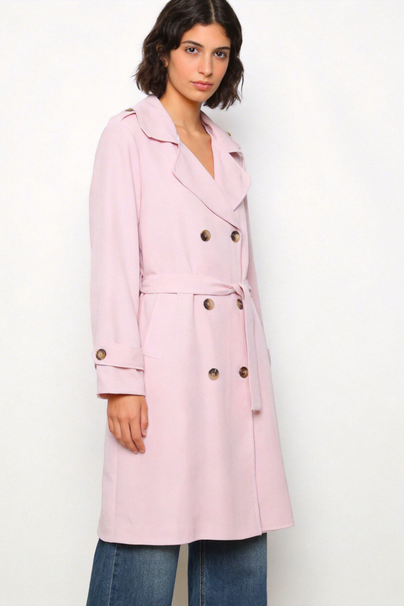 Trench de cuello solapa y manga larga. Bolsillos delanteros. Cierre frontal cruzado con botones y cinturón del mismo tejido.