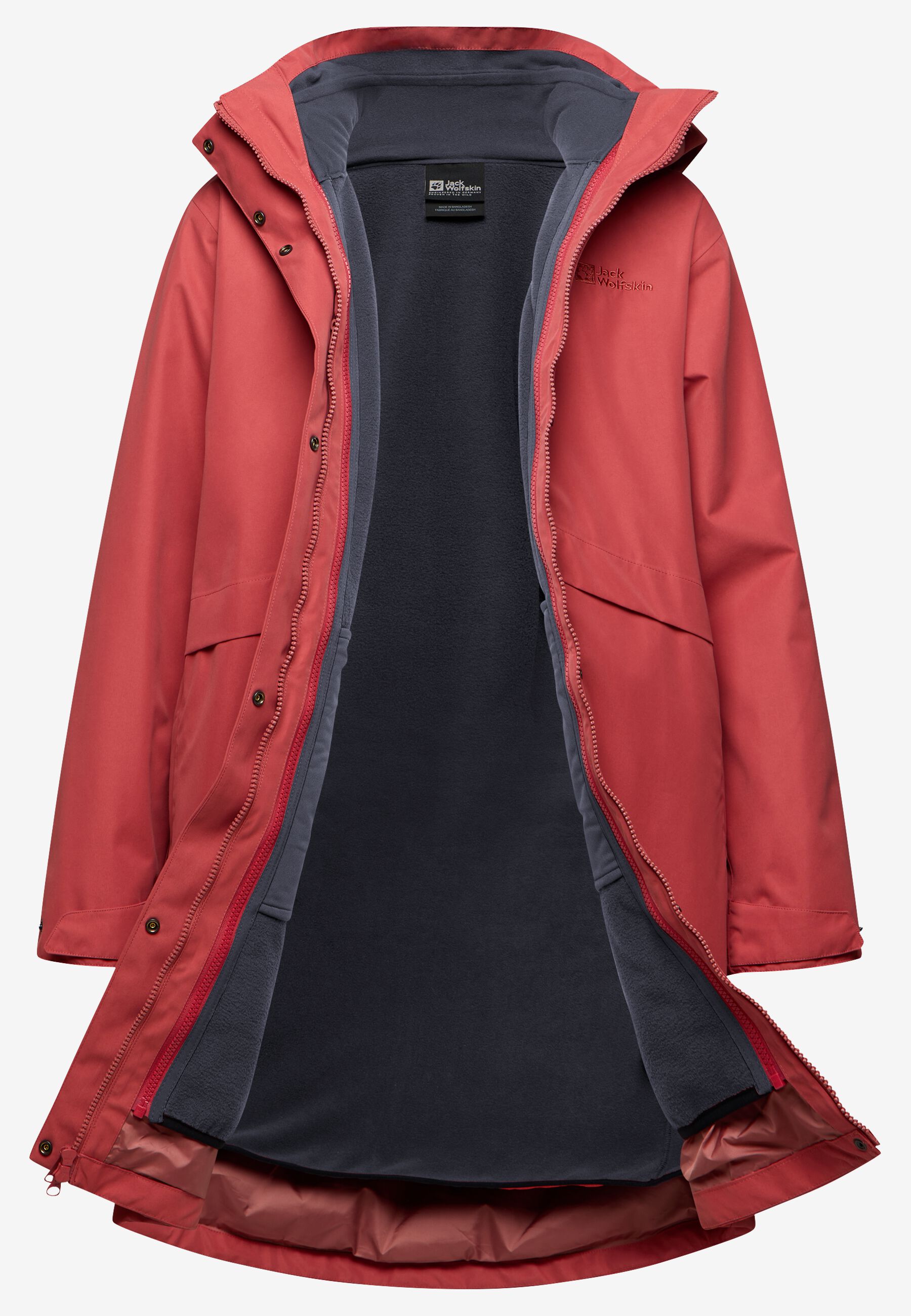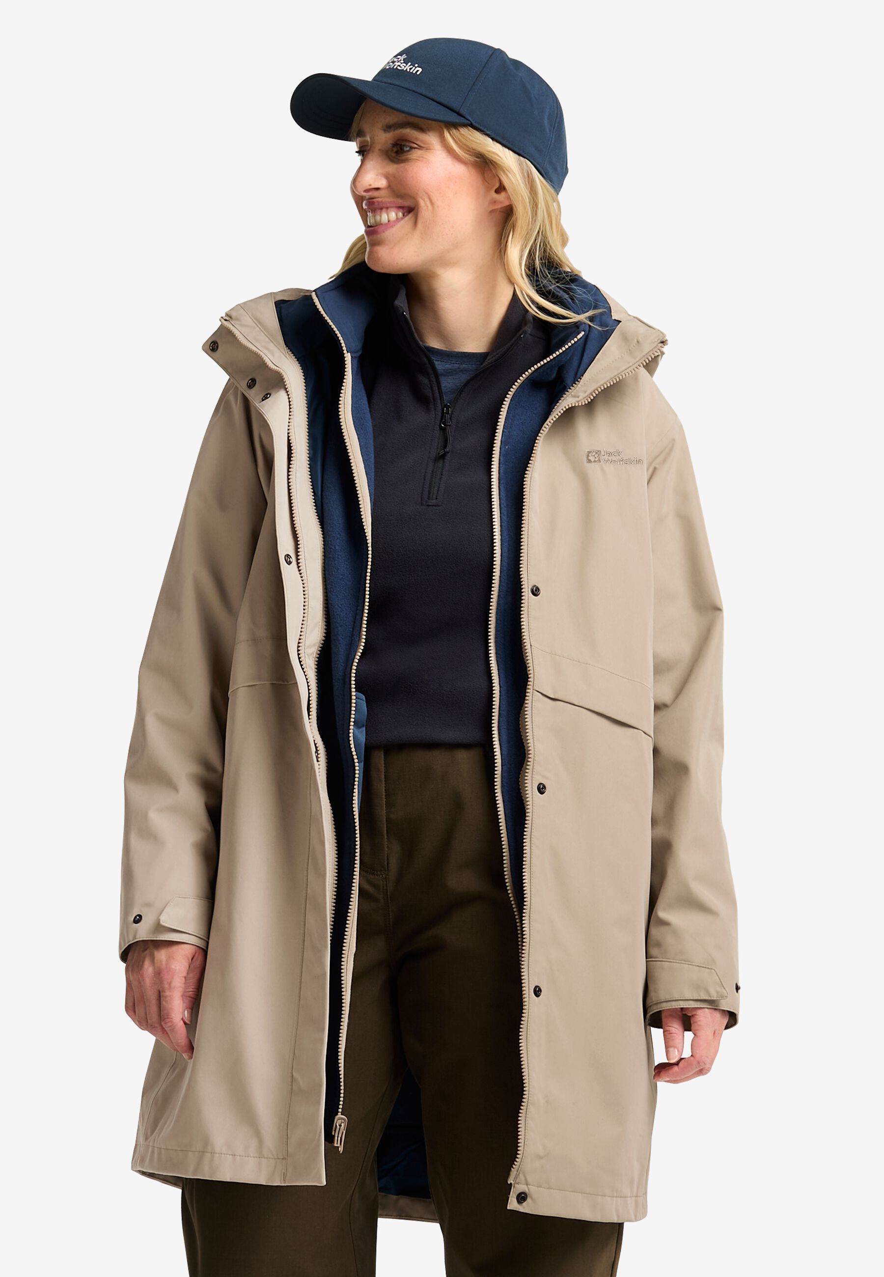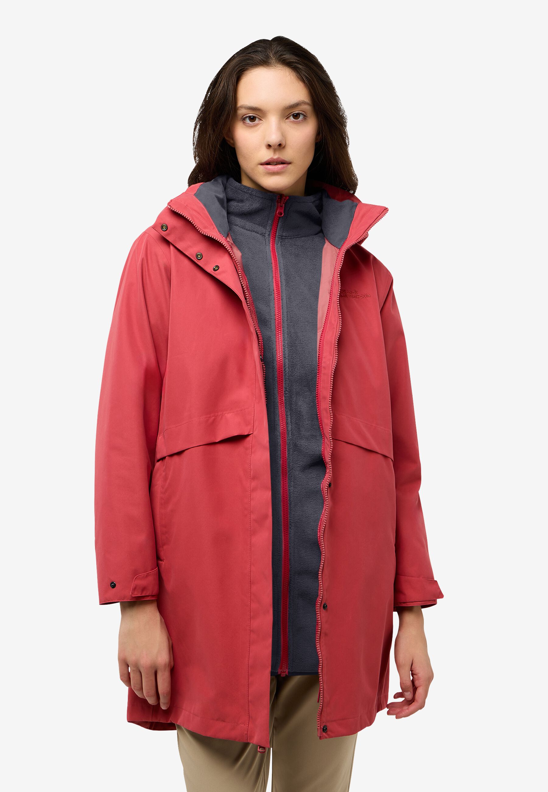 For uncertain weather and year-round comfort, the BAYLIGHT 3IN1 COAT has everything you need for protection and style. The outer jacket features a recycled TEXAPORE ECOSPHERE PRO face fabric, it's waterproof and windproof, with a detachable hood and adjustable waist. The zip-in inner jacket also has a longer hemline, and is made from a cozy 200 weight fleece.