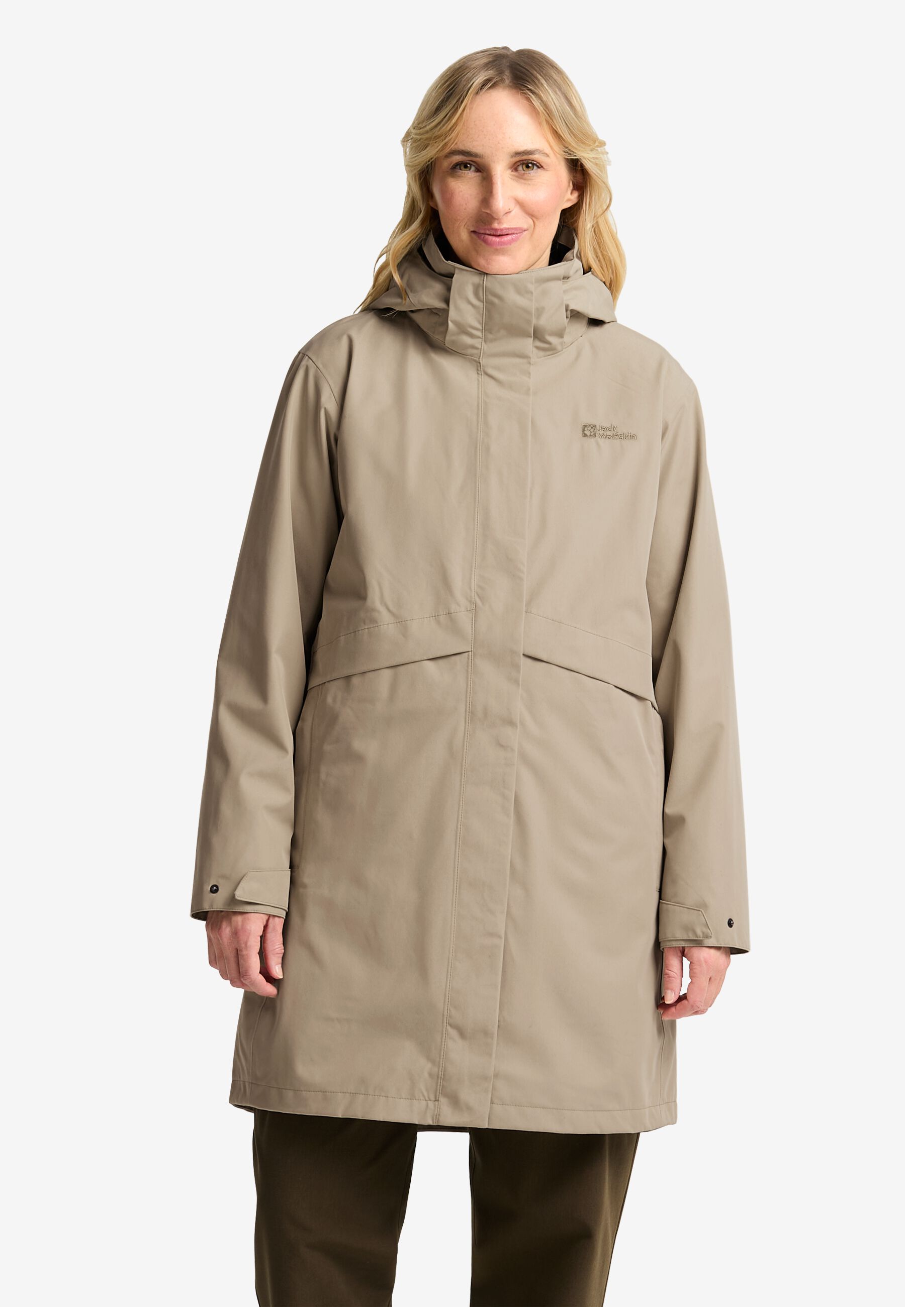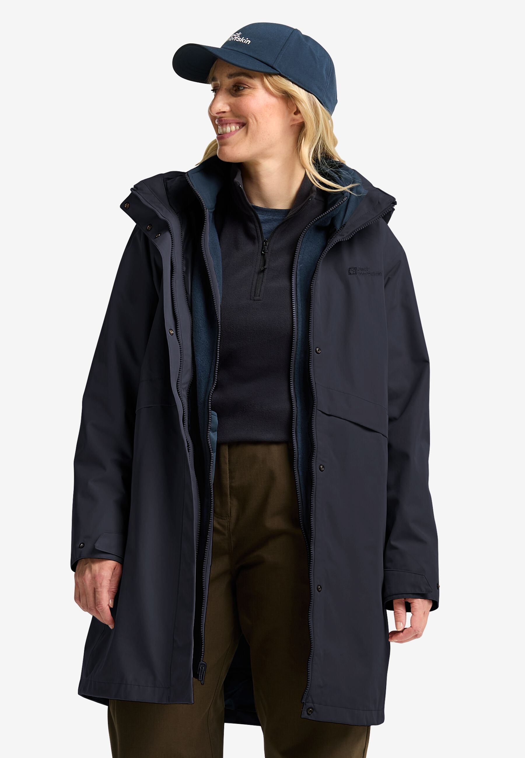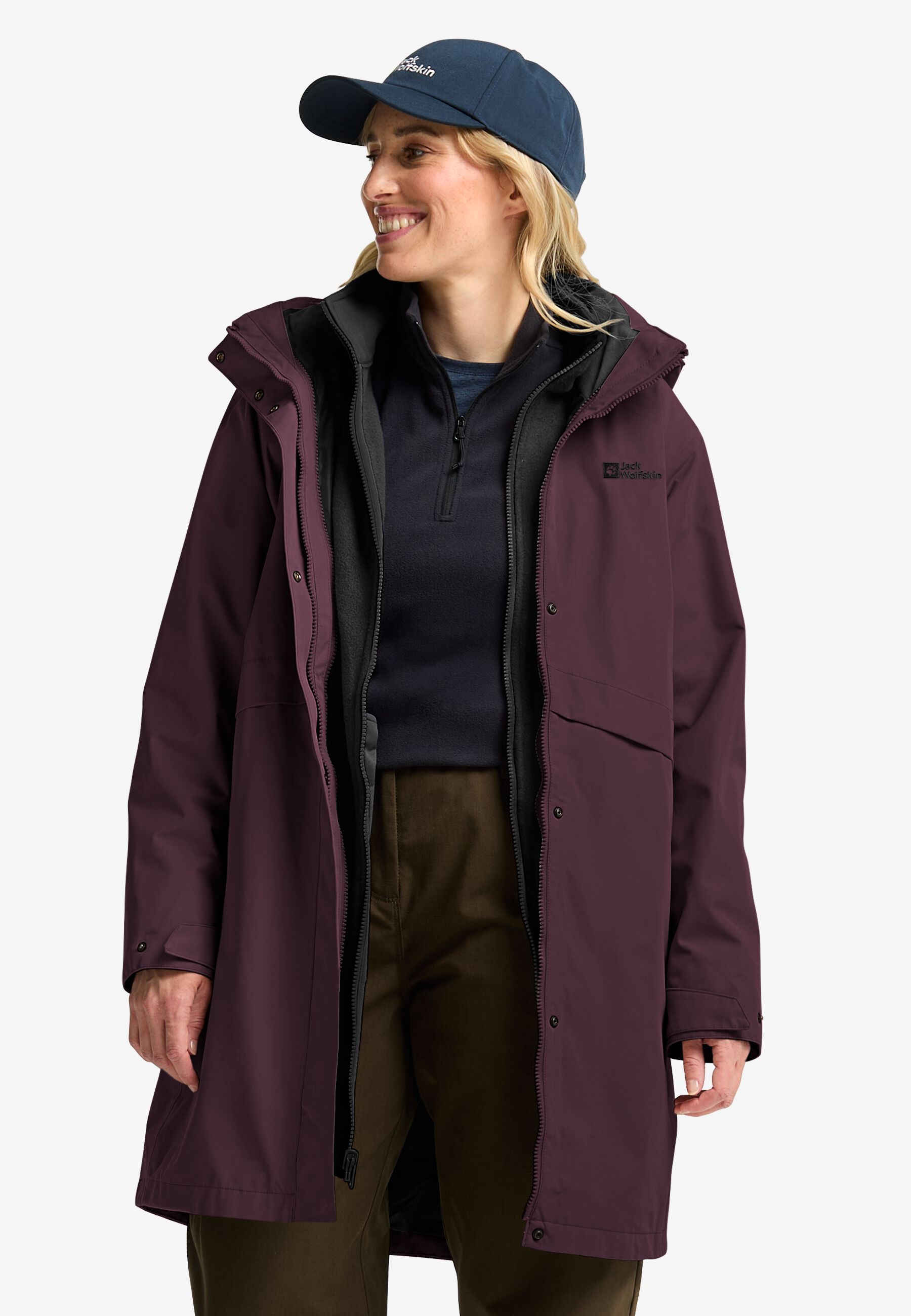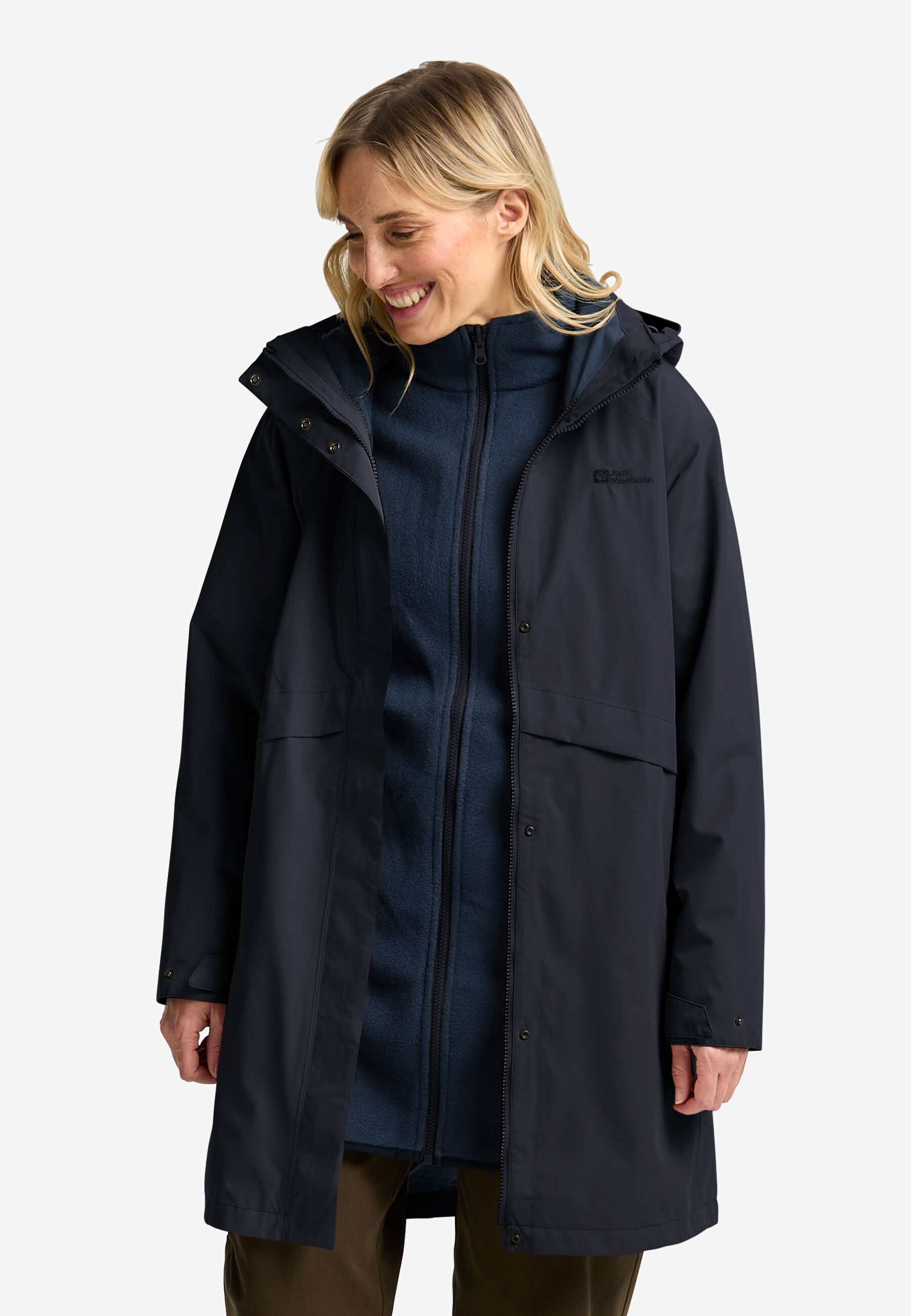 For uncertain weather and year-round comfort, the BAYLIGHT 3IN1 COAT has everything you need for protection and style. The outer jacket features a recycled TEXAPORE ECOSPHERE PRO face fabric, it's waterproof and windproof, with a detachable hood and adjustable waist. The zip-in inner jacket also has a longer hemline, and is made from a cozy 200 weight fleece.