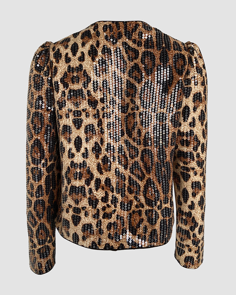 Design Details: Features allover sequin leopard print, puff long sleeves, and open front, blending retro charm with glamorous, modern style effortlessly.