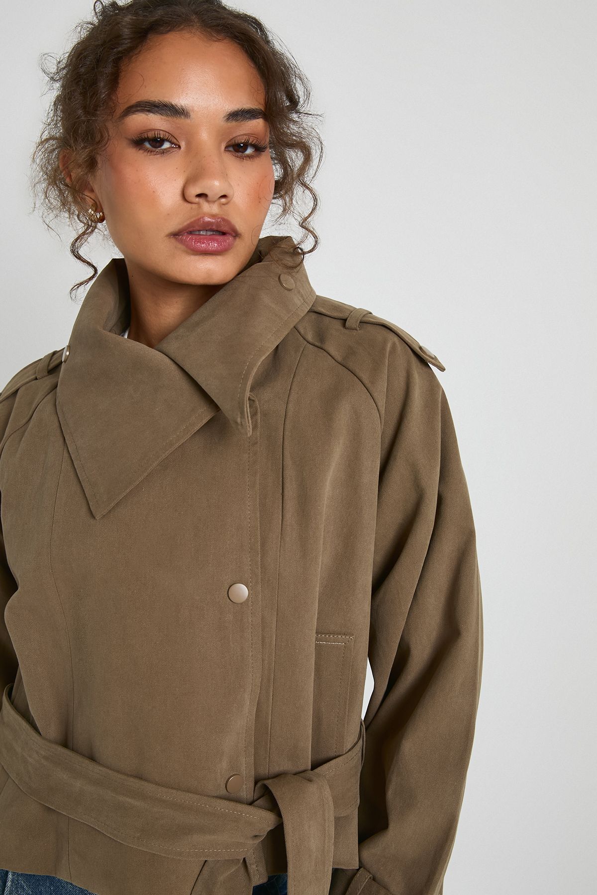 - Make a statement with this modern take on the classic trench. The Asymmetric Belted Cropped Jacket combines traditional elements with contemporary styling for a fresh, fashion-forward look. The cropped length creates a flattering silhouette that works brilliantly with high-waisted jeans or trousers, while the adjustable belt allows you to customise your fit. As seen on our model, layer over casual denim and a simple tee for everyday cool, or pair with a chunky knit jumper when temperatures drop. The versatile design transitions effortlessly from weekend coffee dates to family gatherings. For a trendy contrast, try styling with wide-leg trousers and trainers, or dress up with a midi skirt and ankle boots. This Boohoo jacket embodies the brand's commitment to accessible, on-trend pieces that work for various occasions in your social calendar.