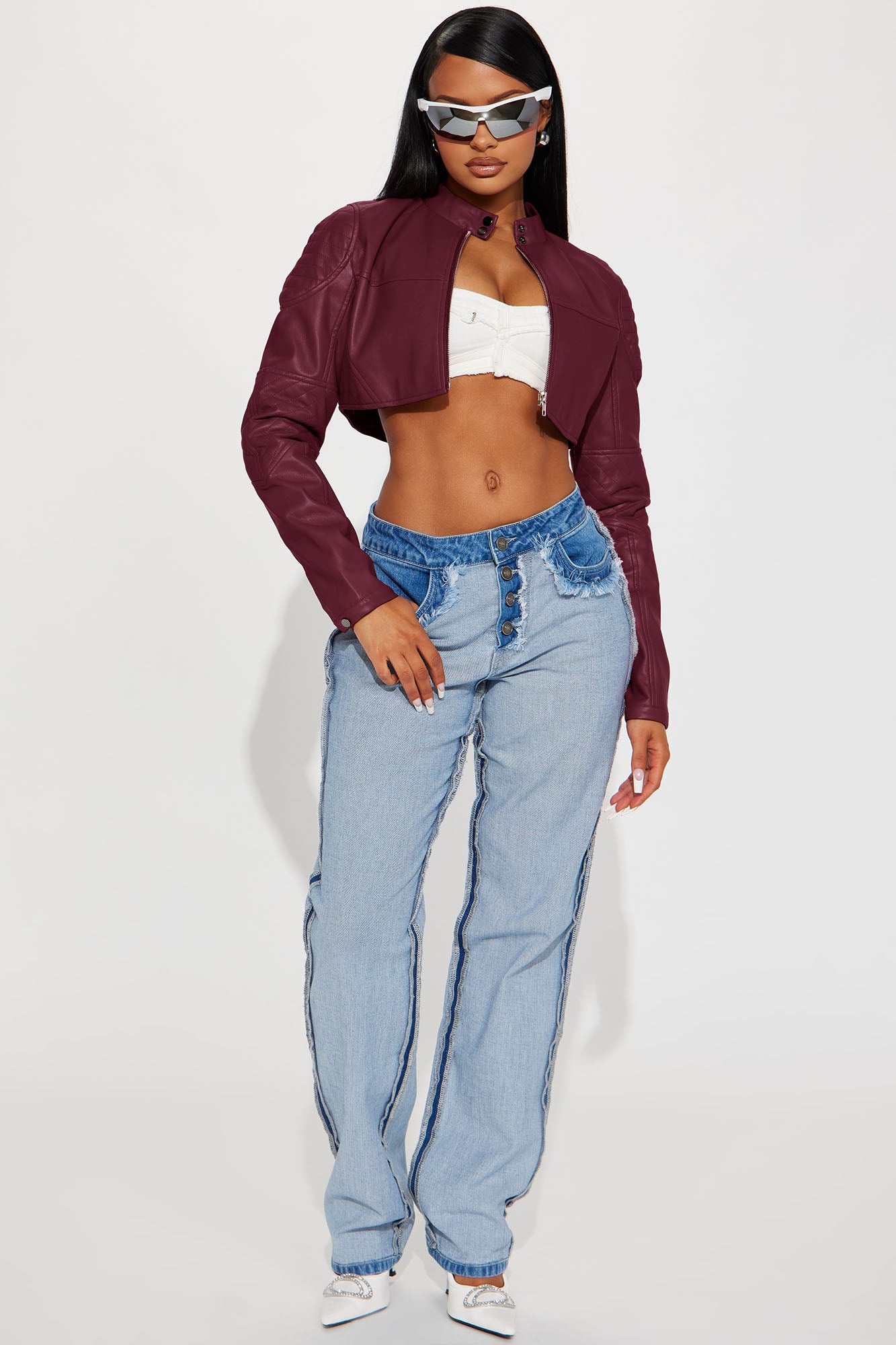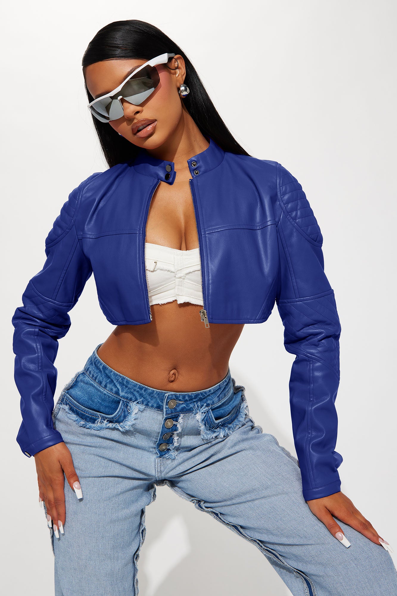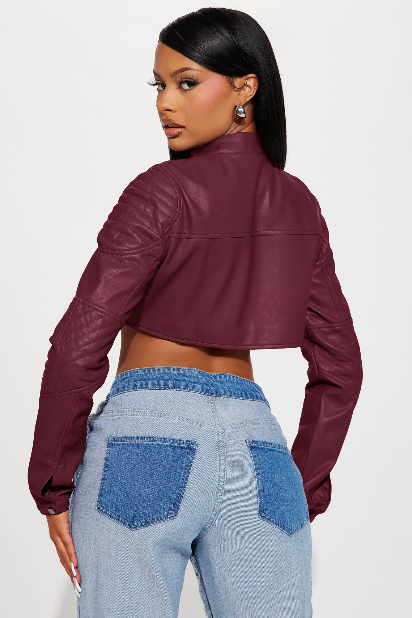 Available In Black, Burgundy, Chocolate, Olive, Red, Royal And Turquoise.Faux Leather JacketMock NeckButton ClosureFull ZipLong SleeveCroppedLinedShell: 100% Polyester Coated With PULining: 100% PolyesterImported
