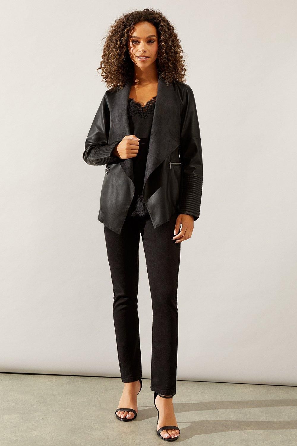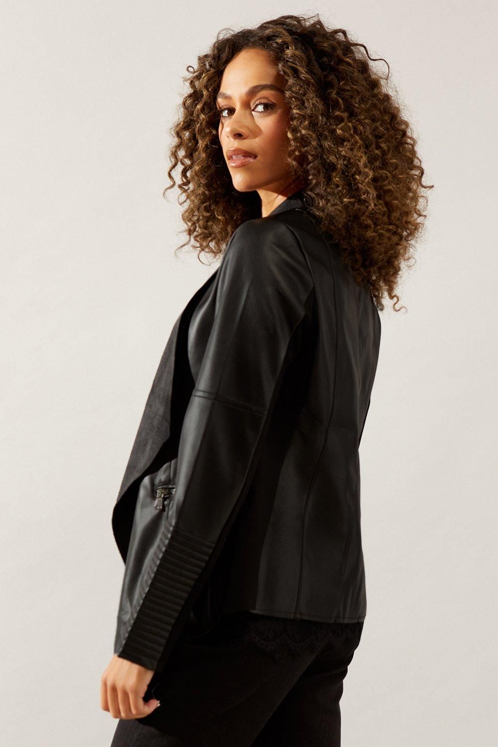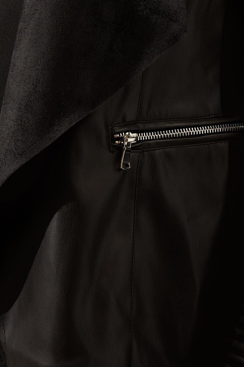 - This black faux leather jacket is the perfect addition to any woman's wardrobe. The waterfall design adds a touch of elegance, while the faux leather material makes it an affordable and animal-friendly option. The silver hardware gives it a modern edge, making it a versatile piece that can be dressed up or down. Whether you're running errands or going out for a night on the town, this jacket is sure to turn heads. Don't miss out on this stylish and practical piece.