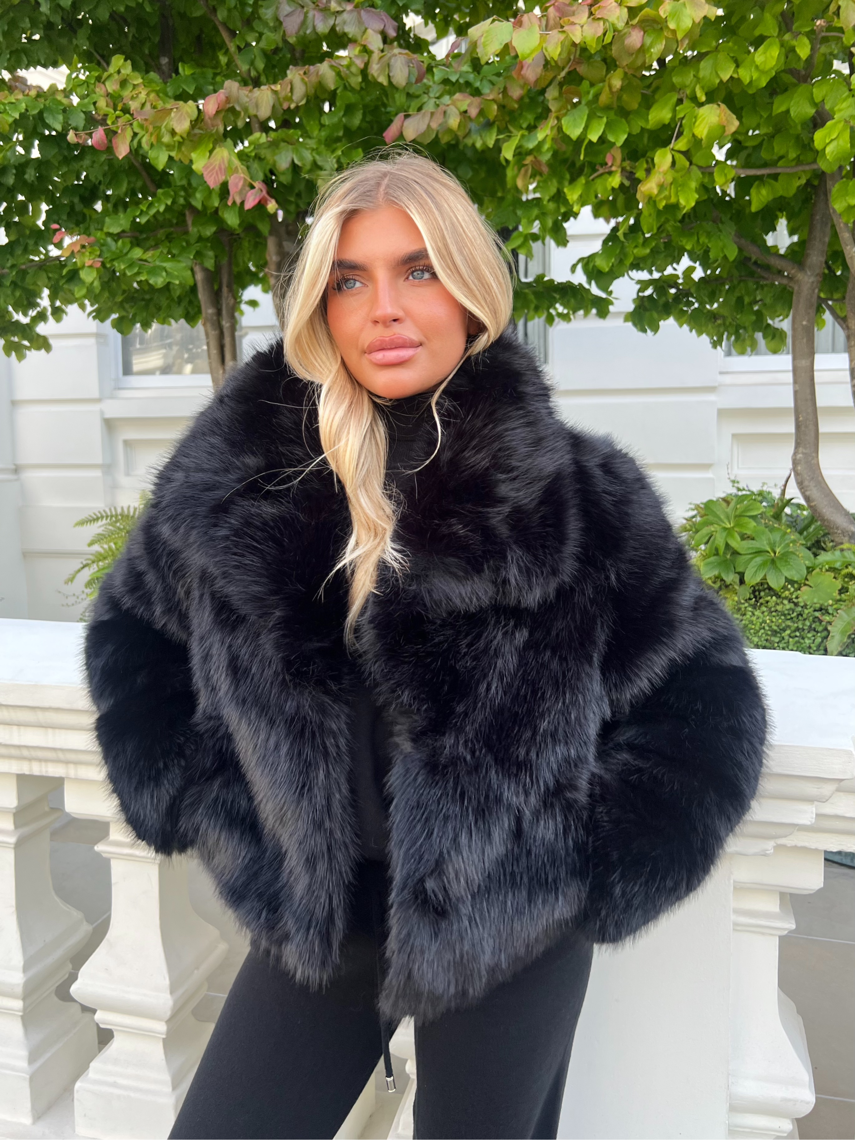 Expertly crafted with a large, luxurious collar and long sleeves for warmth and style. Made from premium faux fur, this elegant jacket is both fashionable and functional. Fastens securely with a hook and eye closure. Stay stylish and cozy this season with our Premium Faux Fur Collared Jacket.