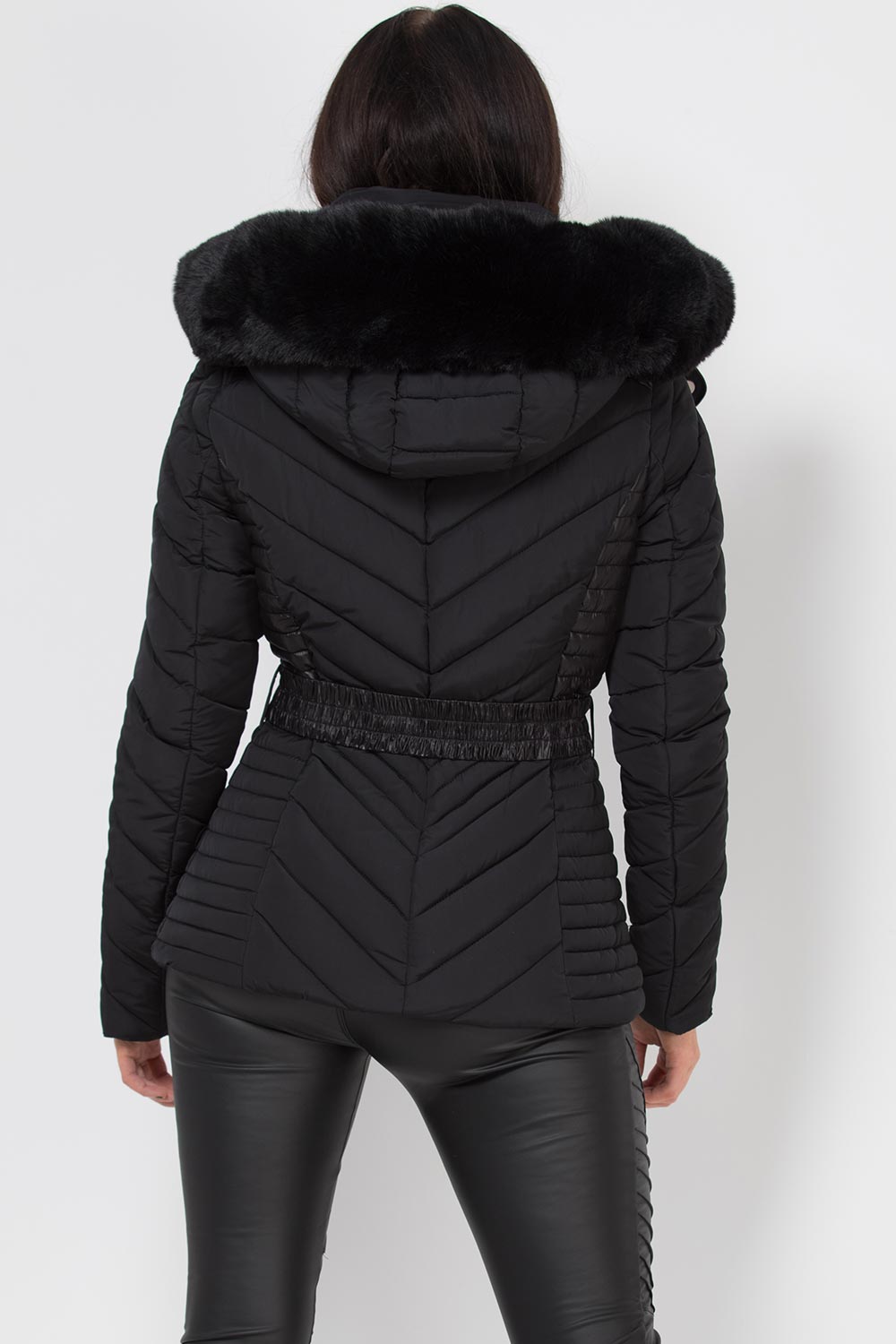 Puffer jacket with faux fur hood and elasticated waist belt. This puffer jacket is a NEED for this new season. Featuring padded puffer jacket, extremely warm with quilted side panel detail, luxury faux fur hood, elasticated waist belt, zip pockets and zip fastening. Also available in other colours.