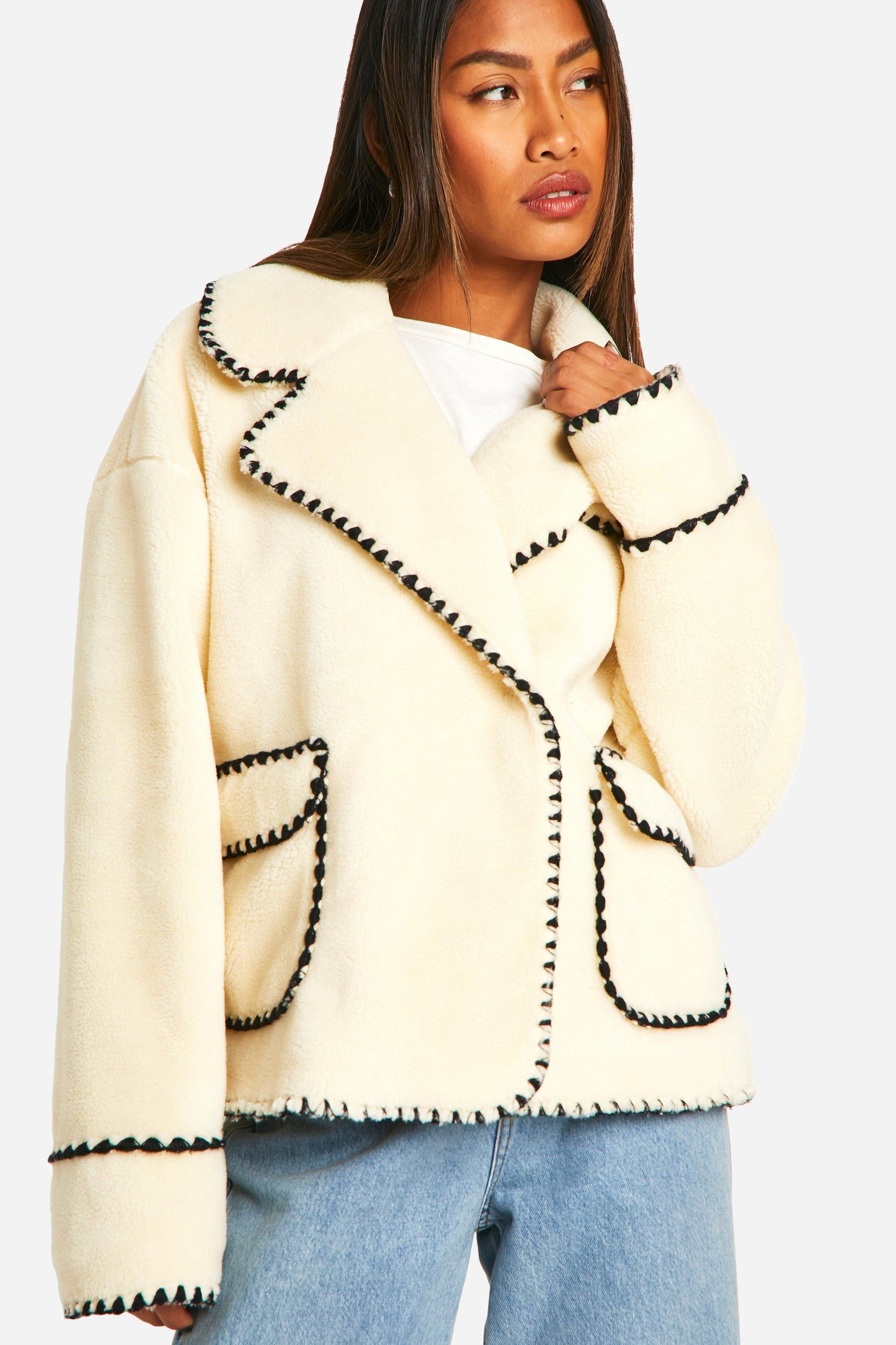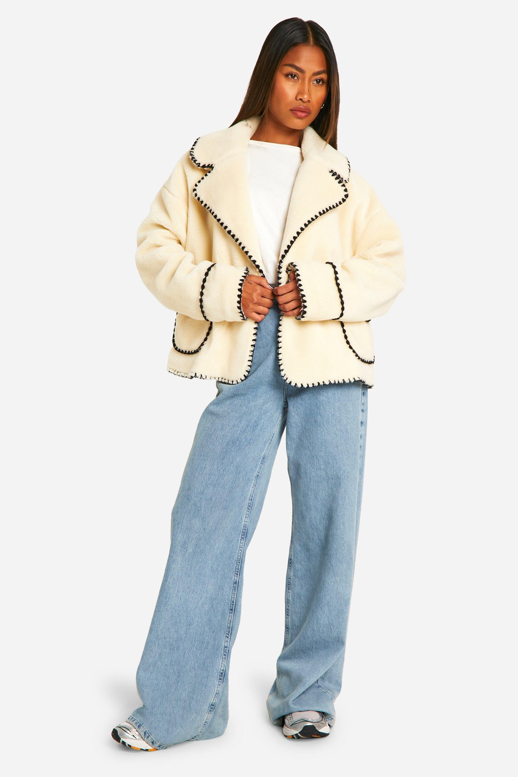 - Embrace the chilly season with this charming teddy jacket that combines warmth and style. The soft borg fabric offers a luxurious feel, while the contrasting whipstitch trim adds a playful, eye-catching detail. Perfect for casual outings, this versatile piece can be styled with wide-leg jeans and trainers for a relaxed daytime look. Layer it over a simple white tee and pair with your favourite denim for an effortless ensemble that's ideal for coffee dates or weekend shopping trips. For a cosier evening option, throw it on over a knit dress with ankle boots. This Boohoo jacket is a must-have addition to your autumn-winter wardrobe, offering both comfort and trendy appeal for the fashion-forward woman who values both style and practicality.
