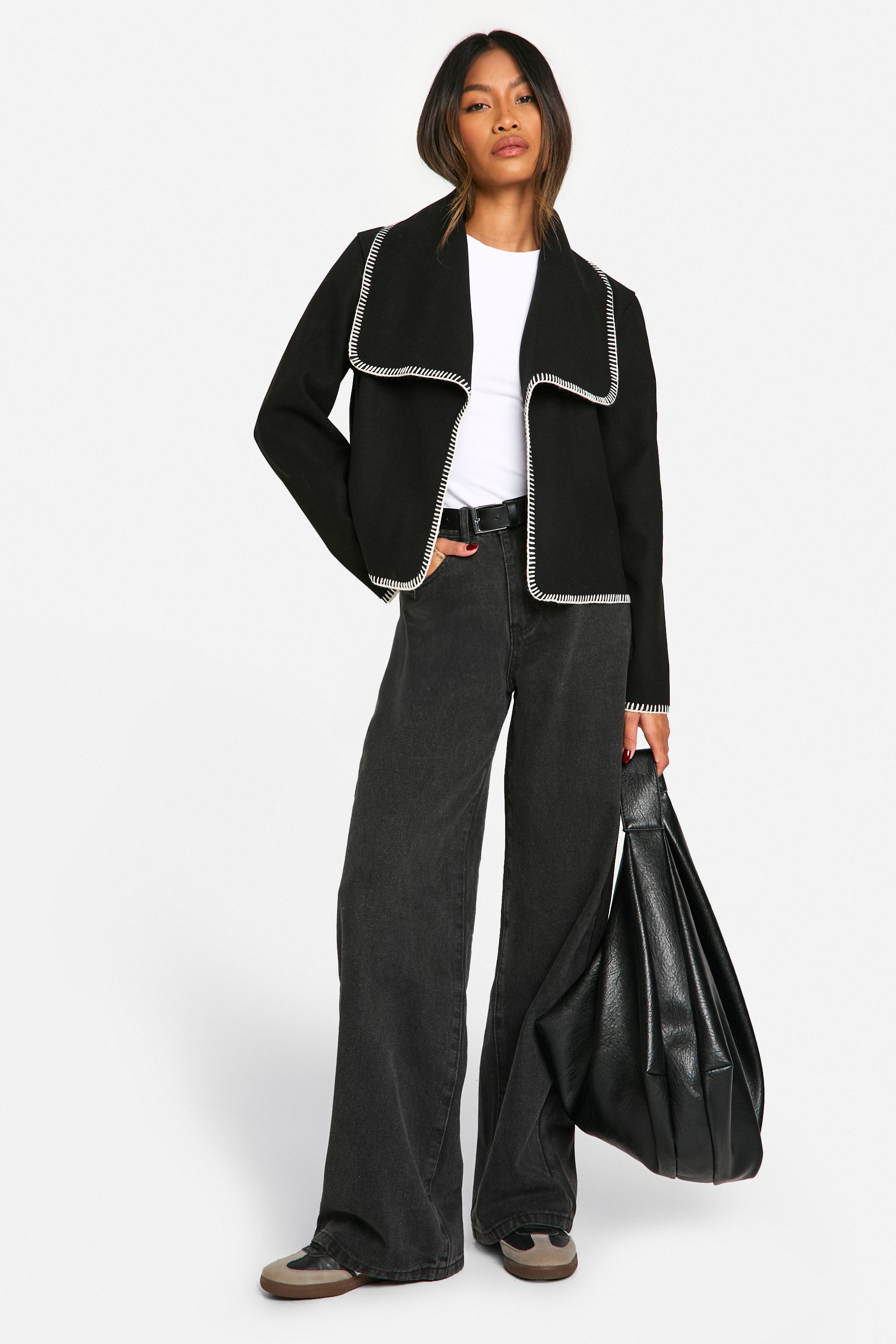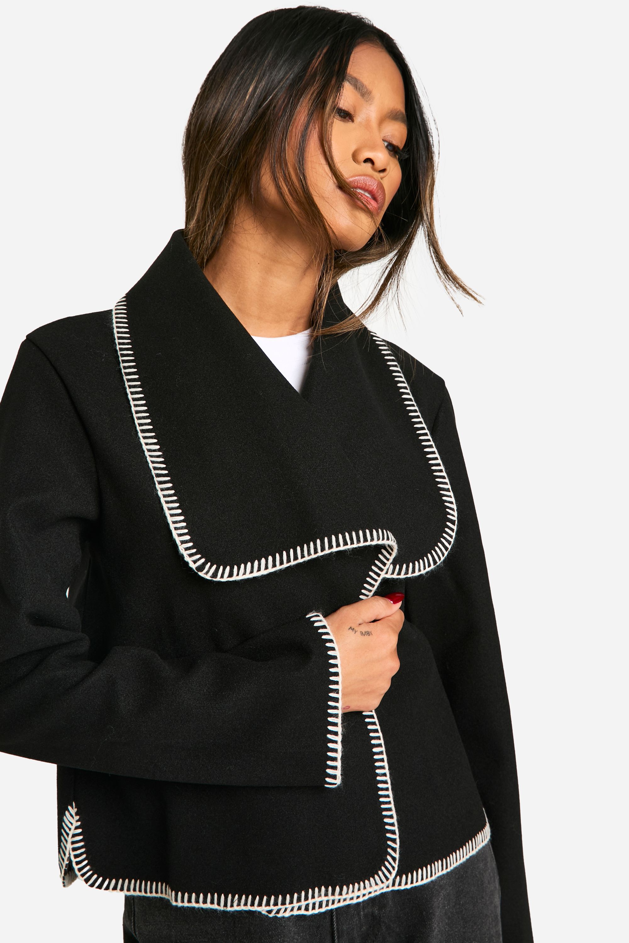 - Open front style for effortless layering This eye-catching jacket in wool-look fabric is the perfect addition to your autumn wardrobe. The distinctive waterfall collar creates a fluid, feminine line that drapes beautifully, while the boxy fit ensures comfort and ease of movement. Style it over a crisp white tee and wide-leg trousers for a chic daytime look, or throw it on over a sleek dress for evening drinks. The versatile design makes it ideal for family gatherings or casual outings with friends. For a more polished ensemble, cinch the waist with a statement belt and pair with ankle boots. The contrasting whipstitch trim adds a touch of artisanal flair, making this jacket a standout piece that will turn heads wherever you go. Embrace the cooler weather in style with this must-have jacket that effortlessly combines comfort and fashion-forward design.