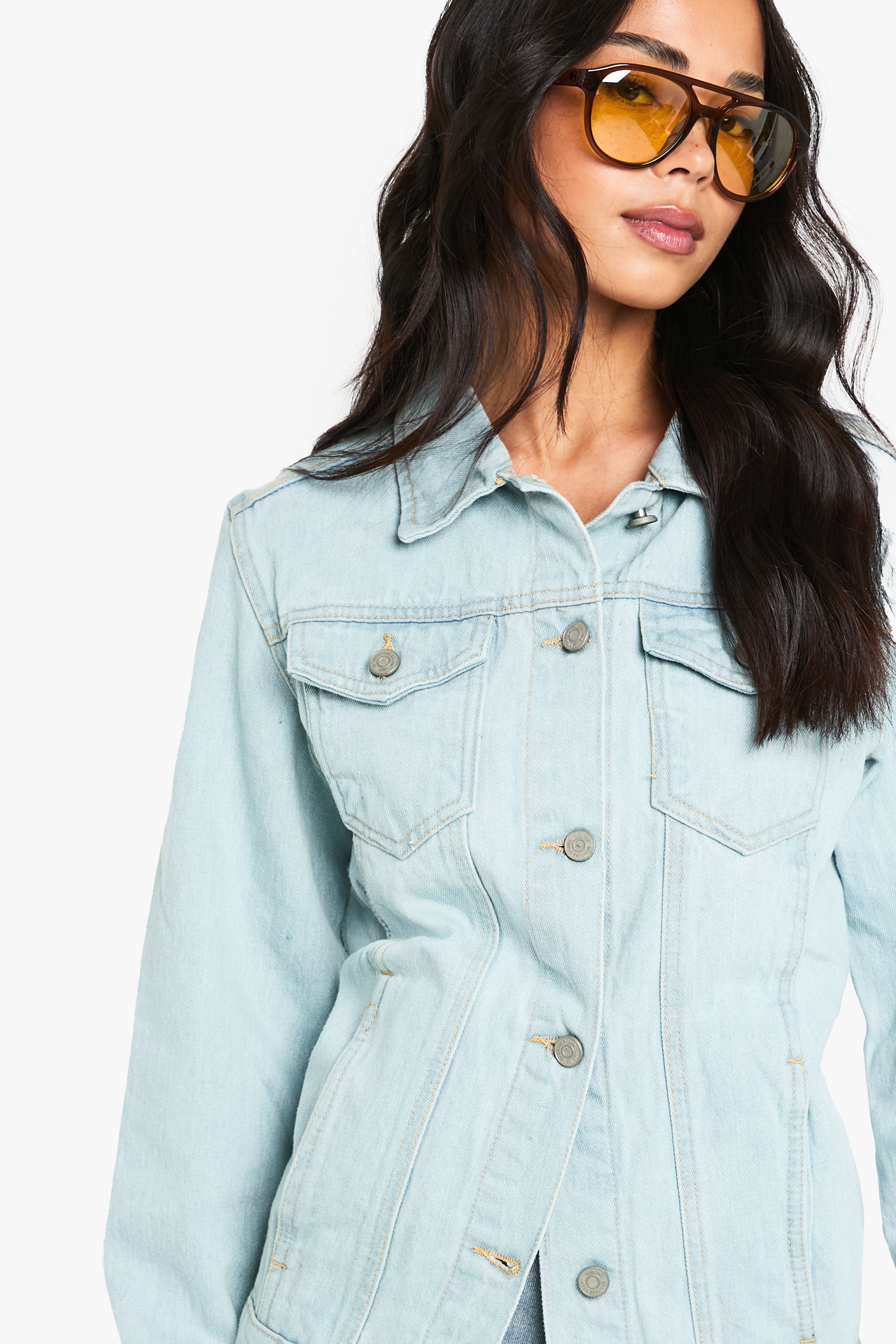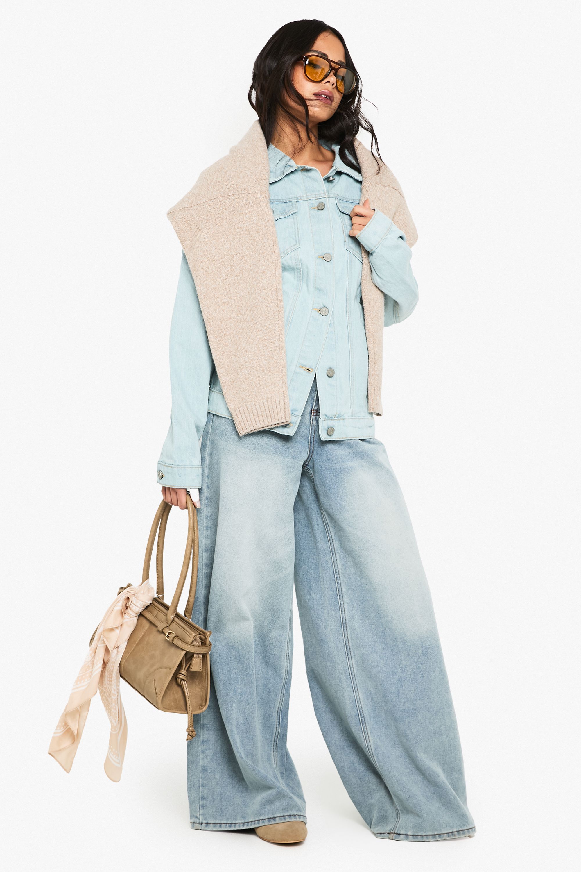 - This bleached oversized denim jacket from Boohoo delivers the perfect balance of casual cool and practical style. The relaxed silhouette creates a contemporary look that pairs brilliantly with wide-leg jeans for an on-trend double denim ensemble, as shown by our model. Layer over a simple tee for daytime outings or throw on over a casual dress for evening gatherings. The versatile nature of this jacket makes it ideal for family barbecues, weekend shopping trips, or casual coffee dates with mates. For cooler days, style with a cosy jumper underneath or add a scarf for extra warmth. The classic design ensures this piece will remain a wardrobe staple for seasons to come, easily transitioning between spring, summer and autumn wear. Machine washable for fuss-free care, this jacket combines effortless style with everyday practicality.