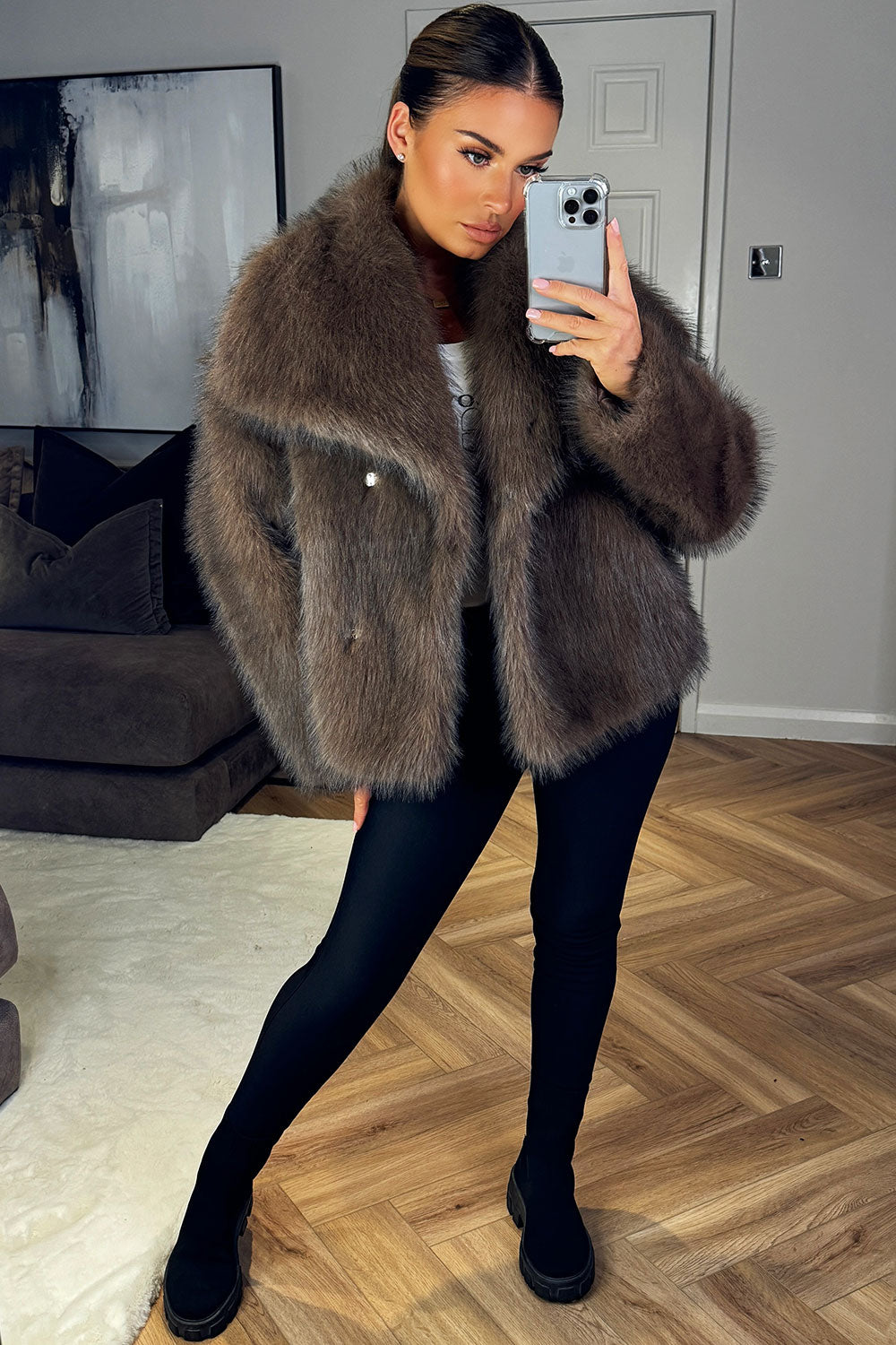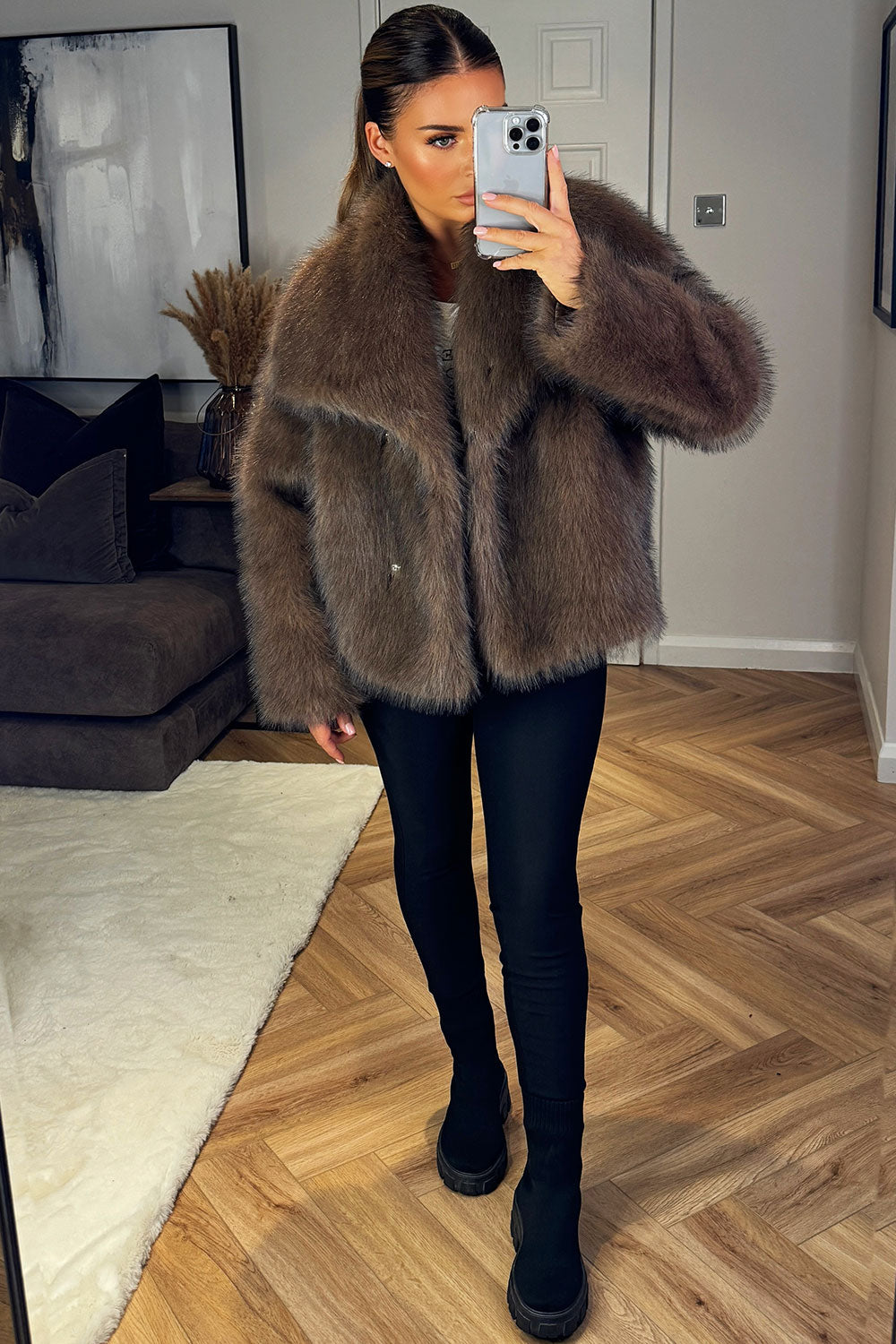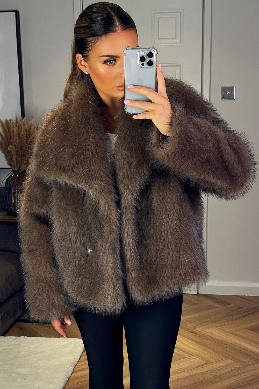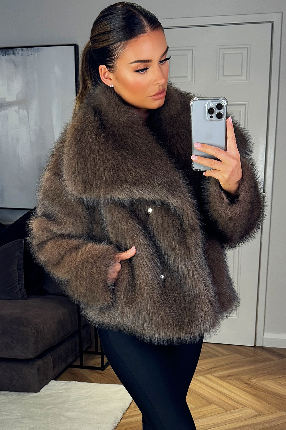 Faux fur short plush jacket. This faux fur jacket is going to take your outerwear collection to the next level. Featuring short plush faux fur jacket with lapel collar button fastening pockets really cosy soft and premium quality. This faux fur jacket is must have to complete any new season outfit. This faux fur short plush jacket is also available in other colours.