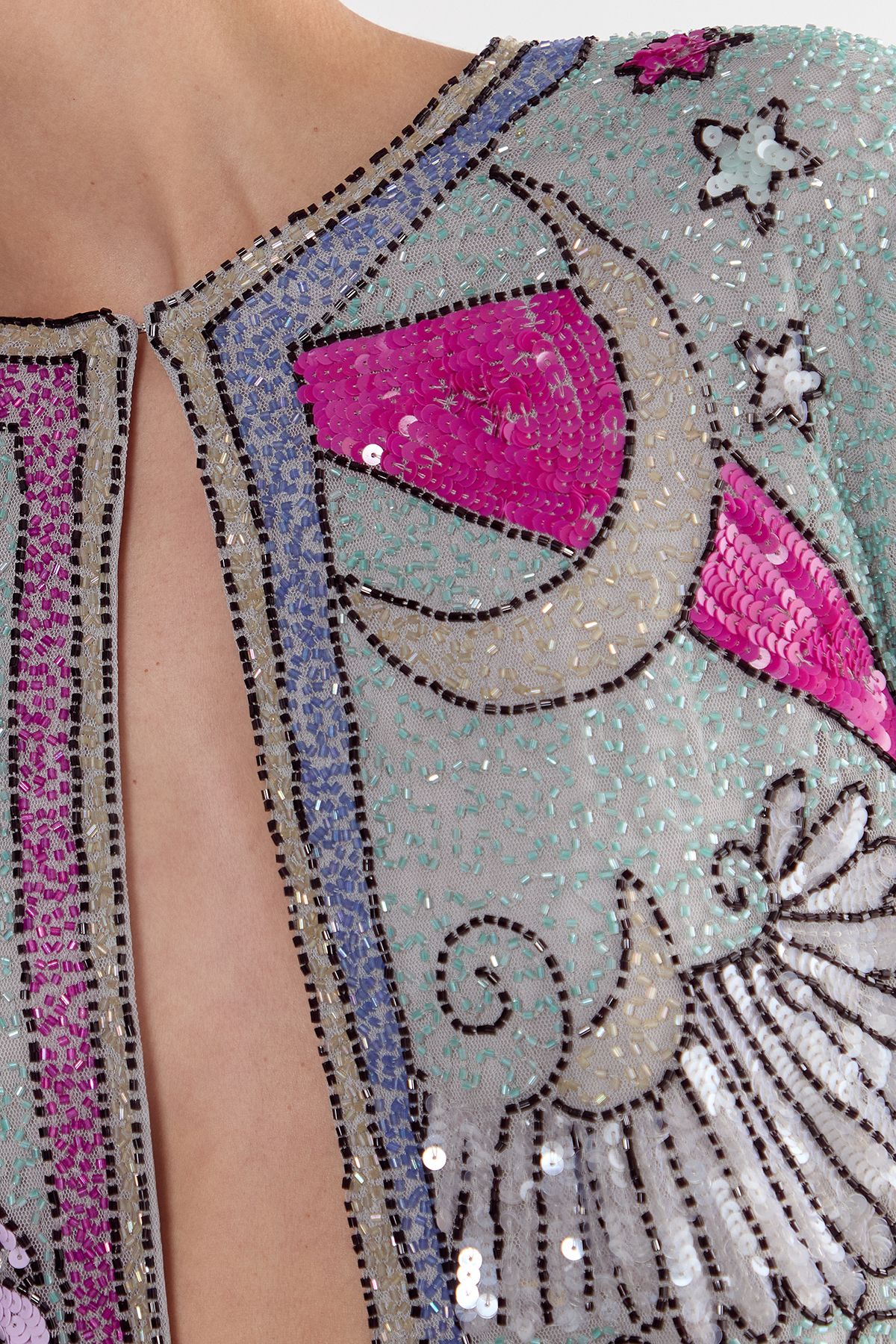 - Make a stellar impression with this eye-catching Celestial Placement Beaded Jacket from Nasty Gal. The dazzling sequin embellishment creates a mesmerising effect that captures light beautifully as you move through the venue. Style with high-waisted denim shorts and knee-high boots for an edgy night-out look, or pair with a simple slip dress to let the jacket take centre stage. The cropped length works wonderfully with higher waistlines, while the open front design allows for versatile styling options. Perfect for club nights, cocktail parties or special evening events where you want to stand out from the crowd. This statement piece requires minimal accessorising - simply add some delicate jewellery and a small clutch to complete your look. The jacket's unique celestial pattern ensures you'll shine bright all night long.