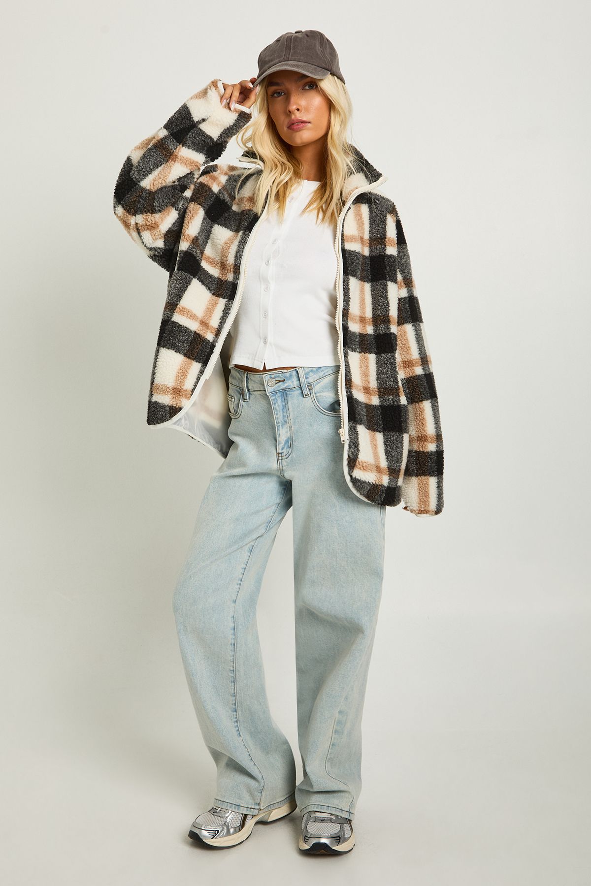 • Make a statement in this bold check oversized teddy jacket that combines comfort with on-trend style. The relaxed silhouette offers ample room for layering over jumpers and tees, while the full-length zip allows for versatile styling options. As seen on our model, pair with light wash wide-leg jeans and a simple white tee for an effortlessly cool weekend look, or throw over a hoodie with trainers for coffee runs and casual gatherings. The textured teddy fabric provides welcome warmth for chilly autumn days, making this the perfect companion for outdoor events, family gatherings, or casual meet-ups with friends. Complete the look with a cap and minimal accessories for an understated yet fashionable ensemble that works for daytime errands or laid-back evenings. This Boohoo jacket embodies casual cool with its contemporary oversized proportions and distinctive check pattern.