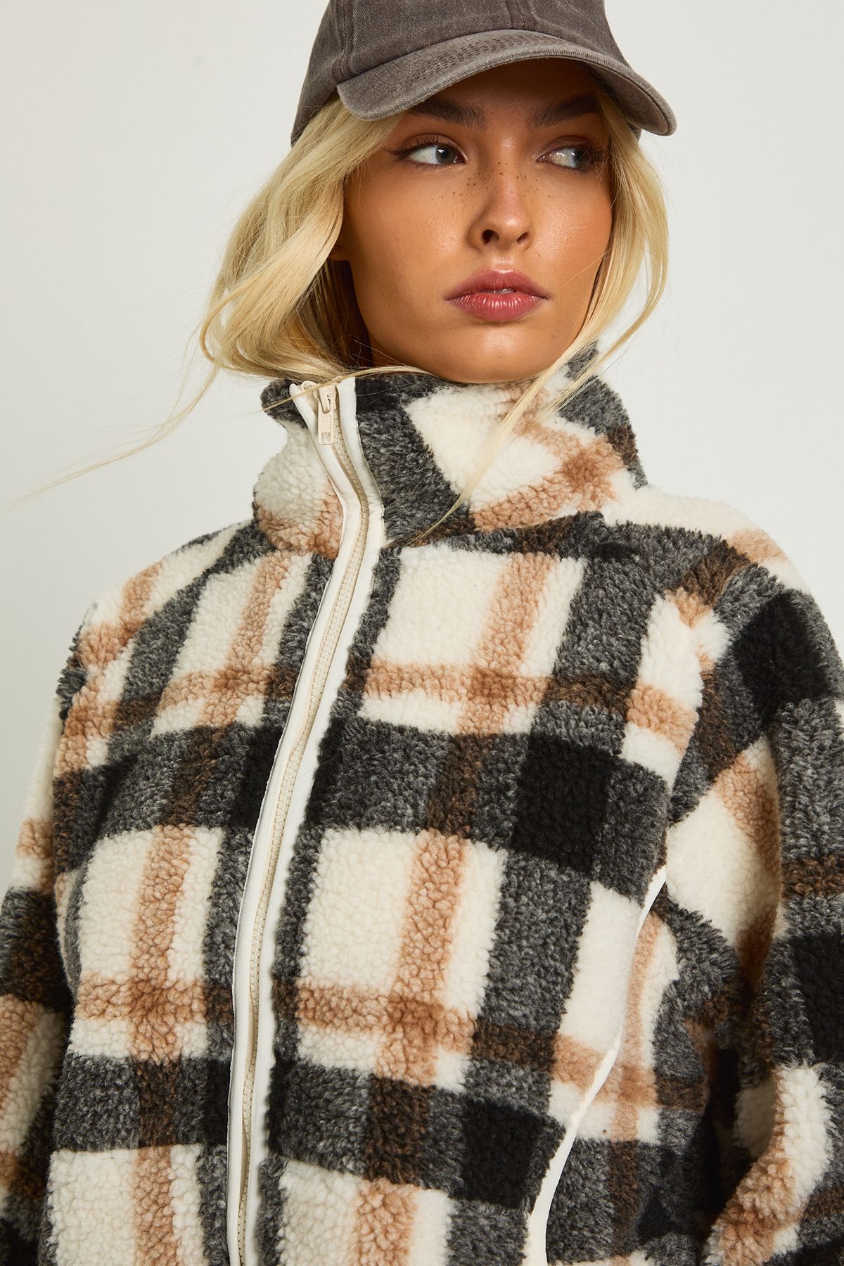 • Oversized teddy jacket featuring a striking check pattern for standout style