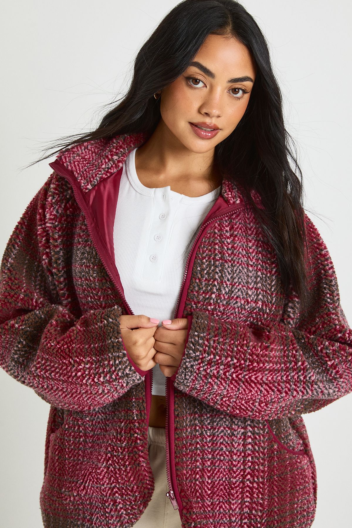 - Textured teddy fabric adds dimension and interest to this seasonal staple Make a statement in this eye-catching check oversized teddy zip-up jacket from Boohoo. The generous proportions create a relaxed silhouette that's perfect for layering over your favourite casual outfits. As seen on our model, pair with wide-leg trousers and a simple white top for an effortlessly chic daytime look. The textured teddy fabric adds warmth and comfort, making this jacket ideal for autumn strolls or casual weekend brunches. The full-length zip allows for styling flexibility - wear fully zipped for maximum cosiness or open to showcase your outfit beneath. This versatile piece transitions seamlessly from family gatherings to coffee dates with friends, offering both style and practicality. Add trainers and a crossbody bag to complete your laid-back ensemble.