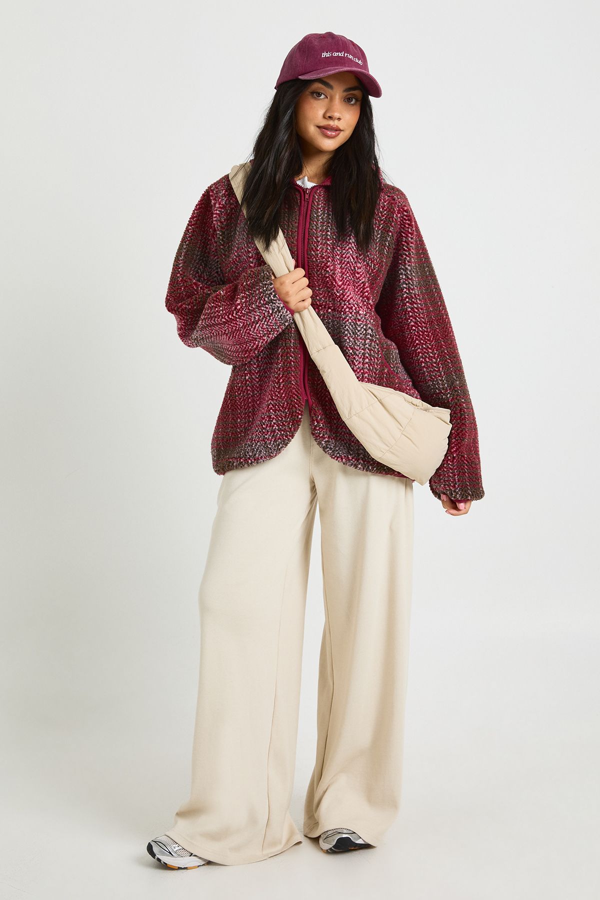 - Make a statement in this eye-catching check oversized teddy zip-up jacket from Boohoo. The generous proportions create a relaxed silhouette that's perfect for layering over your favourite casual outfits. As seen on our model, pair with wide-leg trousers and a simple white top for an effortlessly chic daytime look. The textured teddy fabric adds warmth and comfort, making this jacket ideal for autumn strolls or casual weekend brunches. The full-length zip allows for styling flexibility - wear fully zipped for maximum cosiness or open to showcase your outfit beneath. This versatile piece transitions seamlessly from family gatherings to coffee dates with friends, offering both style and practicality. Add trainers and a crossbody bag to complete your laid-back ensemble.