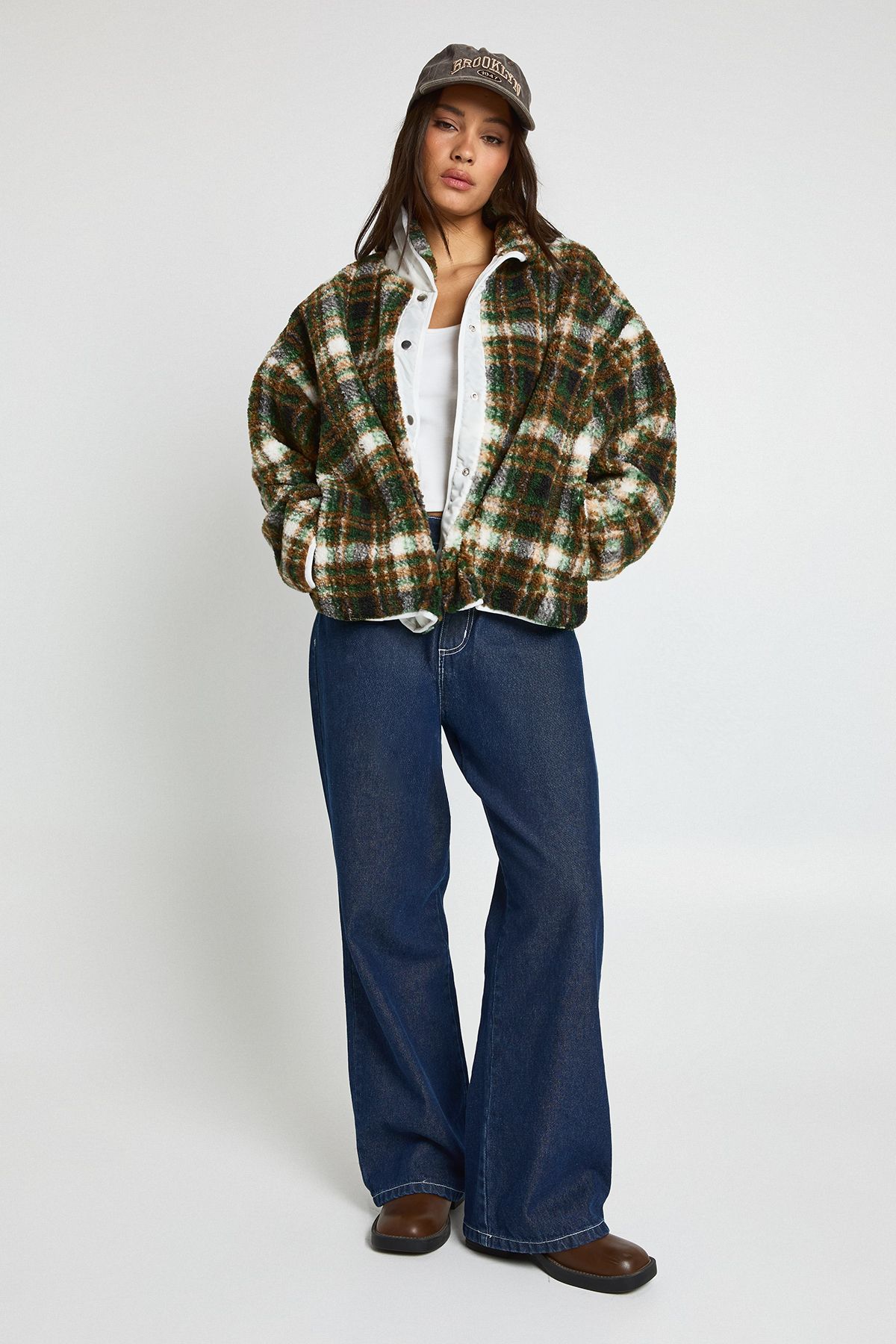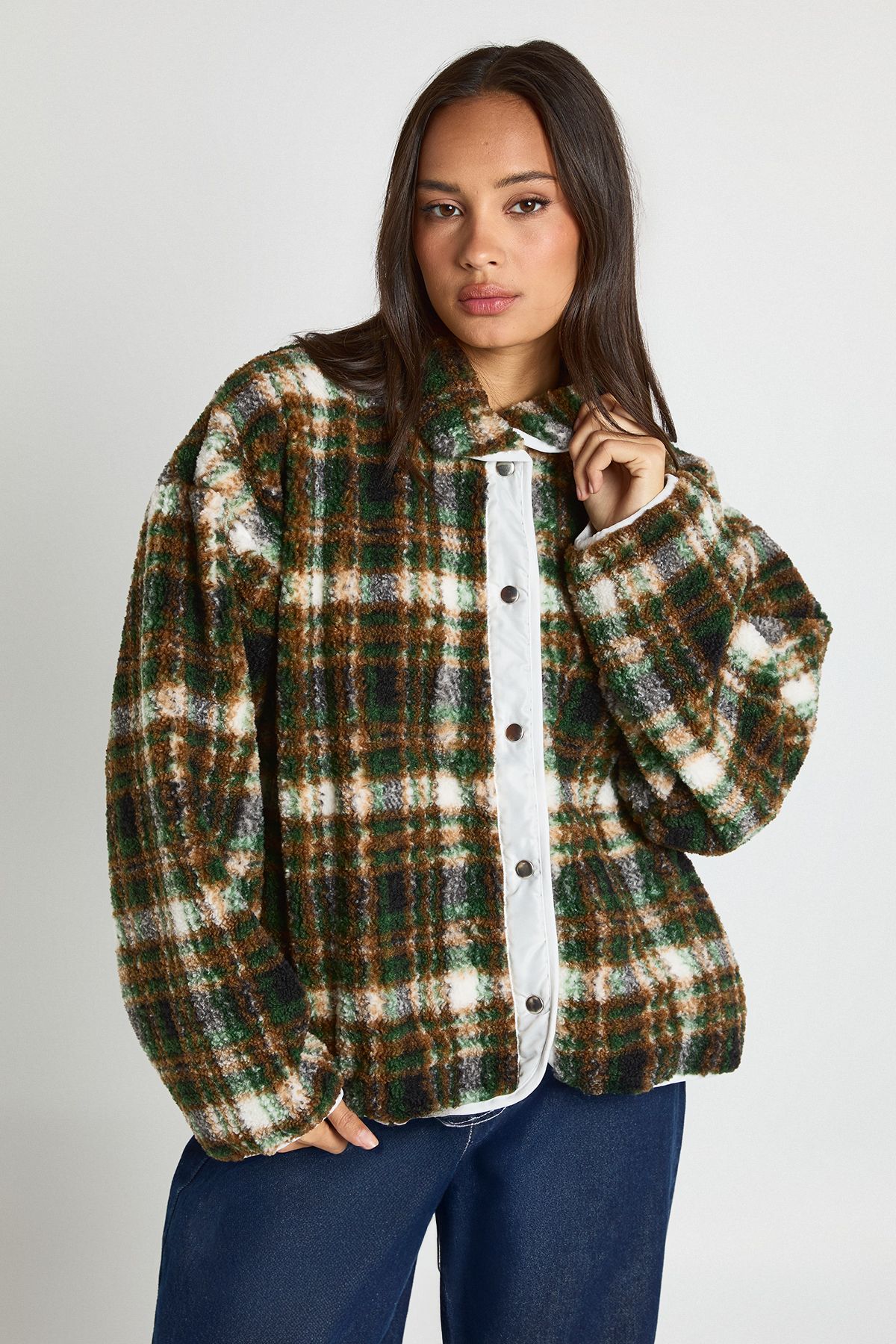 • Make a statement in this eye-catching Check Print Boxy Teddy Jacket that combines comfort with contemporary style. The oversized, boxy cut creates a relaxed silhouette that's perfect for layering, while the plush teddy texture adds a cosy element to your autumn and winter wardrobe. Style it as seen with a simple white crop top and wide-leg jeans for an effortlessly cool weekend look, or throw it over a casual dress with trainers for brunch with the girls. The versatile check pattern works brilliantly for family gatherings or casual coffee dates, and the practical button fastening means you can adapt your look to the weather. Complete the outfit with a cap and minimal jewellery for that laid-back, fashion-forward vibe that Boohoo is known for. This jacket is the perfect addition to your casual collection, offering both style and practicality for the fashion-conscious woman.