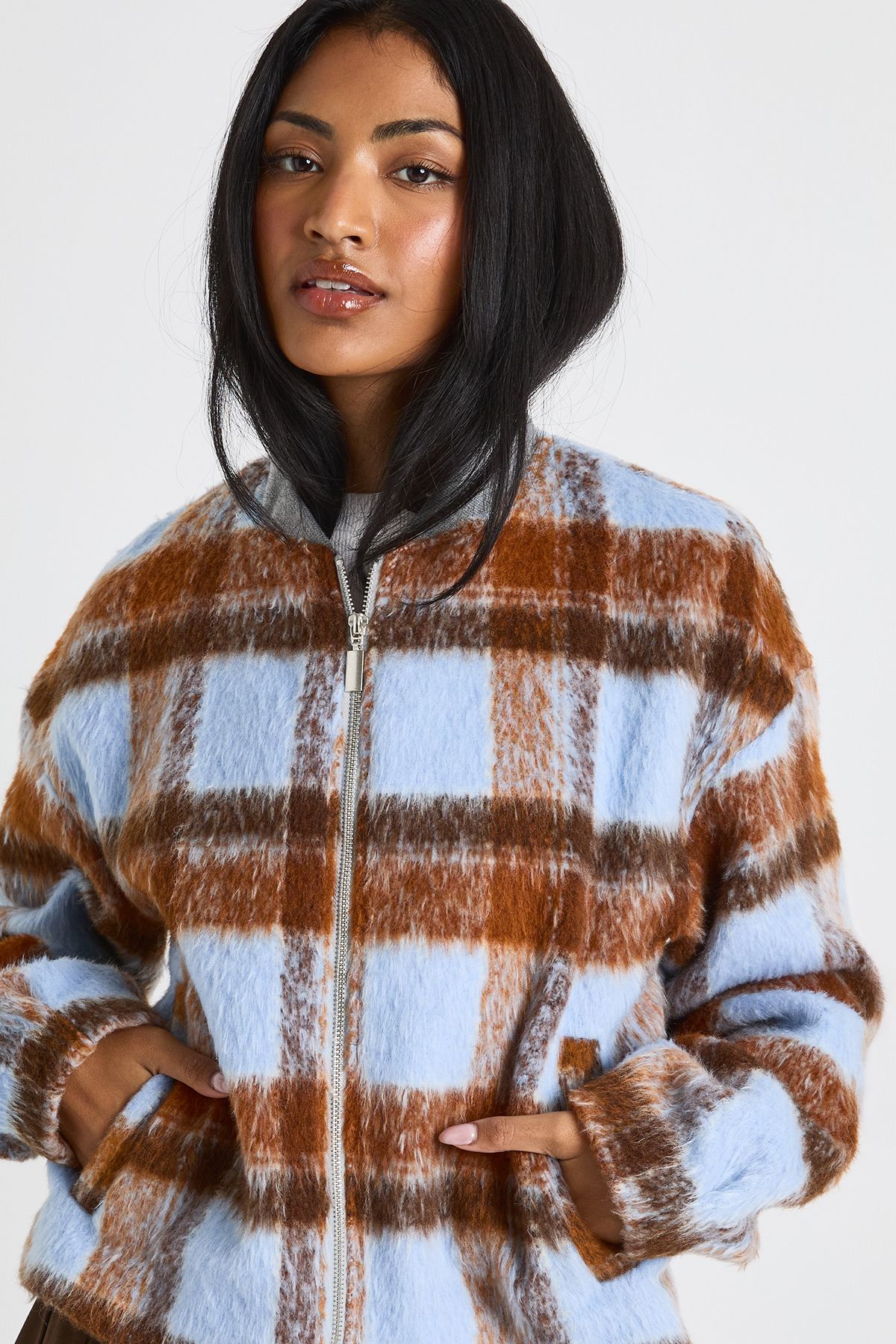- Striking check pattern bomber jacket with wool-look texture for added warmth