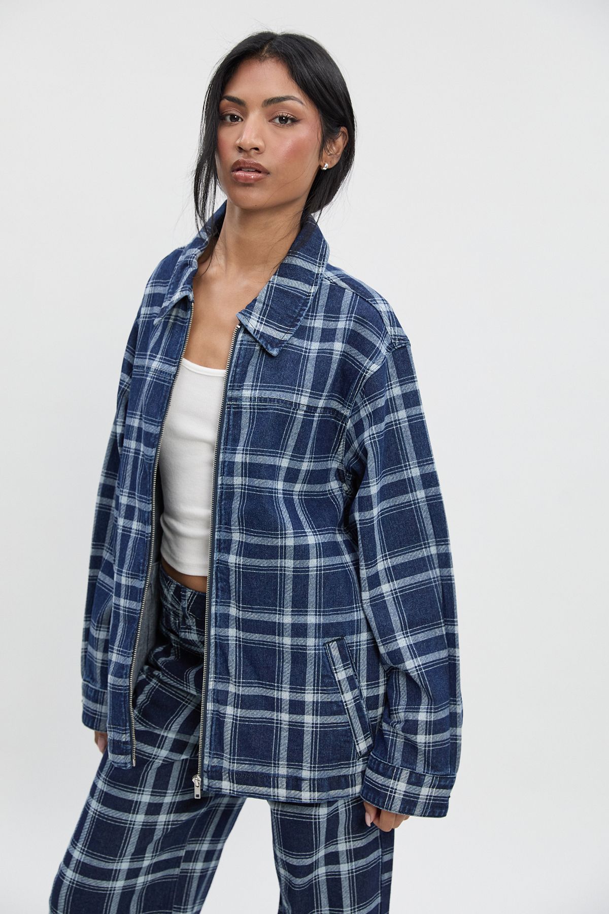- Make a statement with this bold checked denim jacket, the perfect centrepiece for your casual wardrobe. The relaxed fit creates an effortlessly cool silhouette that works brilliantly layered over basics. Style as seen with the matching checked trousers and a simple crop top for a coordinated set that captures this season's trend for matching separates. For everyday wear, pair with your favourite jeans and trainers for an easy weekend look, or throw over a simple dress to add edge to your outfit. This versatile piece transitions seamlessly from daytime coffee dates to casual evening gatherings with friends. The denim construction ensures durability while maintaining a soft feel, making this jacket a reliable staple for your year-round casual collection.