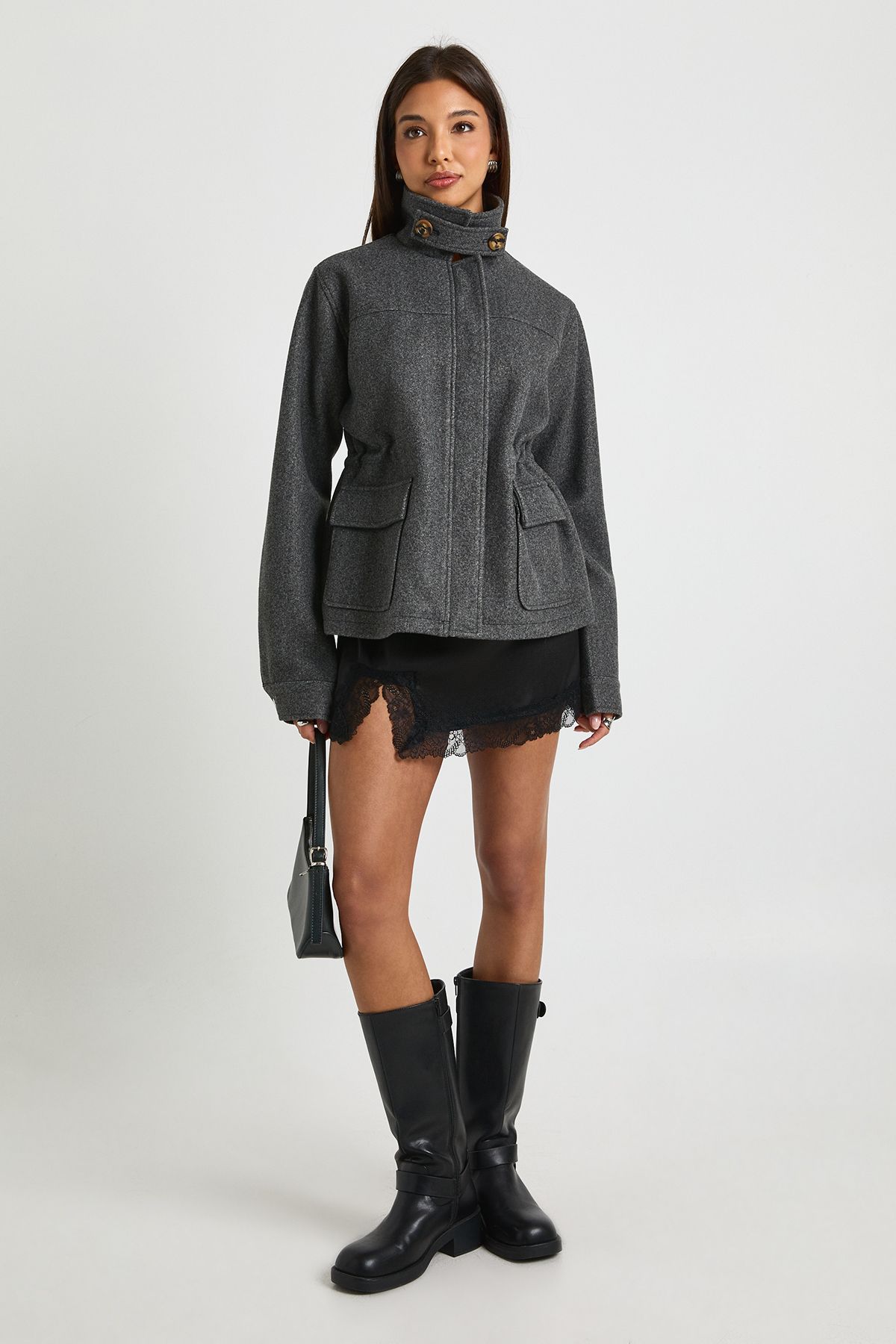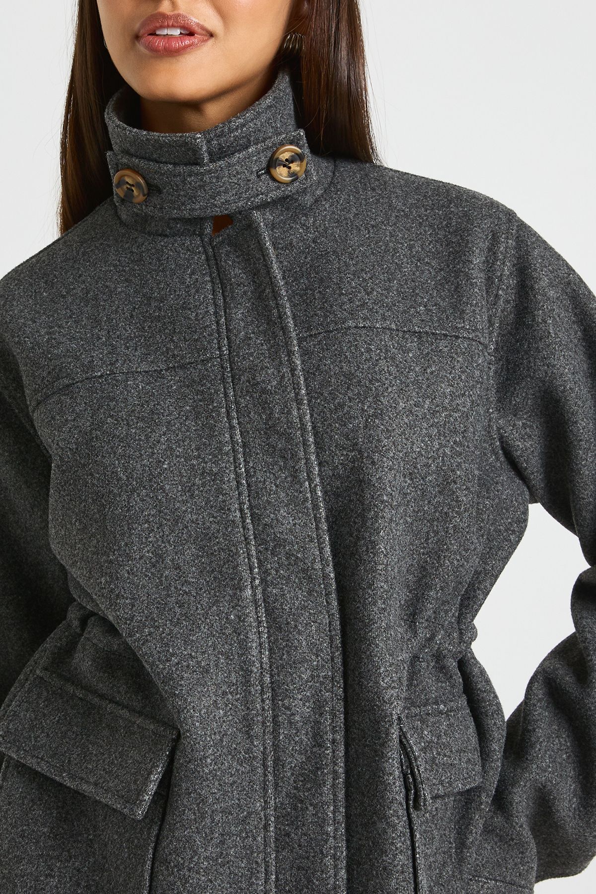 - This Cinched Wool Look Jacket combines practicality with contemporary style for your casual wardrobe. The defined waistline creates a feminine shape while maintaining a relaxed feel, making it ideal for everyday wear. Style with a lace-trimmed mini skirt and knee-high boots for an on-trend daytime look, or pair with your favourite jeans and trainers for weekend coffee dates. The structured high neck offers protection against the elements without compromising on style. Perfect for family gatherings or casual outings, this jacket works brilliantly as a transitional piece between seasons. The versatile design allows for easy customisation to suit your personal style - layer over jumpers for added warmth or wear with a simple tee when the weather is milder.