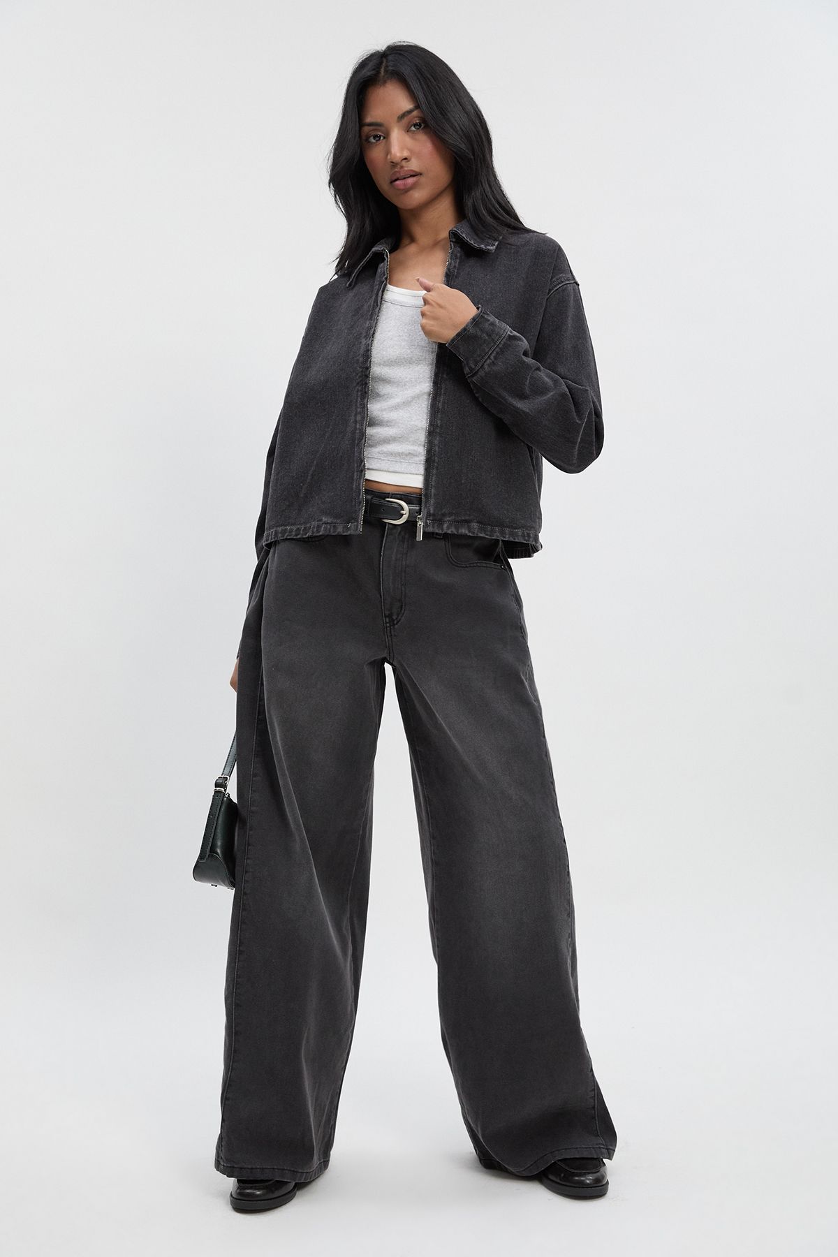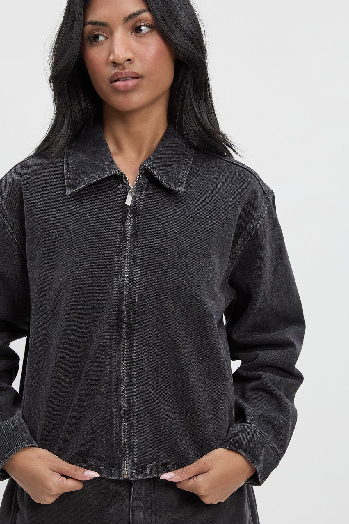 • Long sleeves with buttoned cuffs for adjustable comfort This collared denim jacket is the ultimate casual wardrobe staple that works hard for your everyday style. The cropped, boxy cut creates a contemporary silhouette that pairs brilliantly with high-waisted trousers as shown, or with your favourite A-line skirts and dresses. For daytime outings, layer over a simple white tee with wide-leg jeans and trainers for an effortlessly cool double denim moment. When evening calls, throw it over a fitted midi dress with ankle boots and statement earrings. The versatile zip-front design allows for multiple styling options - wear fully zipped for a more polished look or open to showcase layered pieces underneath. Perfect for unpredictable British weather, this jacket is ideal for family gatherings, weekend brunches, or casual Friday office wear when paired with tailored trousers.