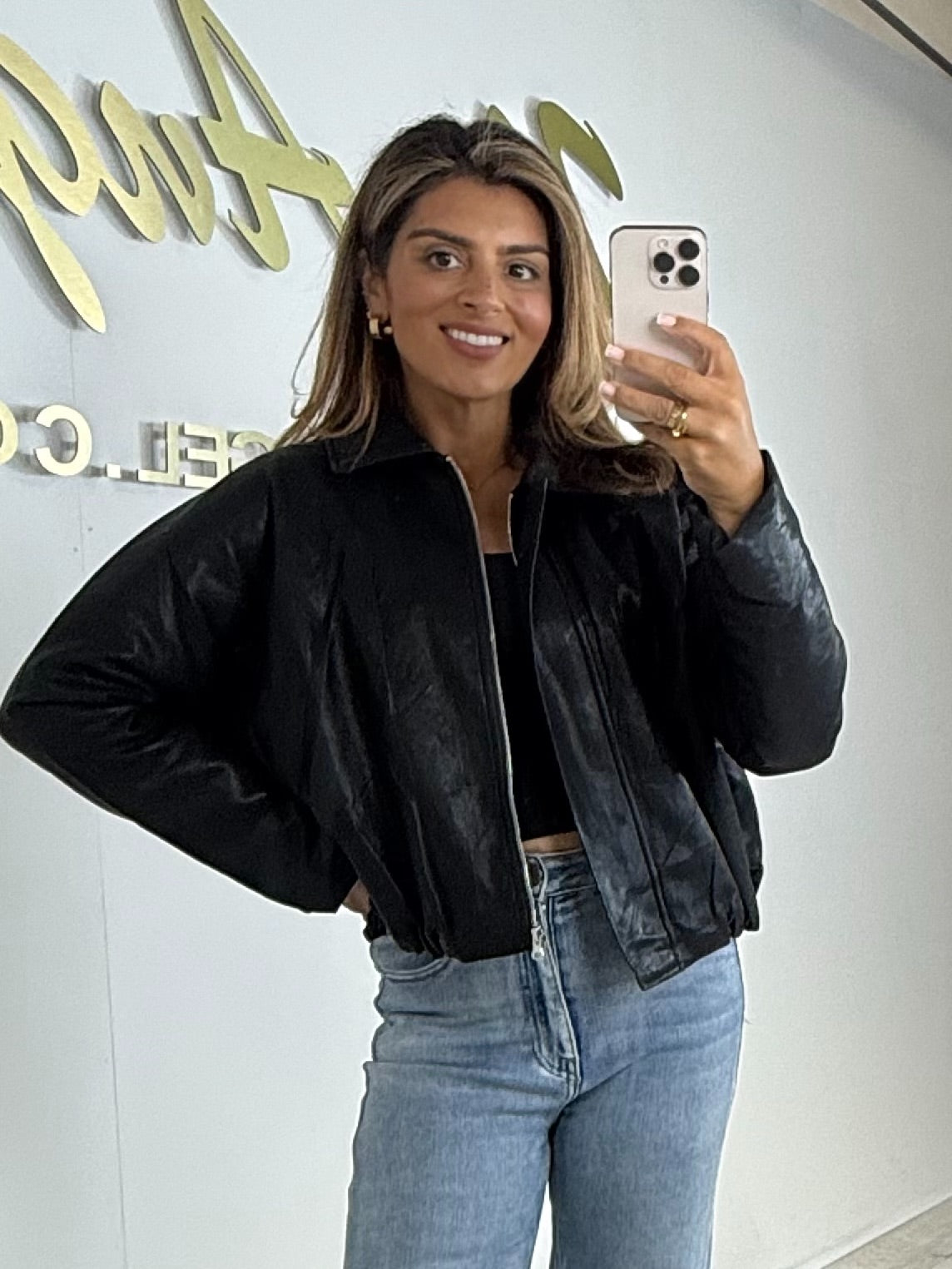 Collared Zip Up Leather Look Bomber Jacket